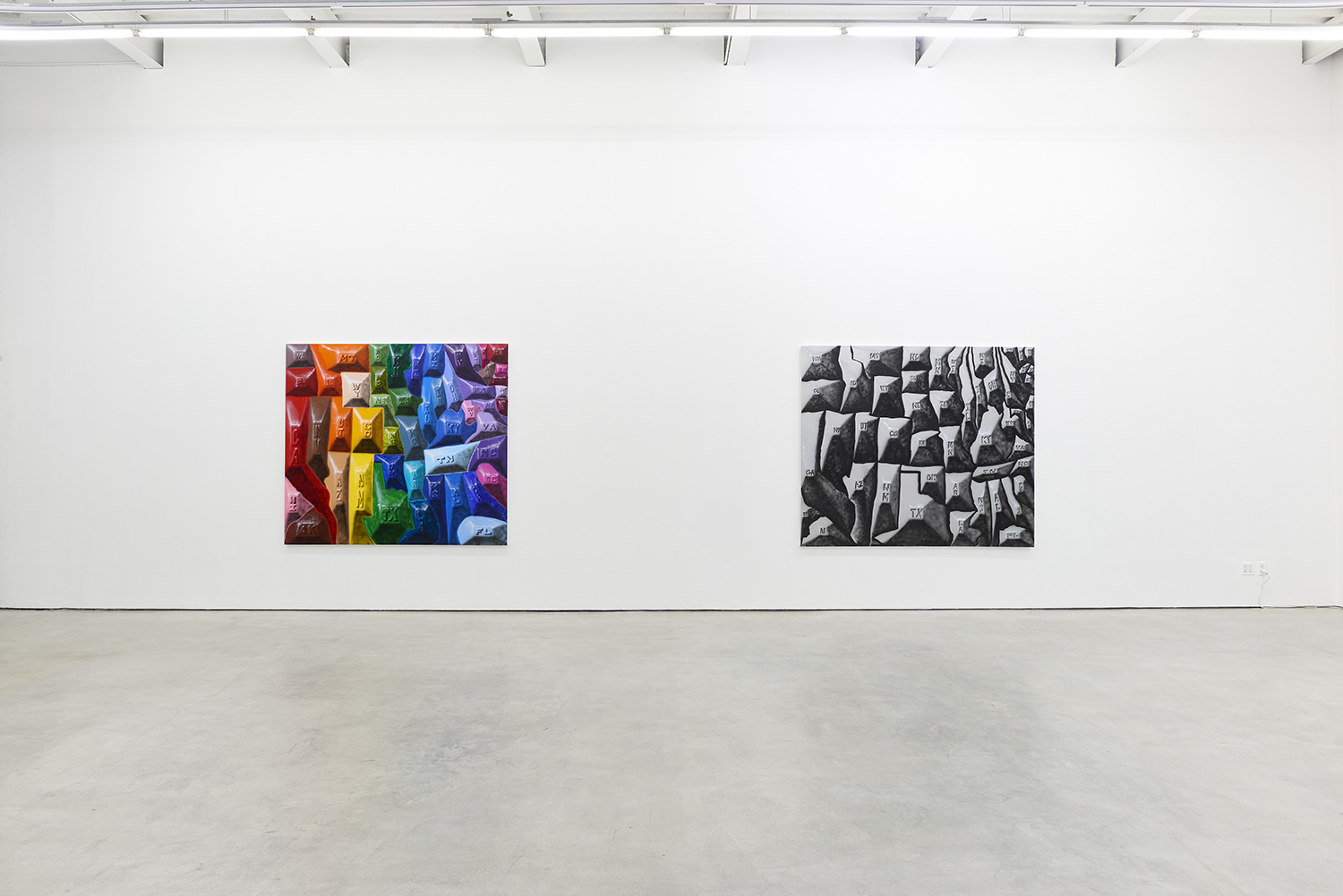 White highlights and dark grey shadows raise tiny pyramidal mountains out of each element, making the painting a very strange topographical map; each state is a mountain (or a valley) unto itself, smushed together like plastic puzzle pieces or hit with the “shrink wrap” filter in old versions of Photoshop. The color choices from afar suggest another layer of imagery, as in the work above titled “A Slice of Watermelon.” The mural presiding over the exhibition has a background of blue and red lines and from afar, the grey states resemble a massive graphite scrawl across a giant wide-ruled sheet of paper.