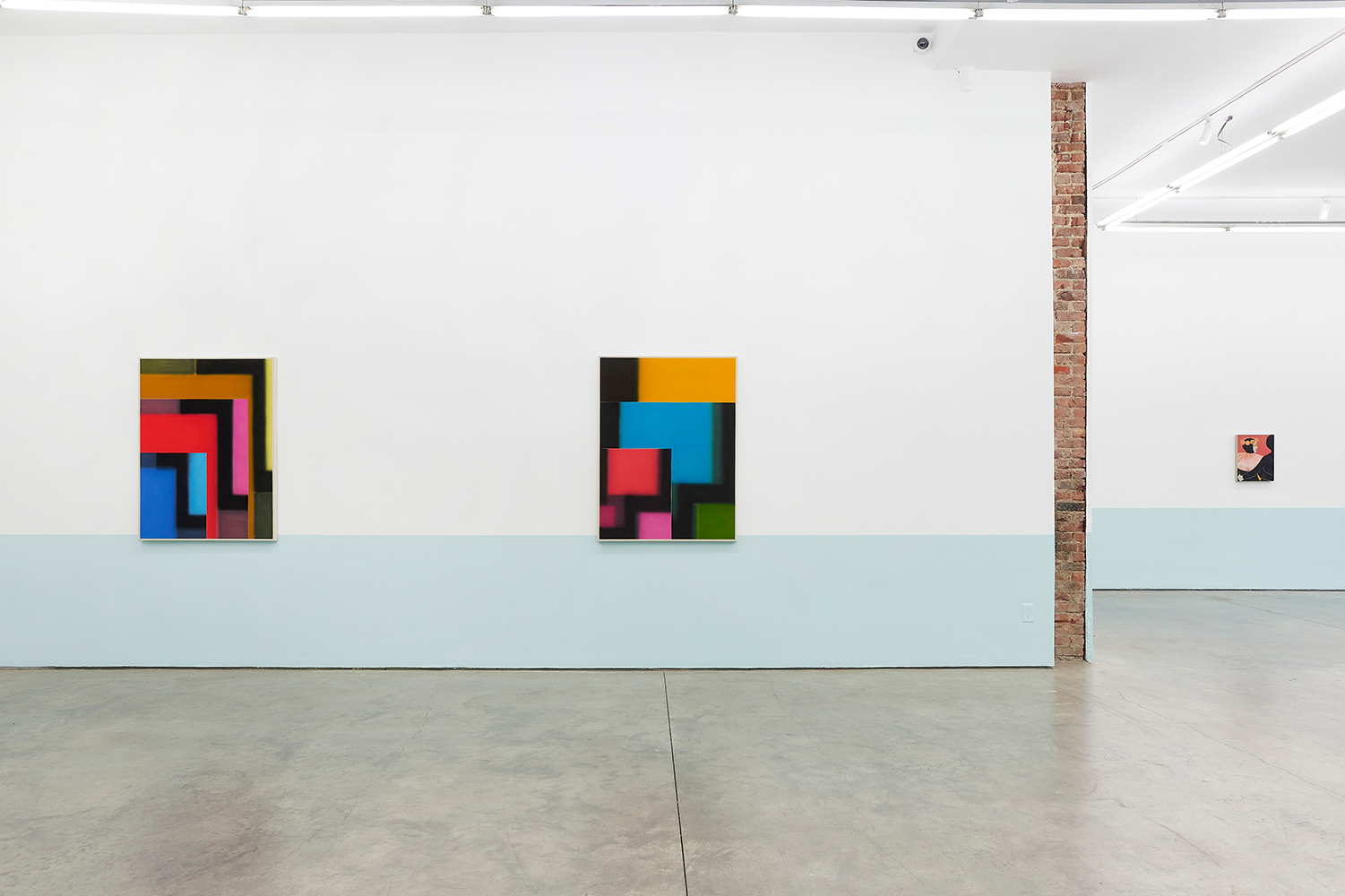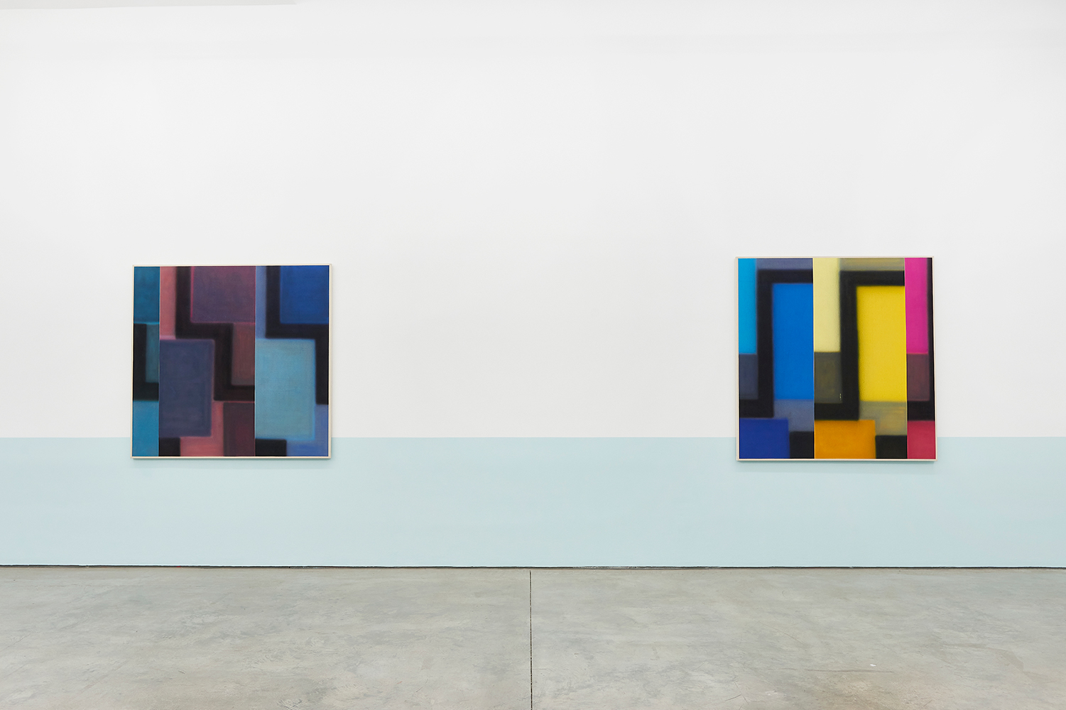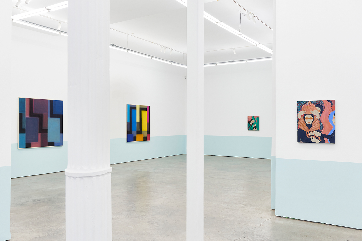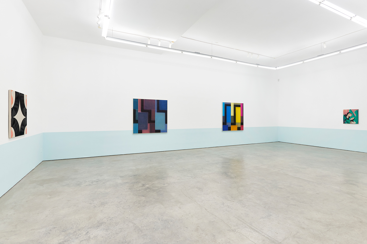 For this exhibition we juxtapose eight new paintings by Canadian artist Kristine Moran with six new acrylic paintings by Brooklyn-based artist Russell Tyler. The repeated geometric shapes across these fourteen paintings resonate in surprising ways, as Moran’s abstracted swimmers splash into the black-edged rectangles of Tyler’s proliferating polygons. Hung in a gallery painted three feet up each wall with aqua blue, the show wades into the territory between figuration and abstraction with interesting results.