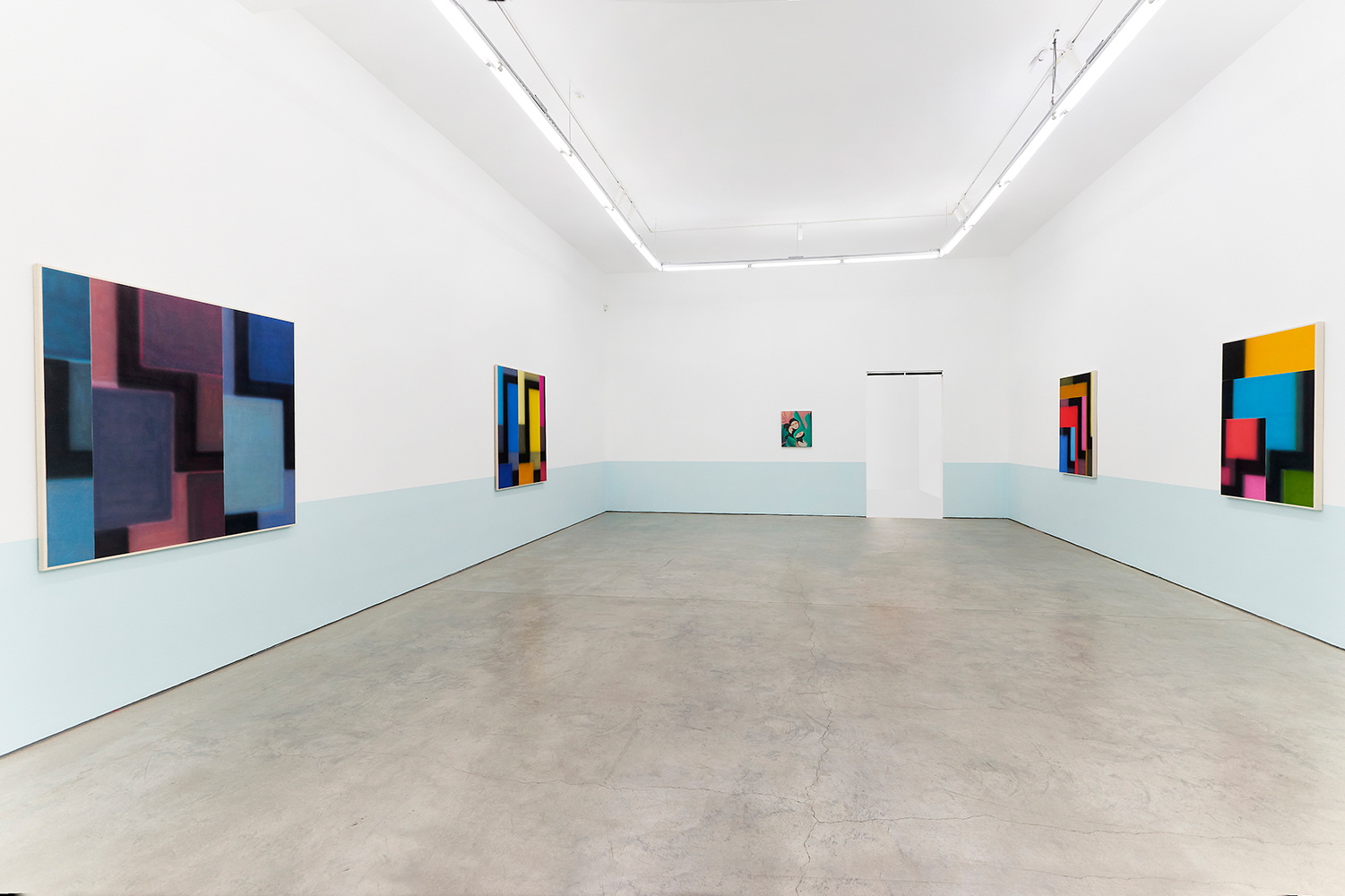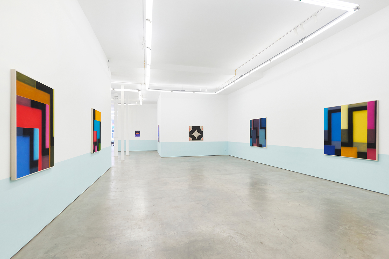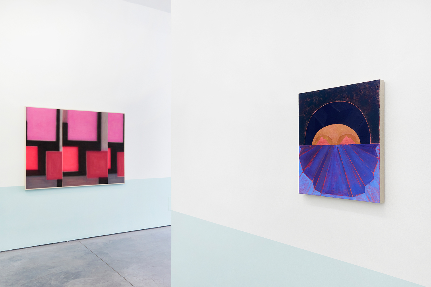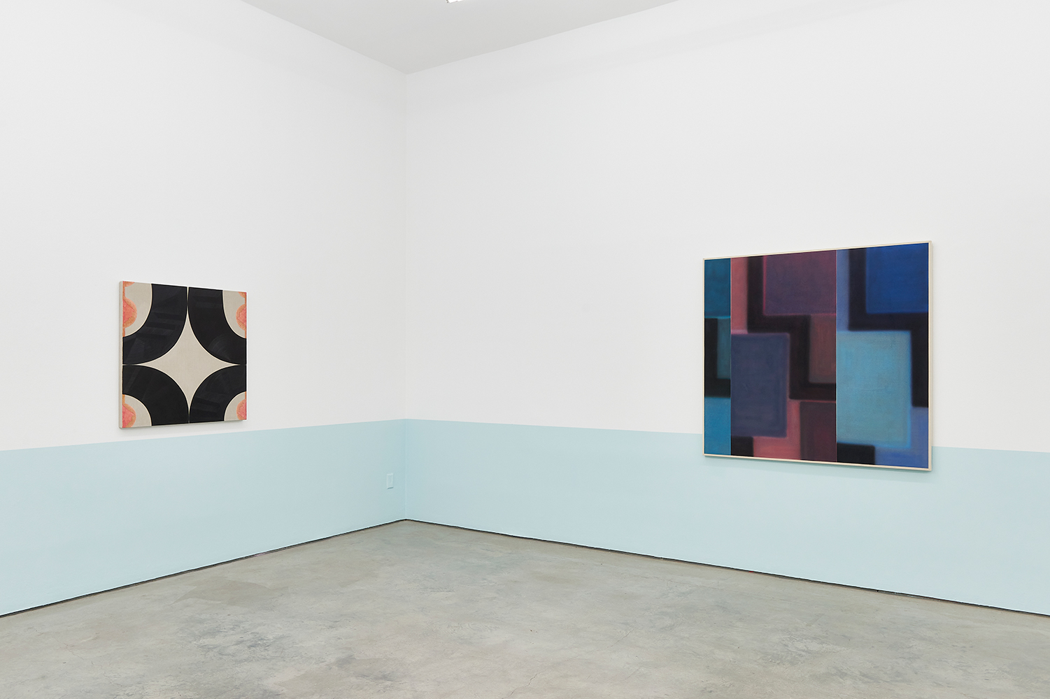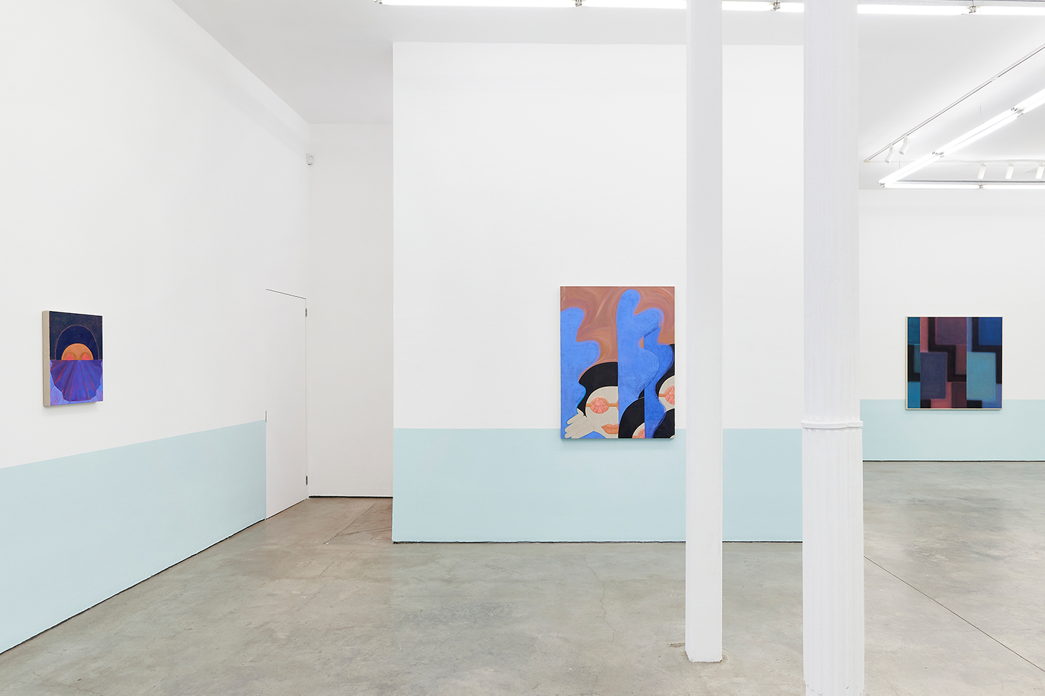 For this exhibition we juxtapose eight new paintings by Canadian artist Kristine Moran with six new acrylic paintings by Brooklyn-based artist Russell Tyler. The repeated geometric shapes across these fourteen paintings resonate in surprising ways, as Moran’s abstracted swimmers splash into the black-edged rectangles of Tyler’s proliferating polygons. Hung in a gallery painted three feet up each wall with aqua blue, the show wades into the territory between figuration and abstraction with interesting results.