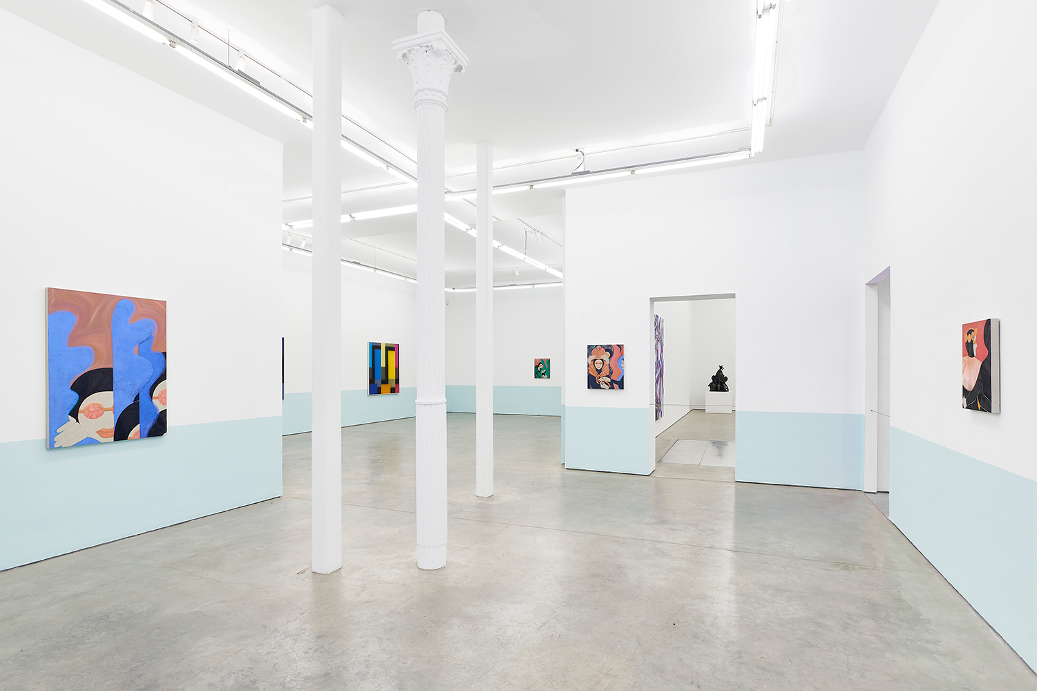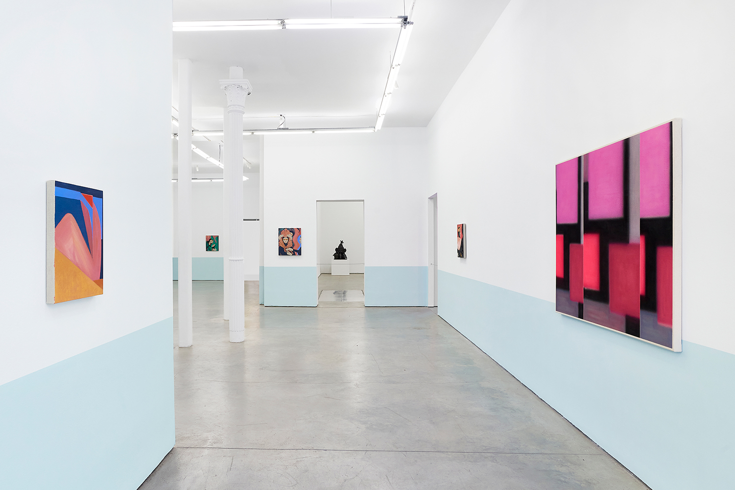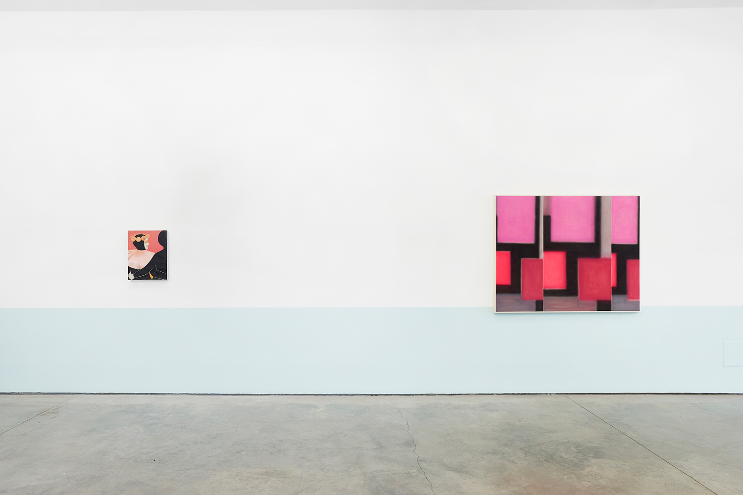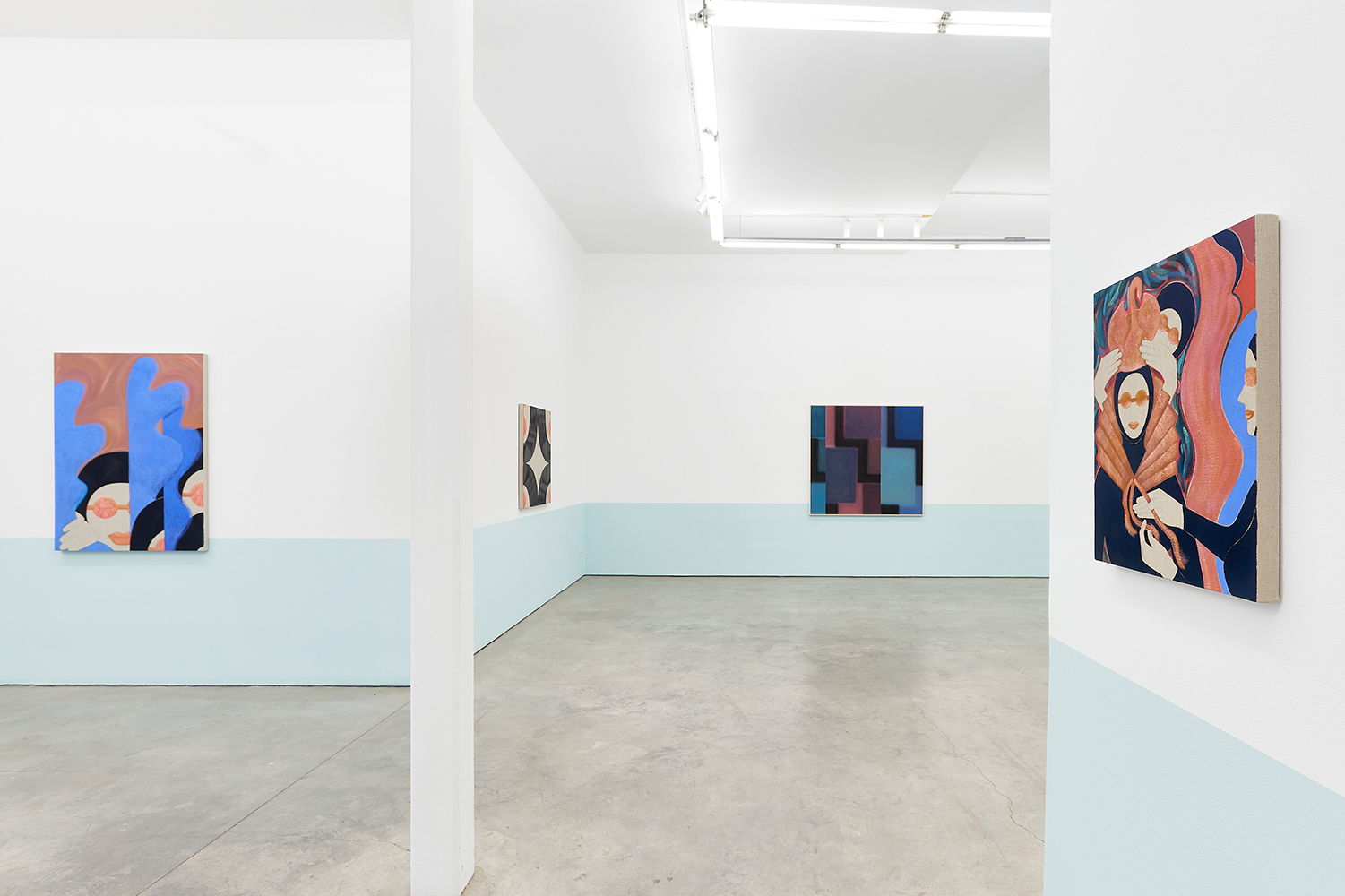 For this exhibition we juxtapose eight new paintings by Canadian artist Kristine Moran with six new acrylic paintings by Brooklyn-based artist Russell Tyler. The repeated geometric shapes across these fourteen paintings resonate in surprising ways, as Moran’s abstracted swimmers splash into the black-edged rectangles of Tyler’s proliferating polygons. Hung in a gallery painted three feet up each wall with aqua blue, the show wades into the territory between figuration and abstraction with interesting results.