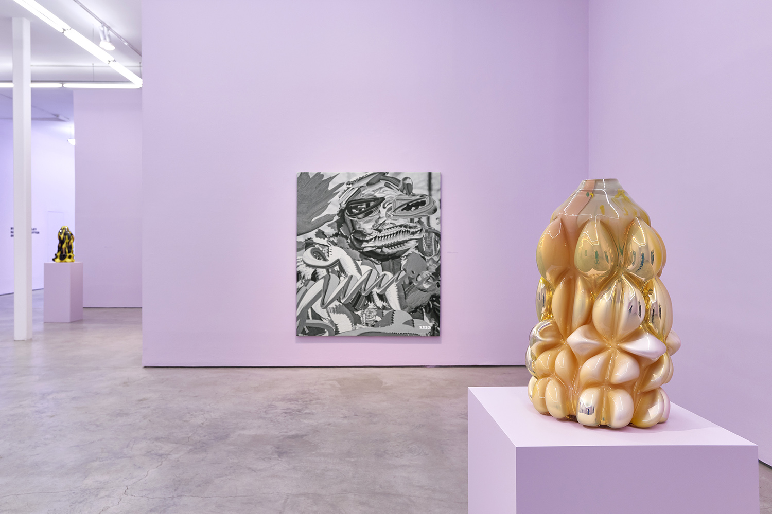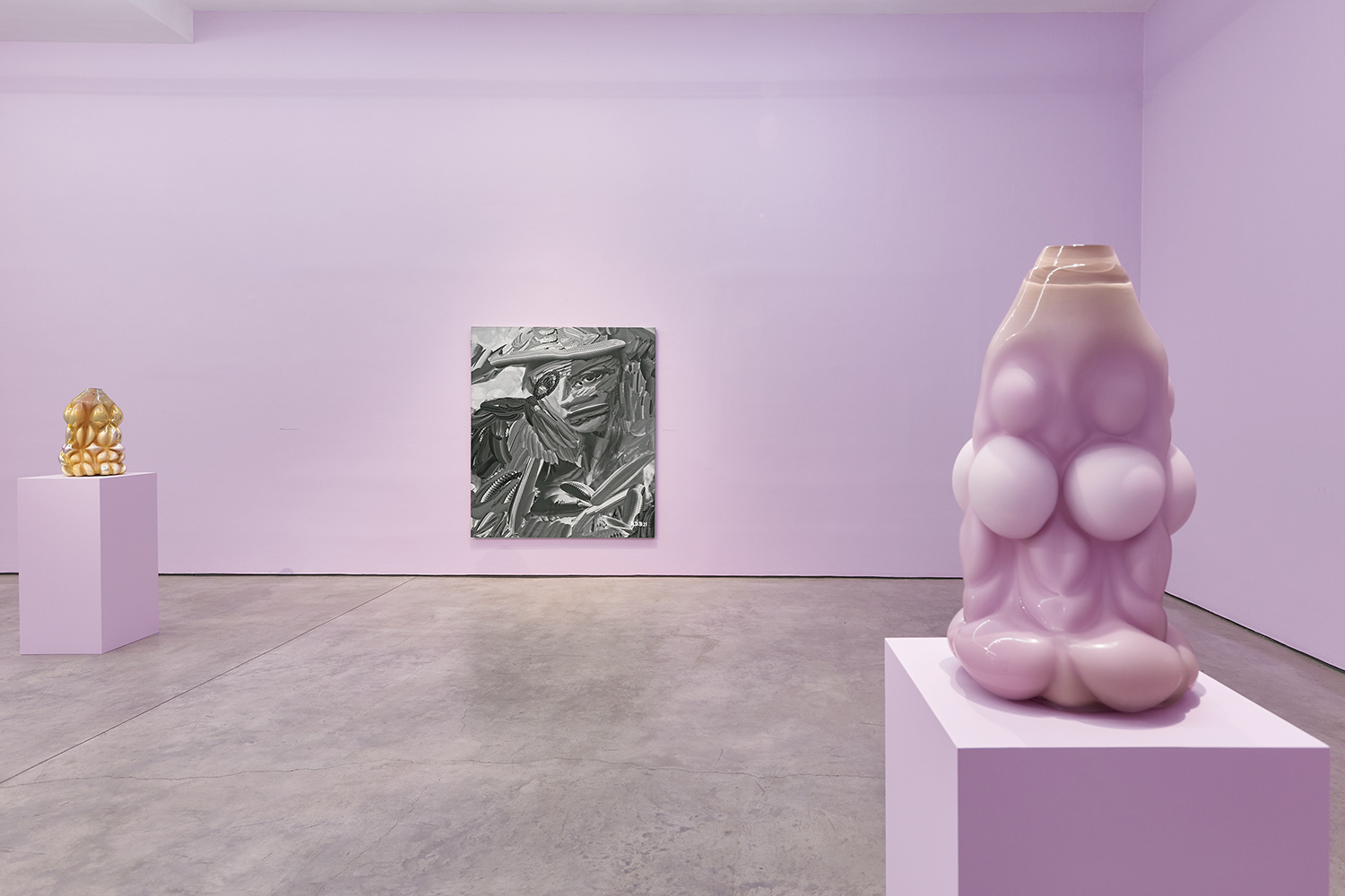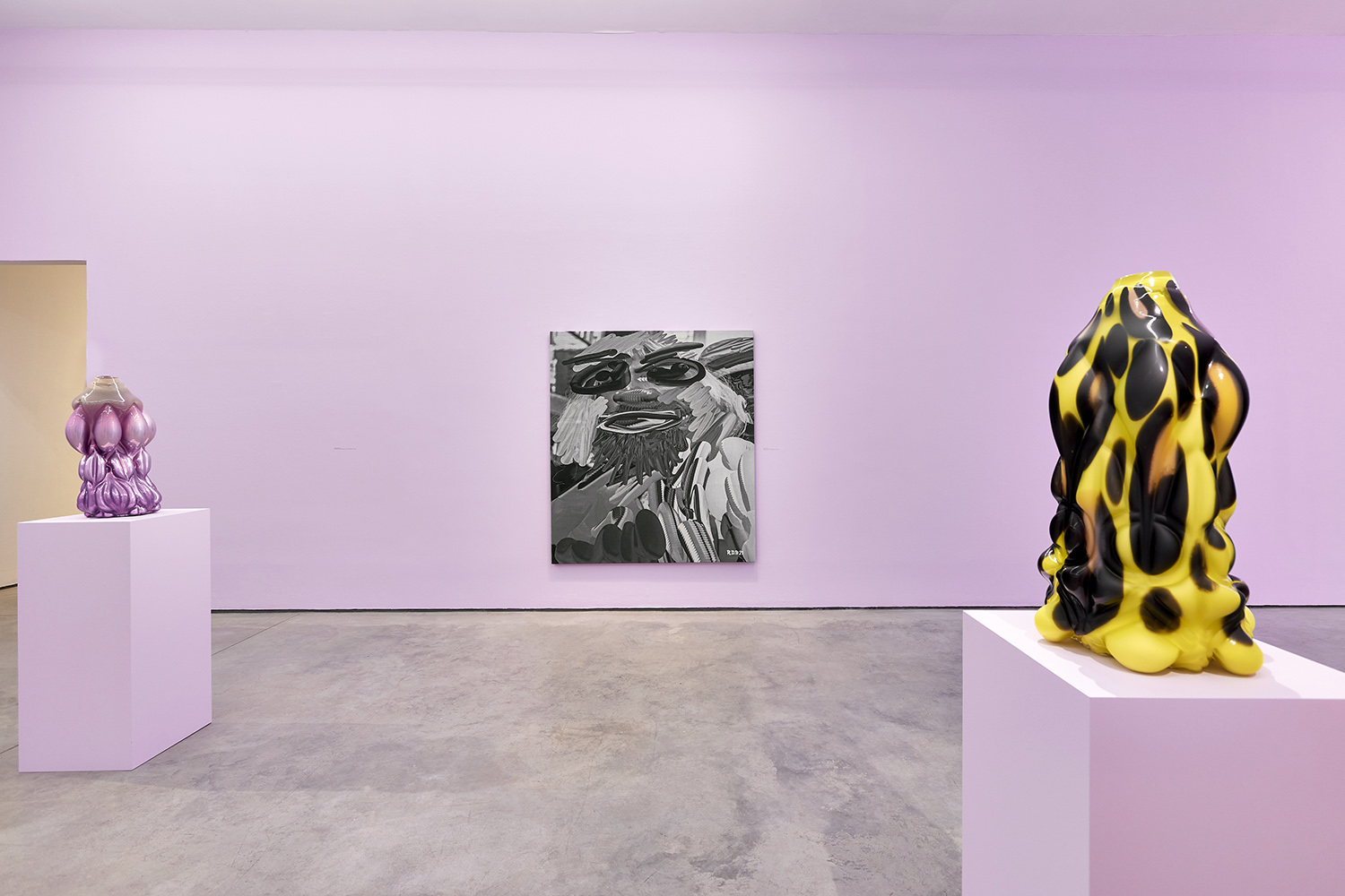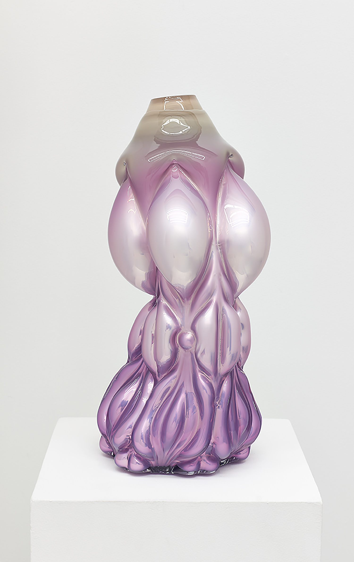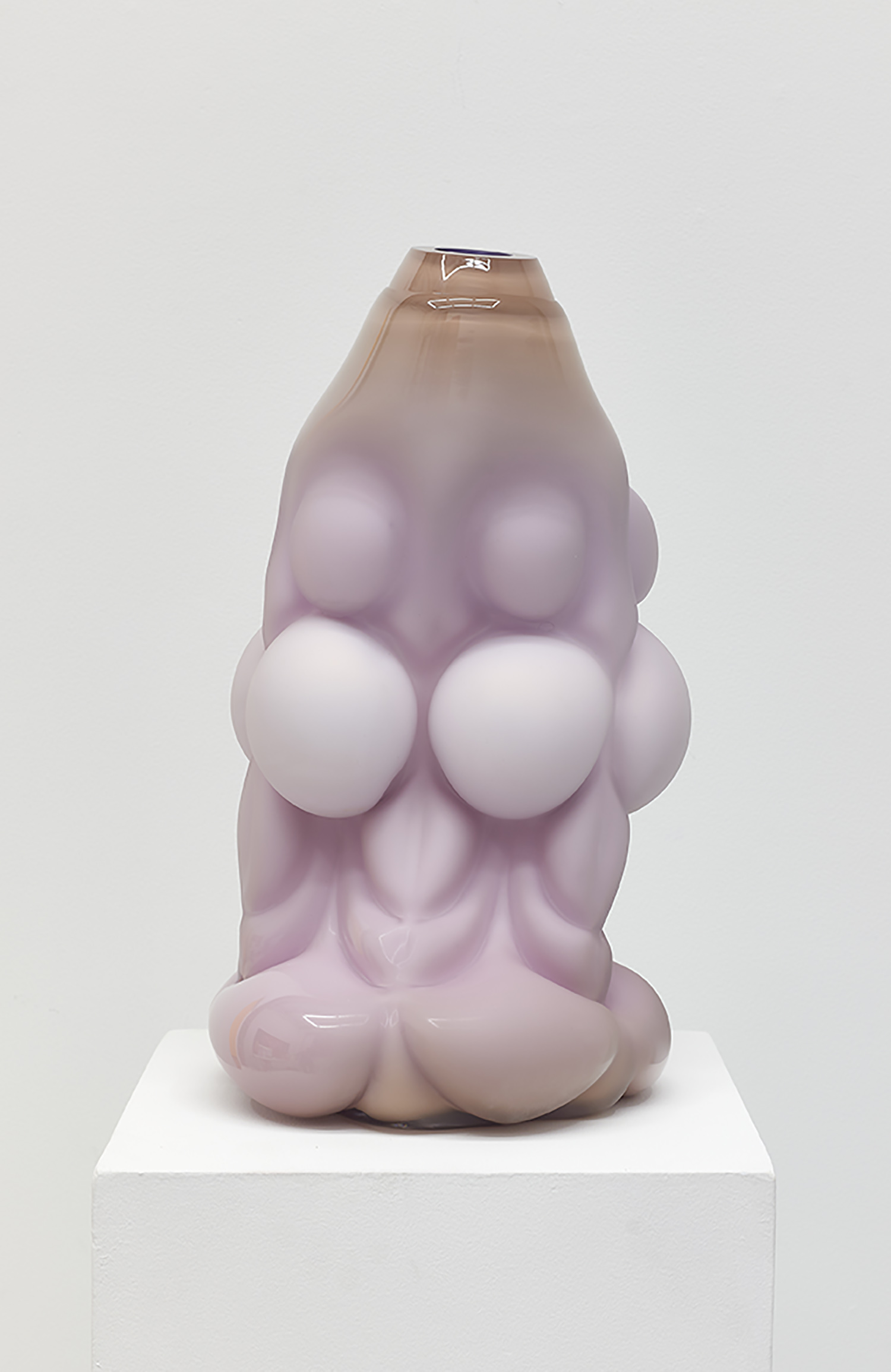 Based in the Kingdom of Crystal in Sweden, a region renowned for its hand-blown glass since 1742, Hansdotter forges fleshy, baroque sculptures, frozen in alien morphologies. Drawing on traditional processes she learned in formal training as a glassblower, Hansdotter’s work foregrounds craft and luxurious attention to detail – all in service of bombastic results, culminating in her strange and sensual objects. Five of her sculptures complement Bradley’s tapestries in Once Twice, opening a space for unexpected interplay between newfound collaborators.