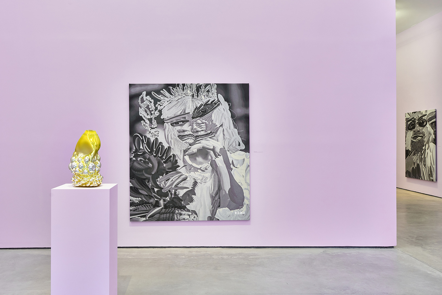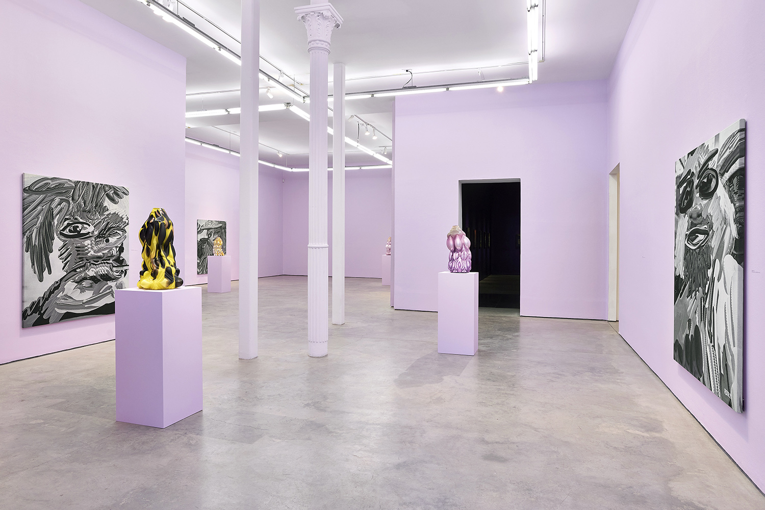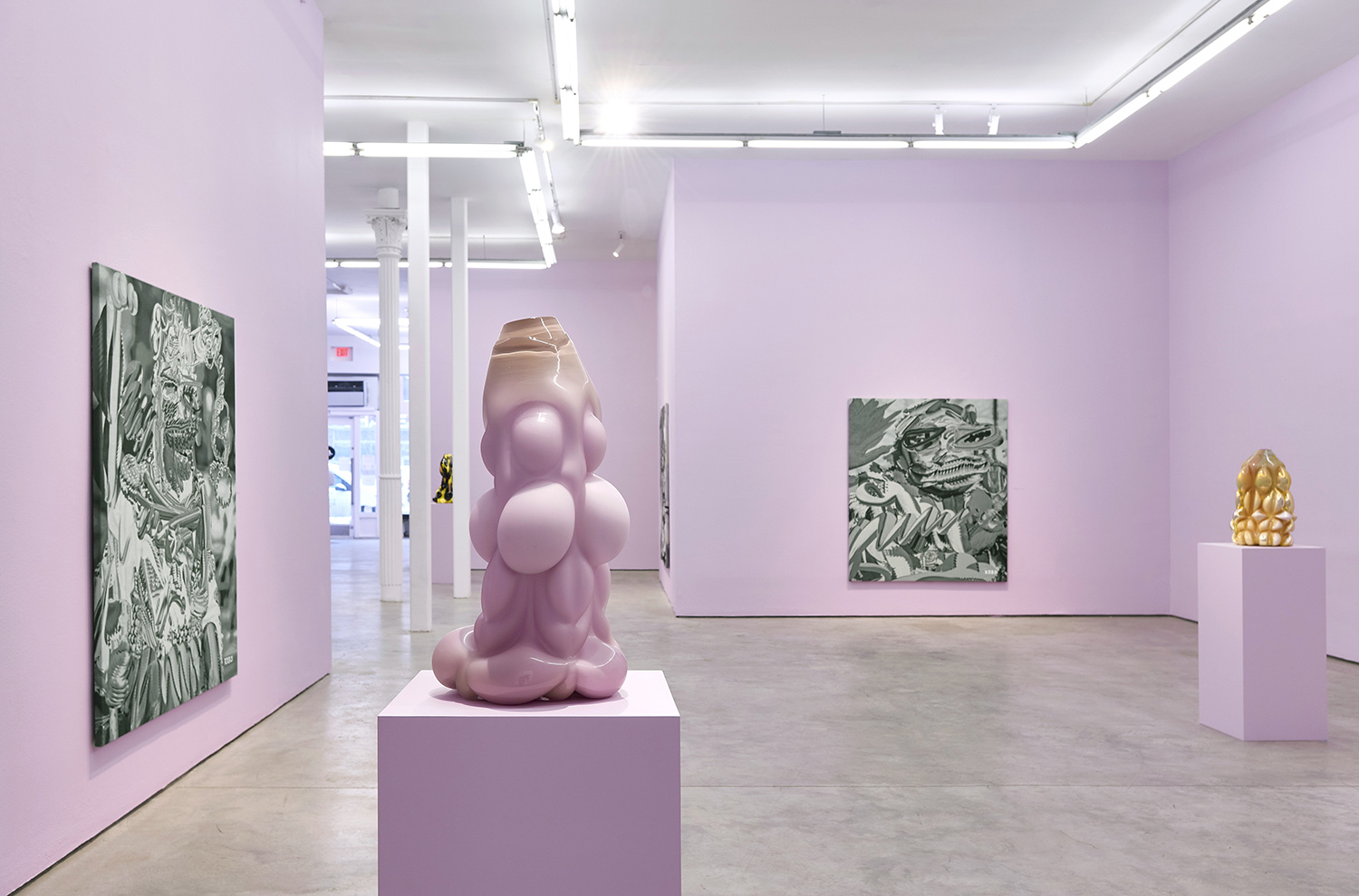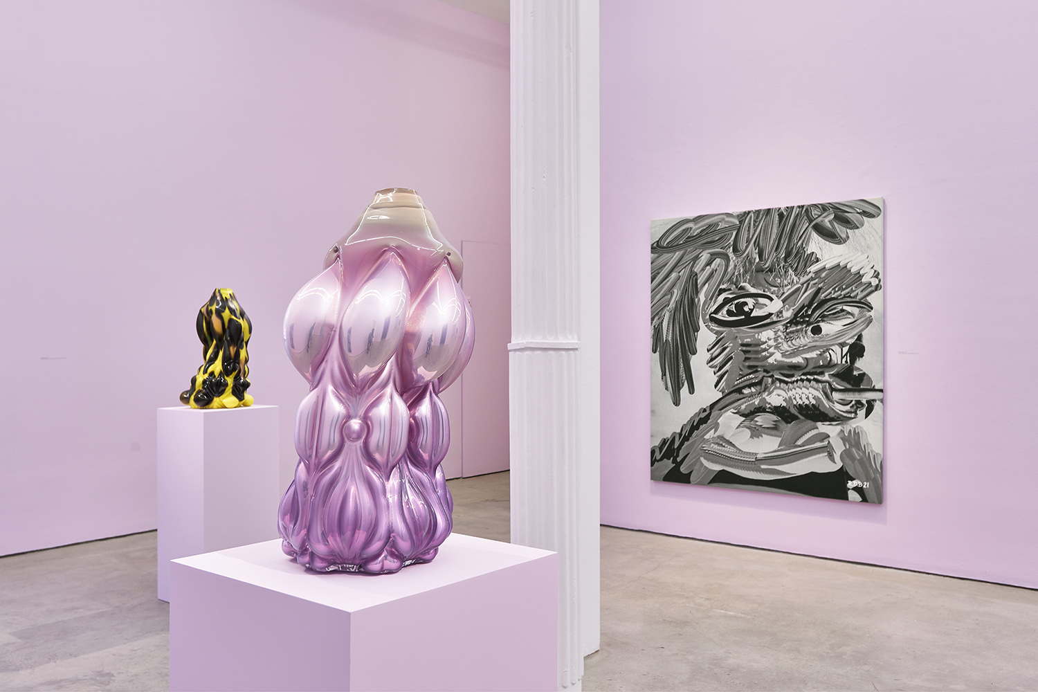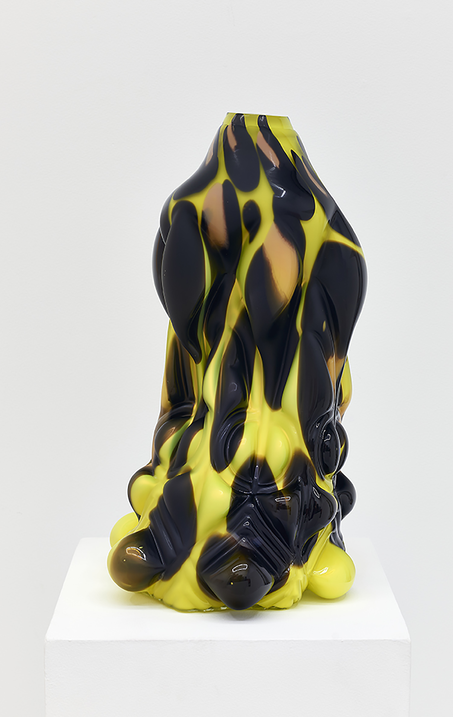 Based in the Kingdom of Crystal in Sweden, a region renowned for its hand-blown glass since 1742, Hansdotter forges fleshy, baroque sculptures, frozen in alien morphologies. Drawing on traditional processes she learned in formal training as a glassblower, Hansdotter’s work foregrounds craft and luxurious attention to detail – all in service of bombastic results, culminating in her strange and sensual objects. Five of her sculptures complement Bradley’s tapestries in Once Twice, opening a space for unexpected interplay between newfound collaborators.