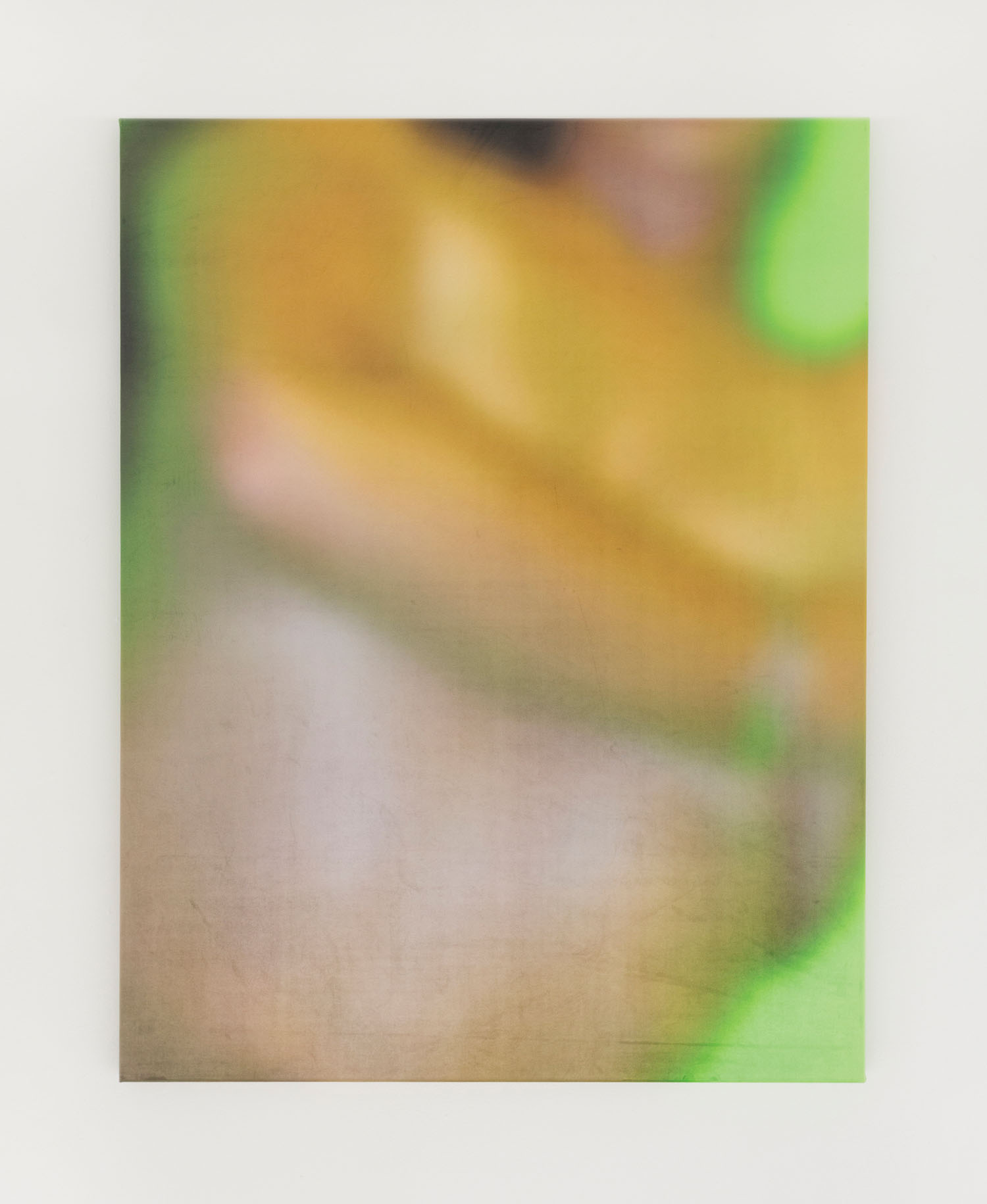 Works on synthetic suede are hung in large window-pane shapes on the walls opening up our big white box to views of the outside world. Mimicking loading images in new browser windows, the paintings look like they are still rendering, about to snap into focus for a view of the tantalizing outdoors. Perpetually blurred, super saturated dye-transfer prints mimic screenic color, glow and intensity while being tactile, soft and fuzzy physical objects. Many works look like the sky or trees, bodies in motion, people and plants, suggestively out of focus.
