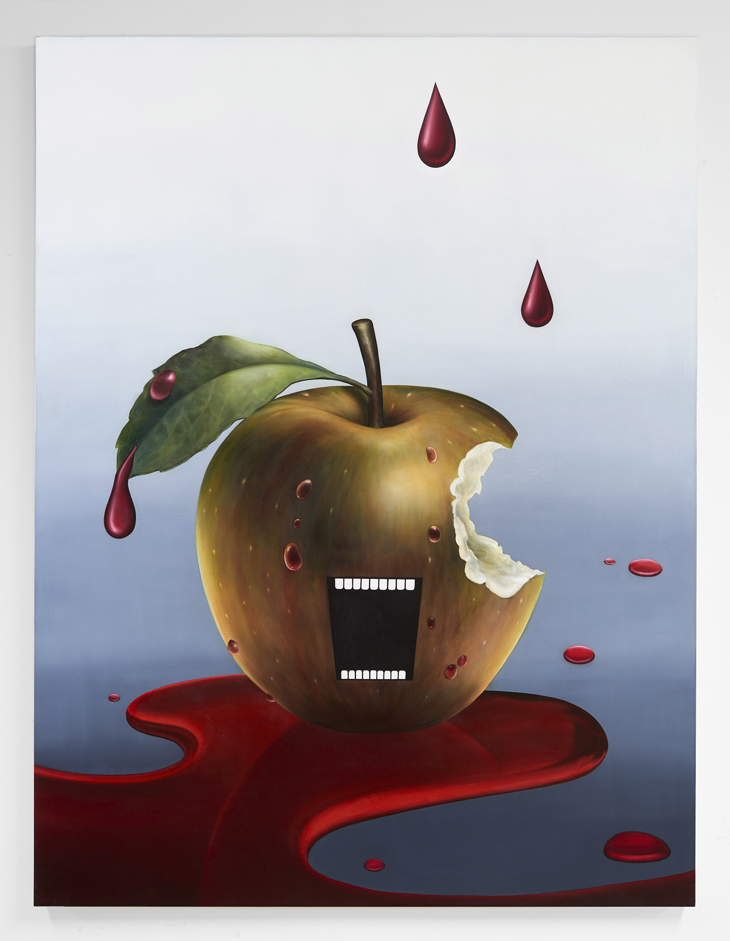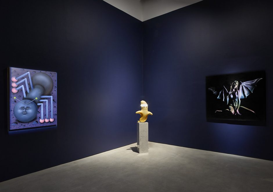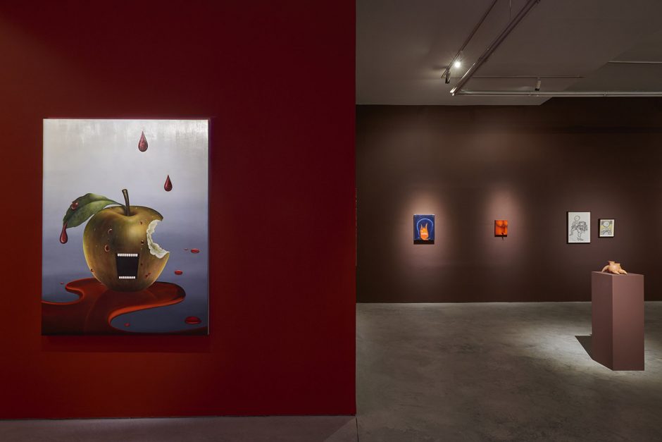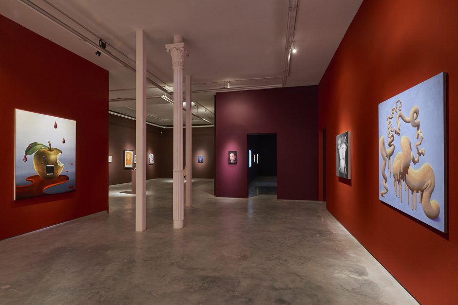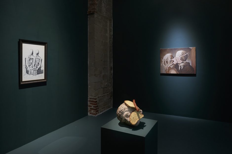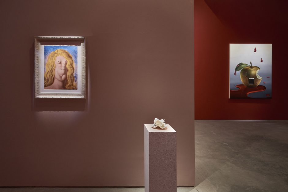 Sadly that essay is for another time (I already passed that class don’t make me take it again!) Here we have thirty-five artists to share with you and very little space left to type. Generally speaking the show groups itself into some shared tendencies, whether it is a dark romance coming from Ariana Papademetropoulos, Tali Lennox, Leonor Fini and Alison Blickle; or a face/mask zone with Aurel Schmidt, Kara Joslyn, Charlene Tyberghein, Louisa Gagliardi; a creepy garden with Nicolas Party, Alexander Harrison, Molly Greene or Ben Sanders; or a more pop cartoony type of disturbing with Aaron Elvis Jupin, Adam Parker Smith, Samual Weinberg and Botond Keresztesi. A major group would be embodied distortions of Brittney Leeanne Williams, Ben Spiers, Cathrin Hoffmann, Jana Euler and many more; one of the recurring body parts of the show is the mouth, starting with the vagina-mouth in Magritte’s Le Viol, through the teeth-baring scream of Emily Mae Smith’s archetypal apple. Louisa Gagliardi’s giant spike piercing through the bottom lip of her digitally painted mouth, the open pink shell in Tali Lennox’s lap or the shark-like over-toothed grin of Weinberg’s pink man: the smiles in the show are the mysterious focus, ending with the shrouded—and masked—mouths of Eric Yahnker’s Magritte homage.