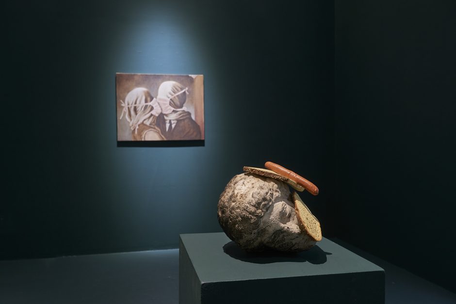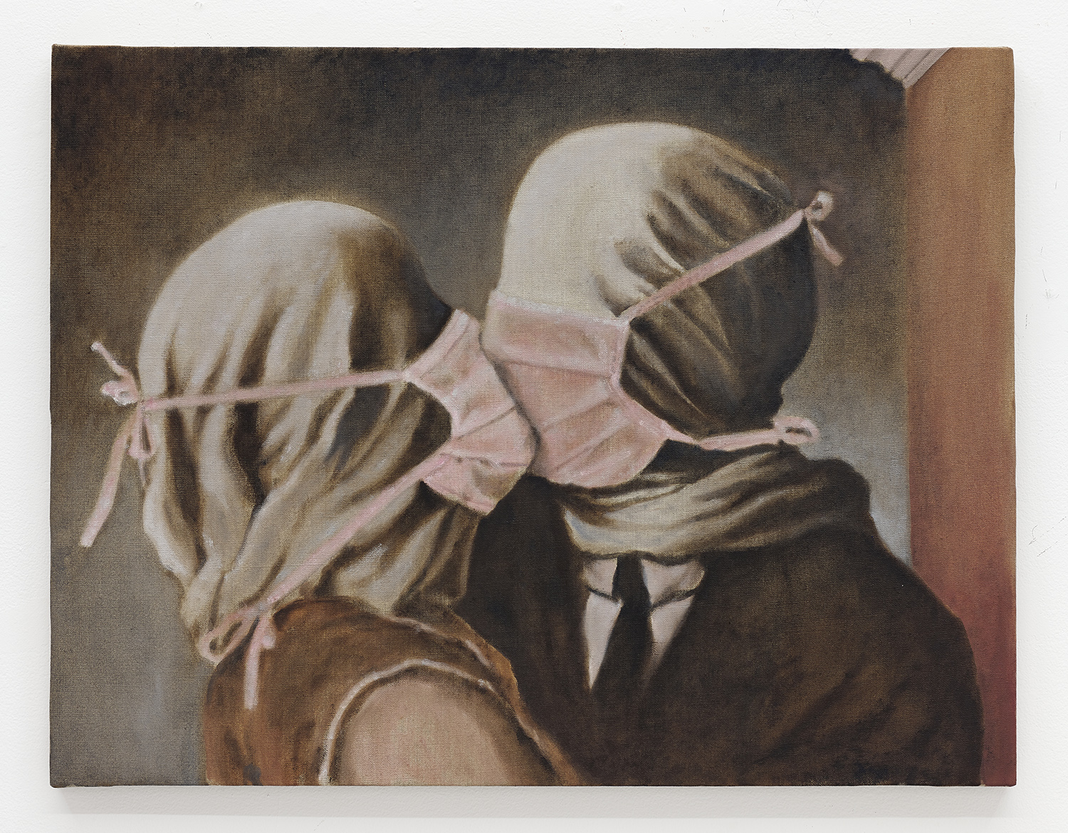 Eric Yahnker, Pandemic Lovers (after Magritte), 2020. Oil on canvas, 27.5 x 36 inches, 70 x 91 cm