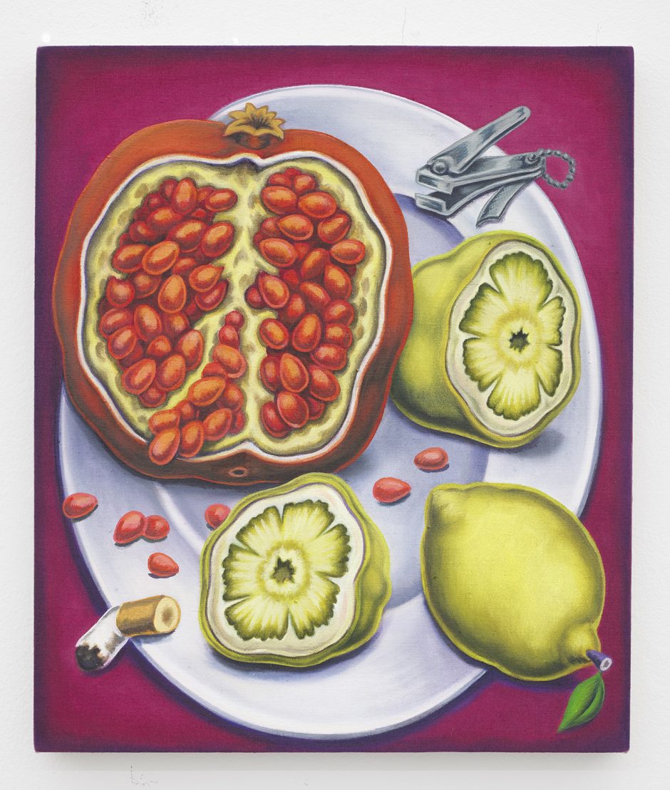 Pedro Pedro, Pomegranate, Lemons, Nail Clippers, Cigarette Butt, 2020. Acrylic and textile paint on linen, 20 x 17 inches, 51 x 43 cm