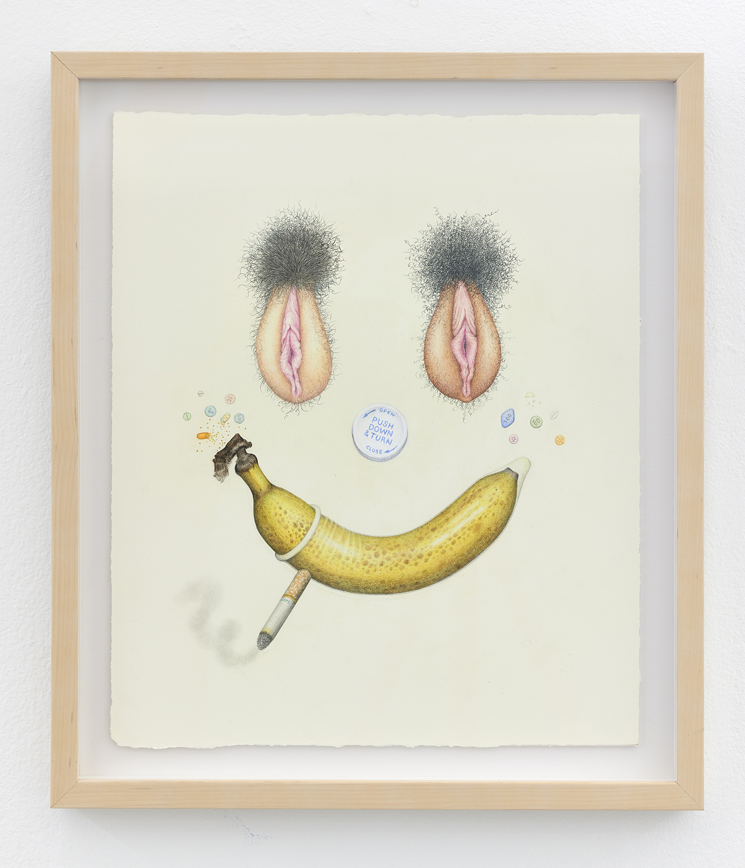Today we don’t need to label artists female and put them in female shows; we don’t even need to label artists surrealistic; I’ve always found manifestoed art movements of the past helpful to organize thought and to hone the timeliness of their generational thinking, but they are at best a jumping off point to get the engine going. In fact, multiple artists in this show specifically said I should “stop calling it the Surrealism and Feminism show for goodness’ sake.” Artists today seem to prefer to be in group shows with random song lyric titles that have no theme rather than be grouped in any way, but I think we can take the middle ground: I picked the artists in the show because they had a whiff of surrealism about them, and then went out in search of a few surrealist works to flavor the sauce. Pedro Pedro’s pomegranate painting has a surrealist aspect to it but far more affinity with the Peter Saul show down the street at the New Museum, or the Chicago Imagists (who were explicitly, avowedly inspired by Surrealism). Aurel Schmidt isn’t a surrealist artist but she plays with a person like a cadavre exquis and I certainly needed at least one artist with the balls to depict some vaginas!
