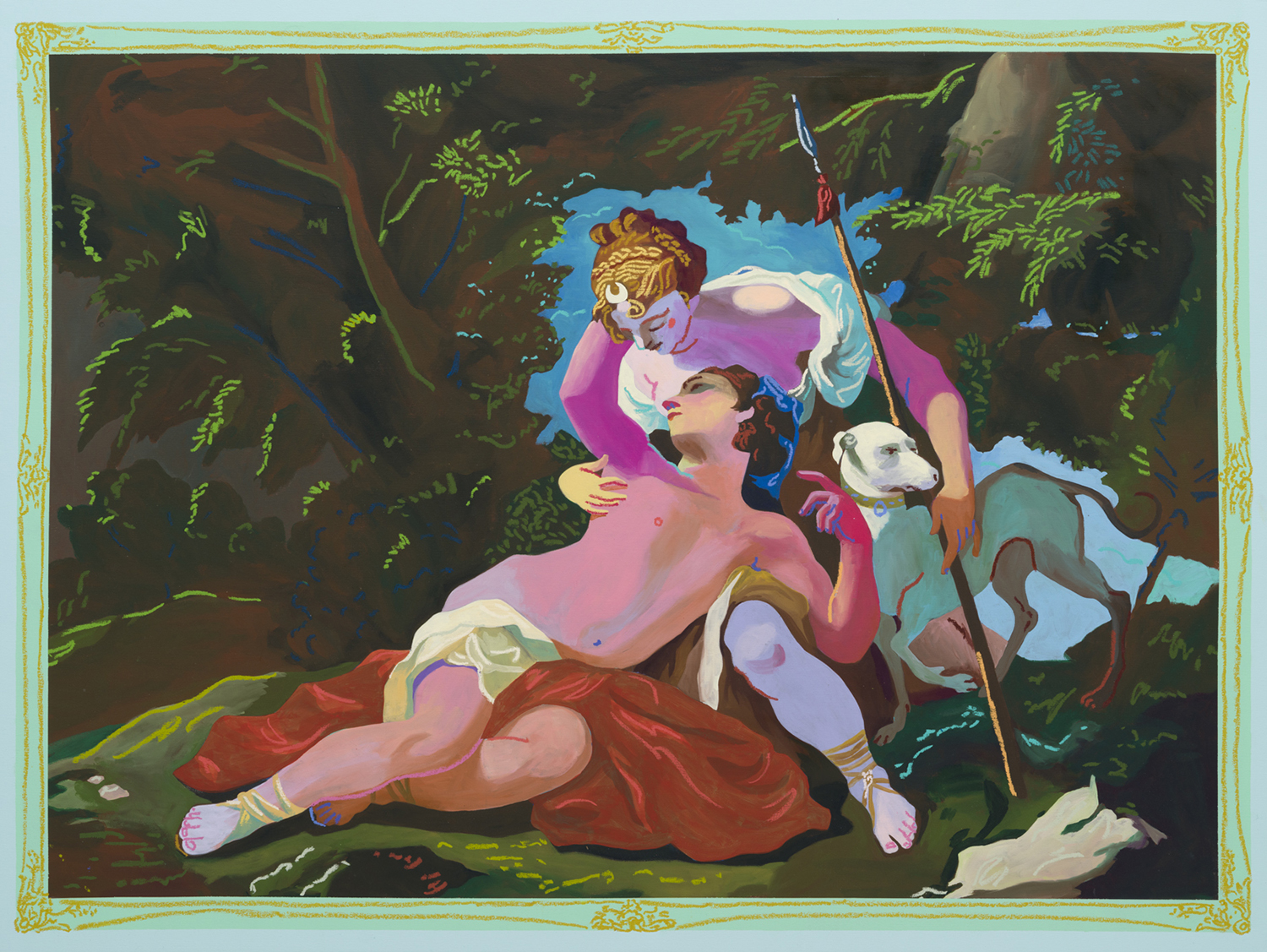 Andy Dixon, Diana & Callisto Painting, 2023, Acrylic and pastel on canvas, 56 x 74 inches, 142 x 188 cm.
