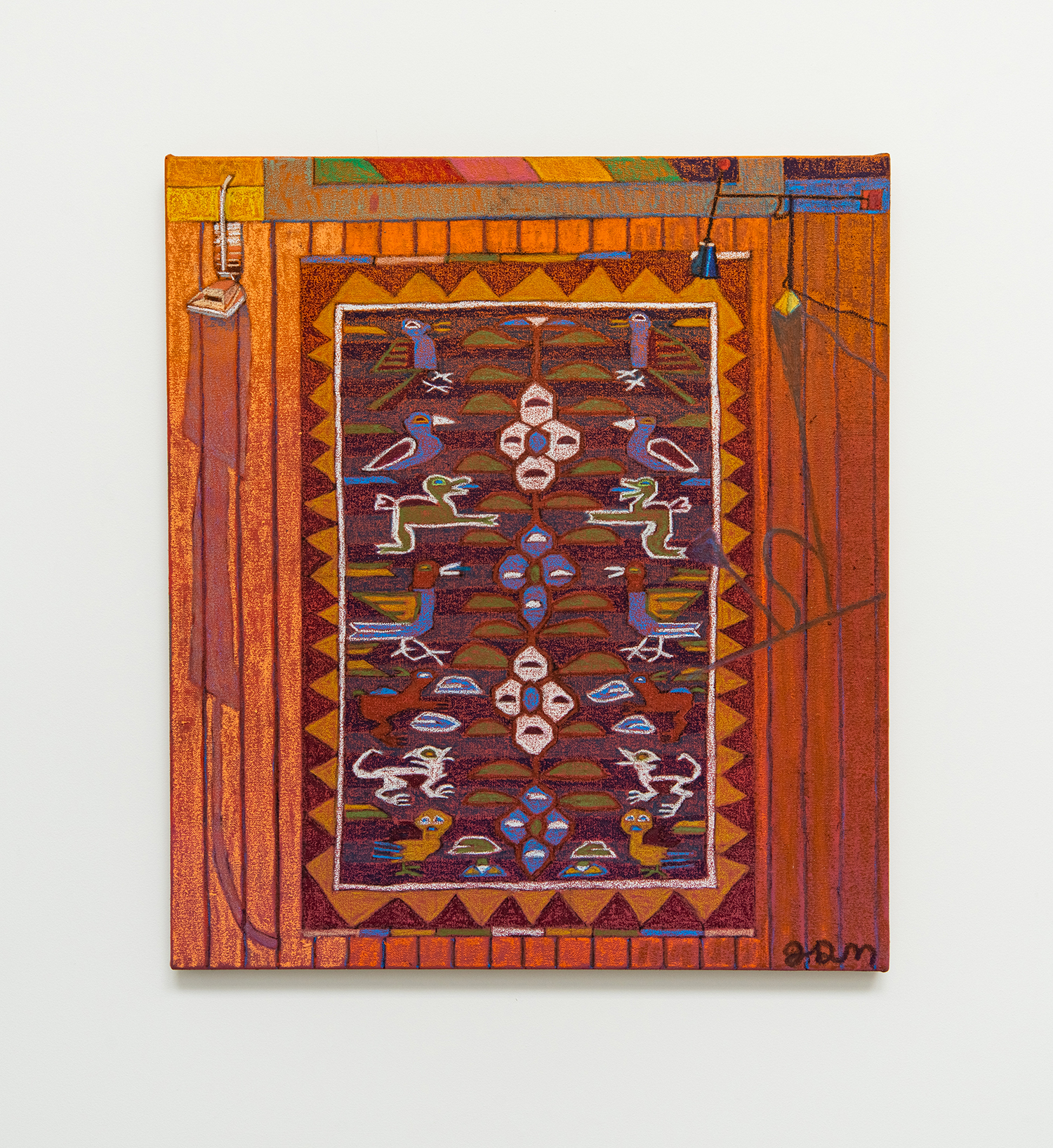 JJ Manford, Interior W/Vacuum, Peruvian Tree of Life Rug, and Calder Floor Lamp, 2020, Oil pastel and flashe on linen, 32 x 36 inches, 81 x 91 cm.