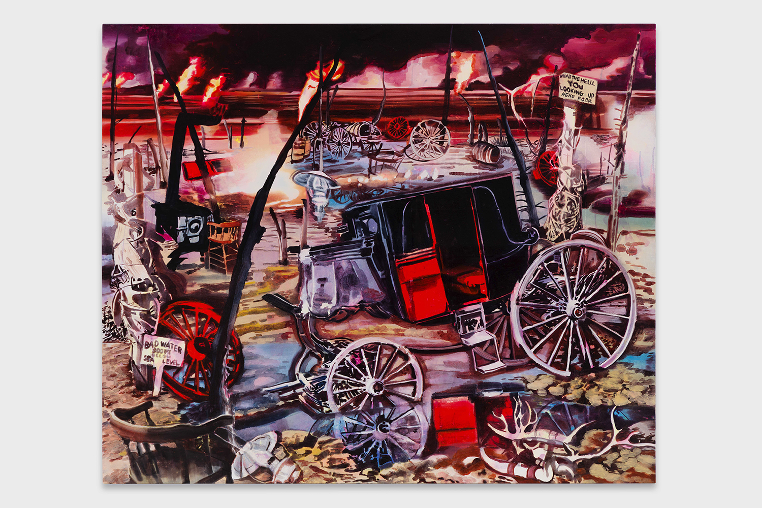 Rosson Crow, Burned Wagon Ponit, 2021, Acrylic, photo-transfer and oil on canvas, 72 x 84 inches, 183 x 213 cm.