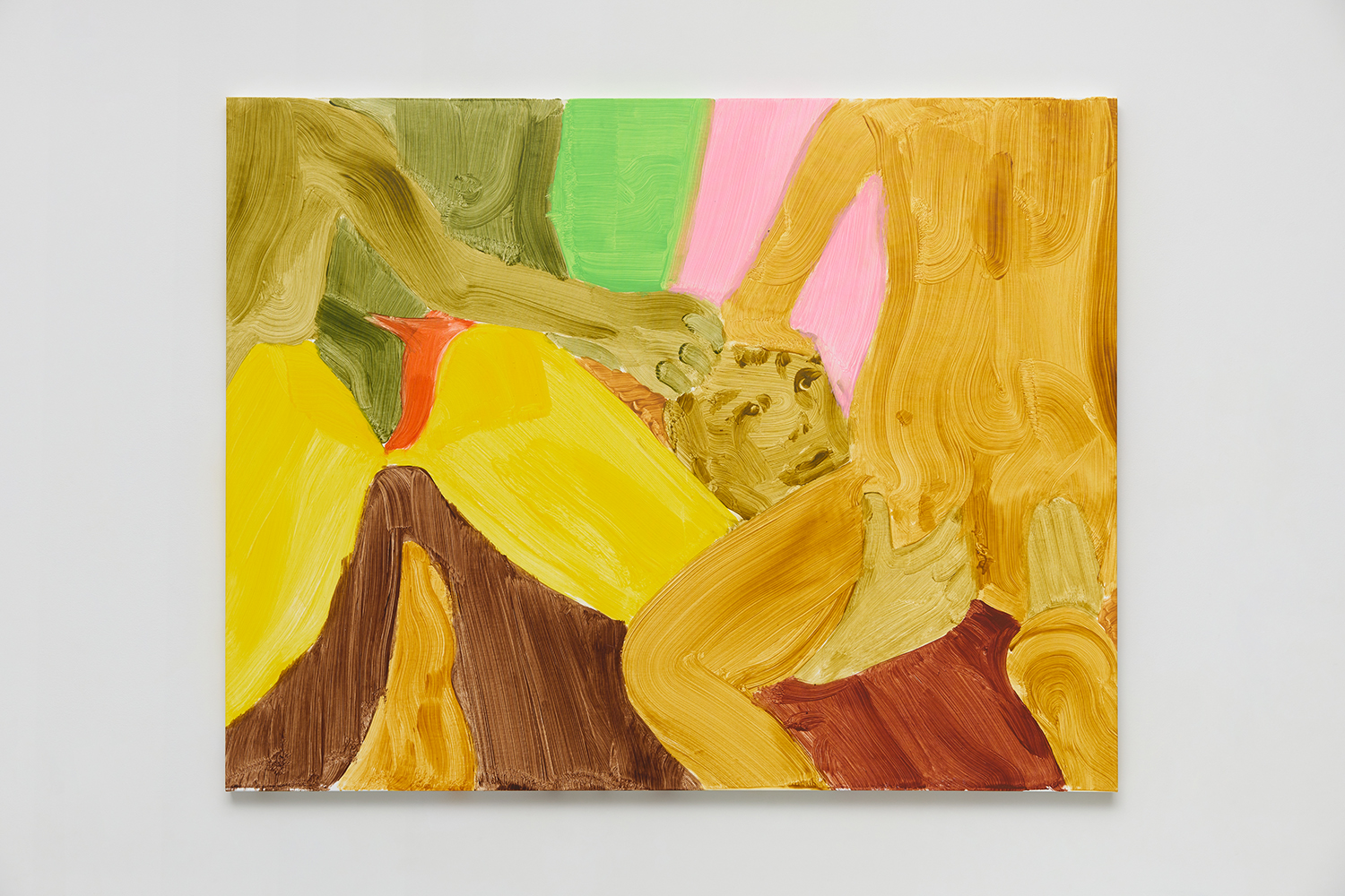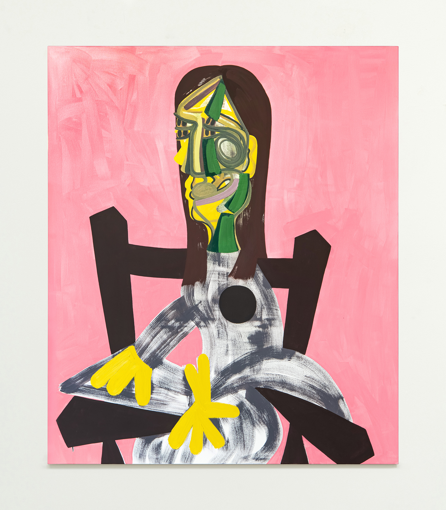John Millei, *Woman in Chair (Pink and Yellow), 2009, Oil and Flashe on canvas, 100 x 84 inches, 254 x 213.4 cm.