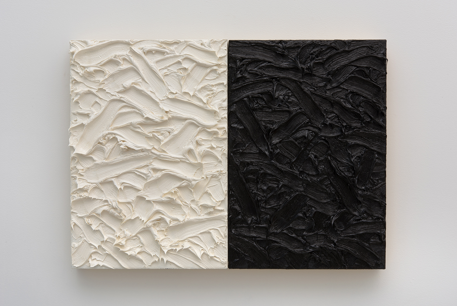 James Hayward, *Abstract Diptych #10 (Titanium White / Ivory Black), 2011, Oil on canvas, on wood panels, diptych, 19 x 26 inches, 48 x 66 cm.