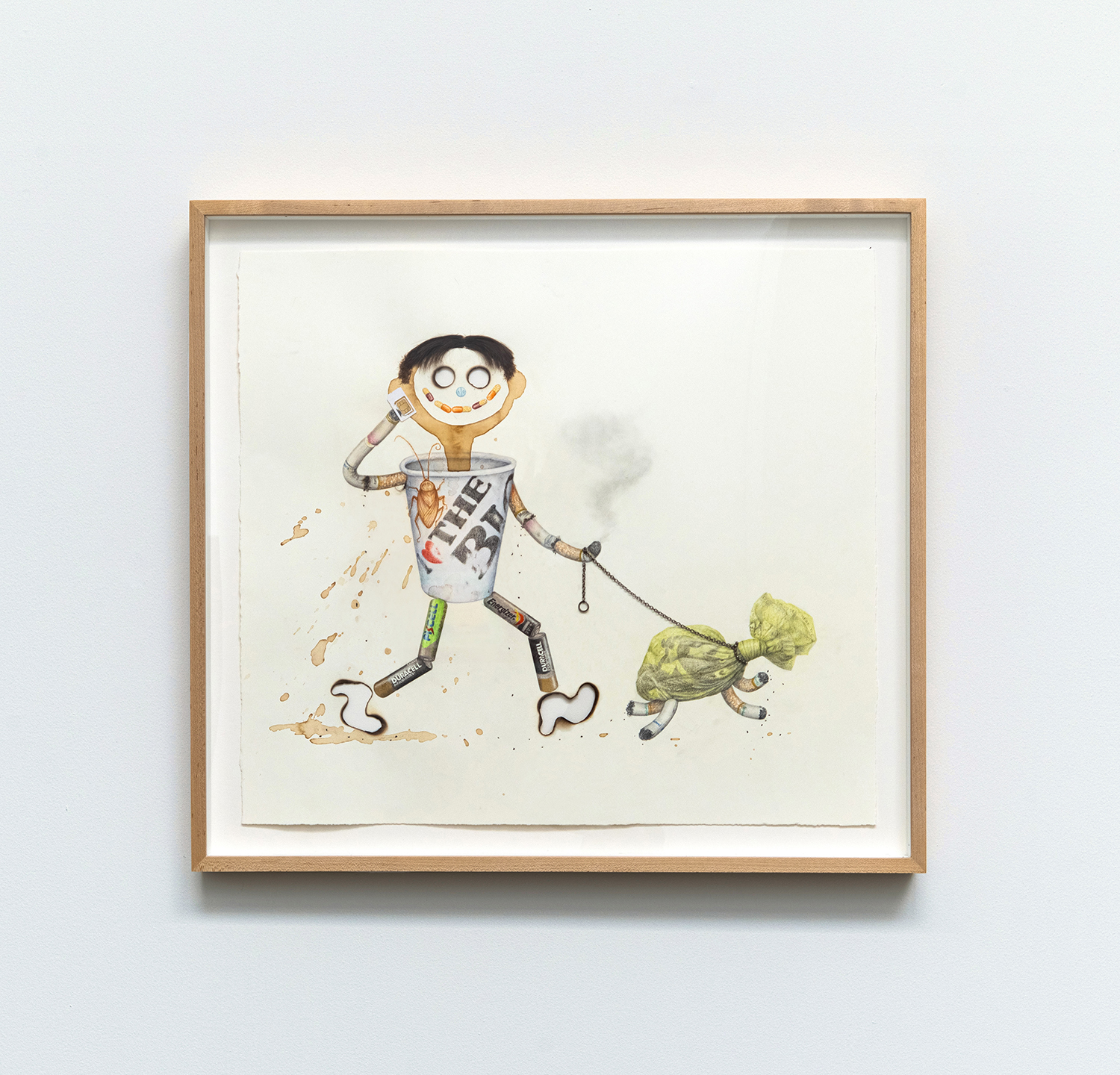 Aurel Schmidt, Trash Doll (I <3 the Big Apple), 2019, Color pencil, pencil, acrylic, shellac, coffee, human hair, SIM card, metal chain, archival glue and burn holes on paper, Frame dimensions: 16.5 x 22 inches, 42 x 56 cm.