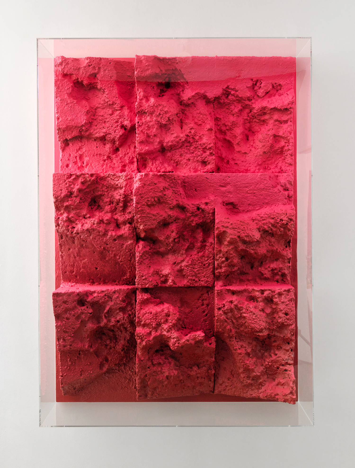 Jan Albers, mOulinrOugE, 2021, Spray paint, polymer plaster on polystyrene & certified non-wood, acrylic glass box, 67 x 48 x 13 inches, 171 x 121 x 34 cm.