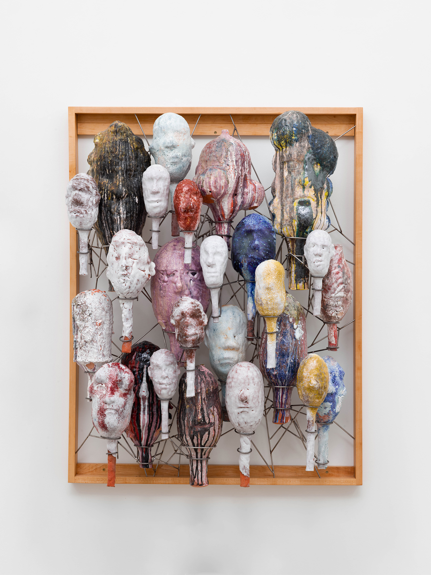 David Hicks, Strangers and Flora, 2022, Glazed ceramic, steel, maple, 54 x 42 x 15 inches, 137 x 107 c 38 cm.