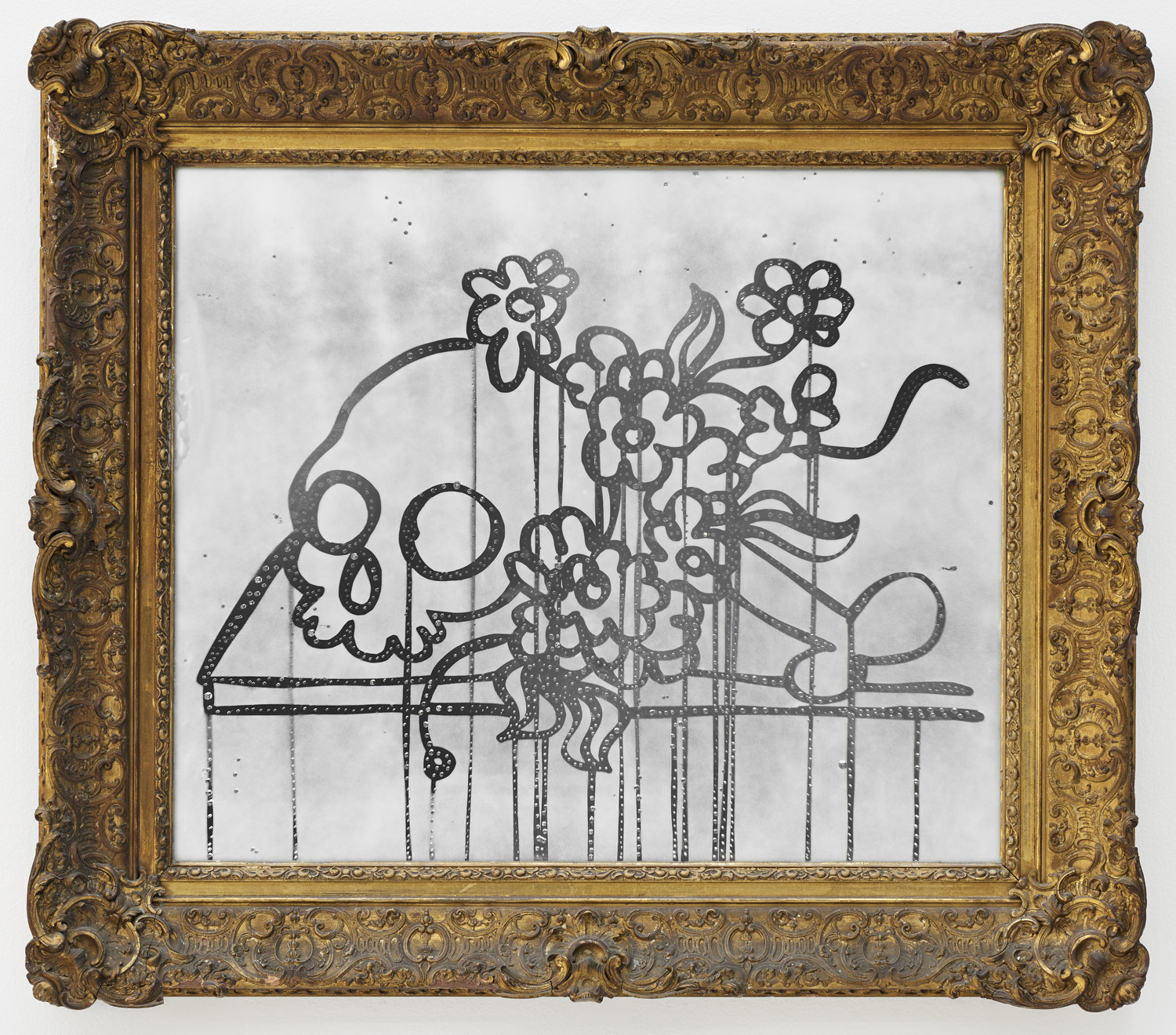 Adam Parker Smith, Vanitas, 2018, Gold leaf antique frame, mirror, resin, 35.5 x 41 inches, 90 x 104 cm.