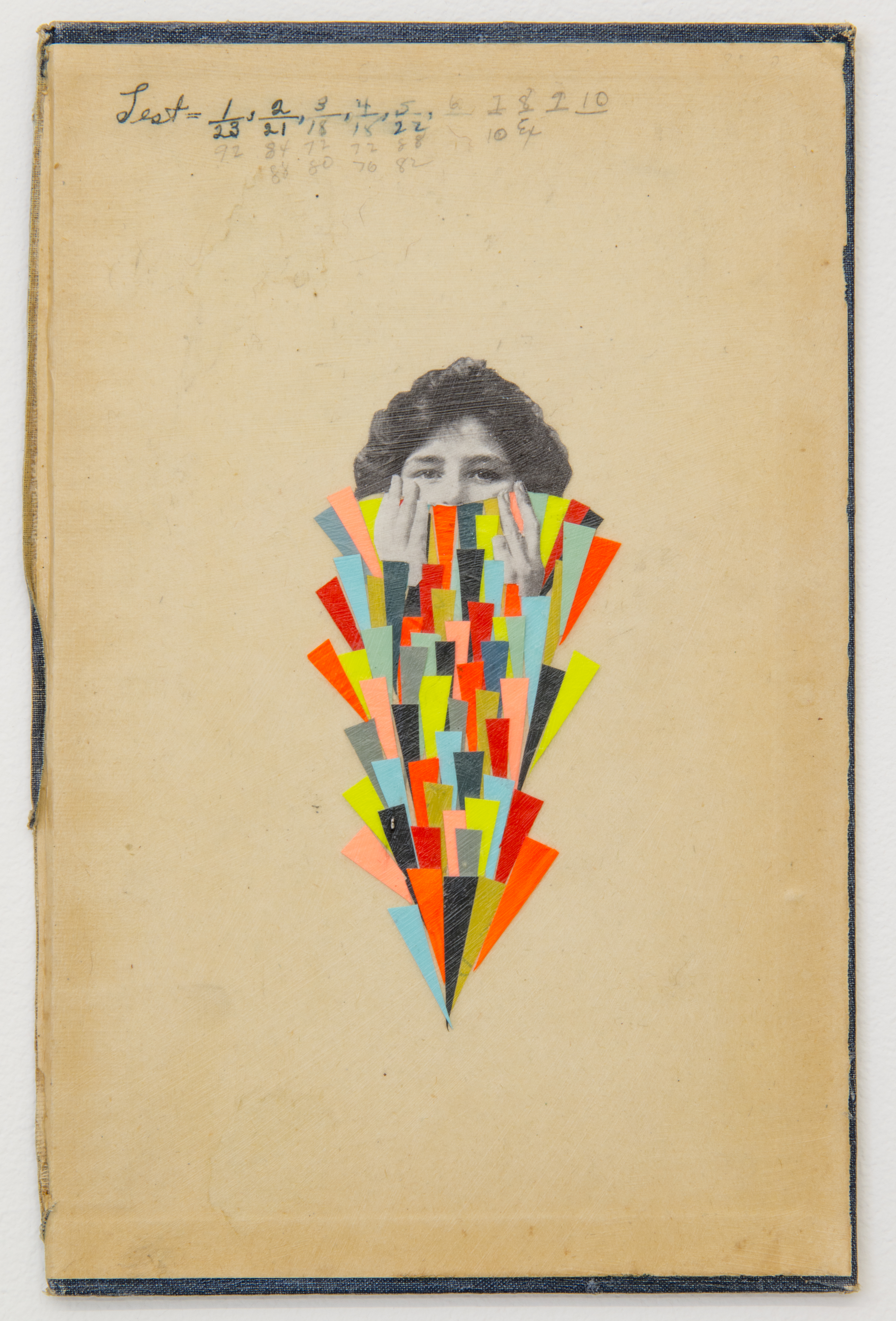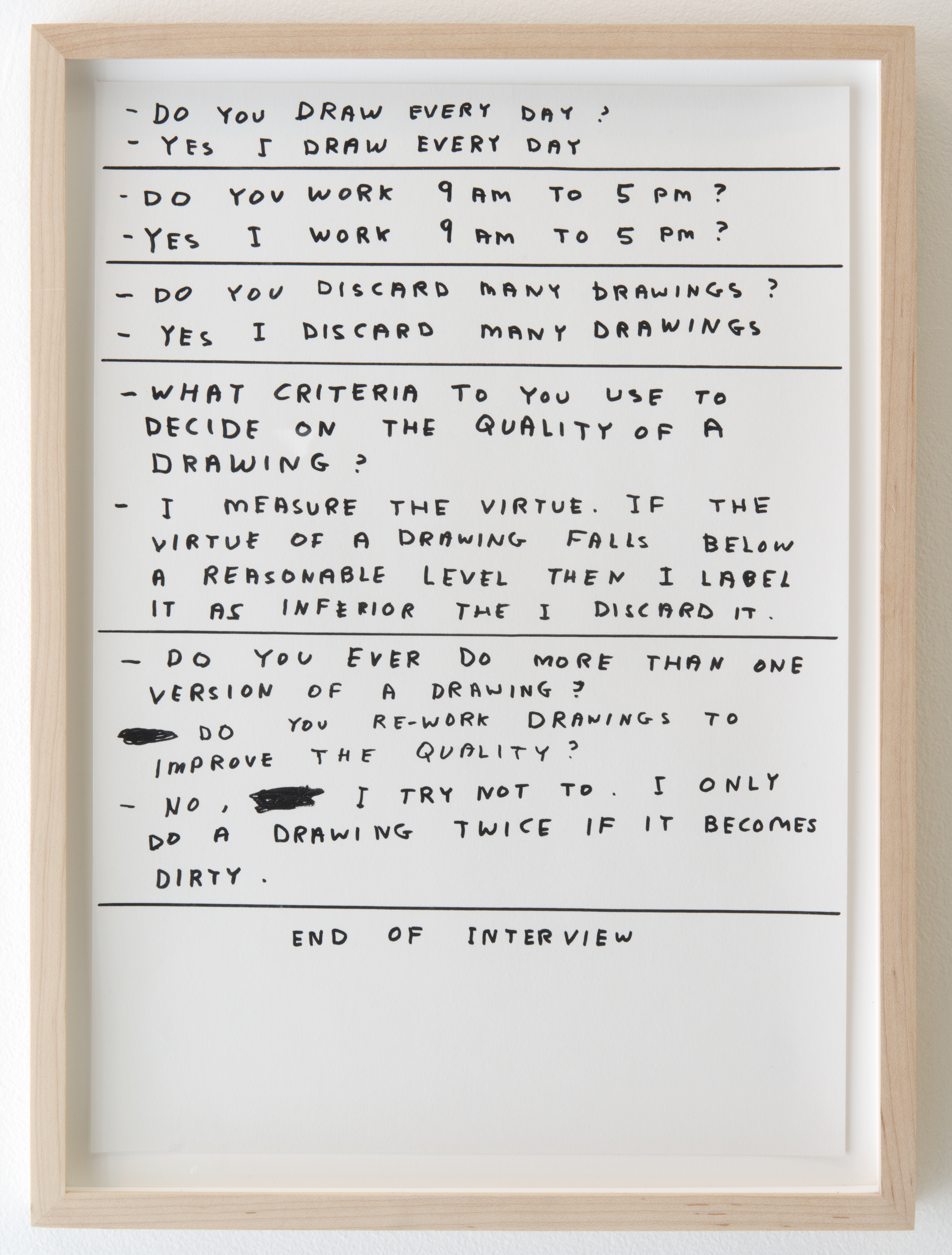 While many works are made from book covers, book pages or books and magazines themselves, many of the works deal in a larger sense with words or semiotics, the shapes of letters or the life of the mind within the realm of “arts and letters”. David Shrigley contributes a lexically disruptive bronze sculpture and a work on paper that hilariously looks at the translation of an artist’s oeuvre into print form via an interview. “Do you draw every day? Yes I draw every day.” Troels Carlsen contributes a trompe l’oeil painting on paper revealing the poetry behind a dedication page of a lost novel; while Jen Mazza investigates what psychological content we bring to a simple painting of a closed Psychology textbook.