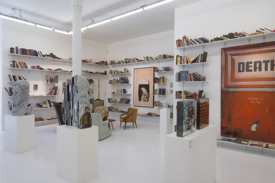 As a zine collecting bibliophile and a show full of book nerds, The Death of Print Media is less of a theme than is the celebration of print media, but death certainly is lurking: Harland Miller contributes an adjusted Penguin Classics painting asking “Death: What’s In It For Me?” Sean Landers exhibits a memento mori library painting of adjusted titles, Long Bin Chen contributes two massive mausoleal busts of literary giants made from carved magazines, and Simon Evans a letter to the future from William Shakespeare.