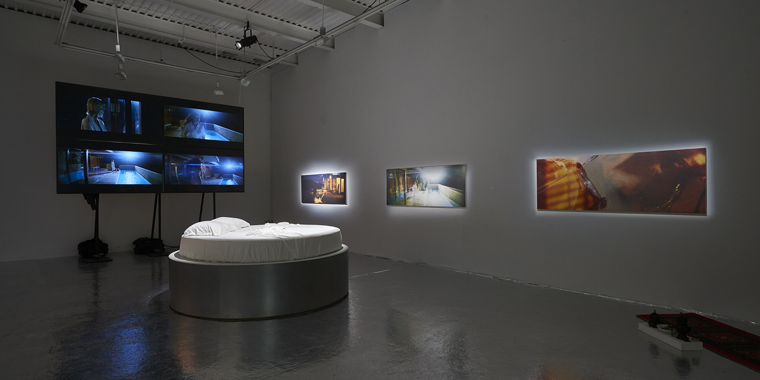 The exhibition consists of a film, rotating bed and mirror installation as well as small sculptures and silkscreened stills. The centerpiece of the show, Deepfake (25min) is a film that switches between one and four frames as it follows the main character Eve around the desert and LA. Eve seems to be experiencing layers of memory and slippages of identity and the viewer is unsure what visual information is reliable and what has been altered.