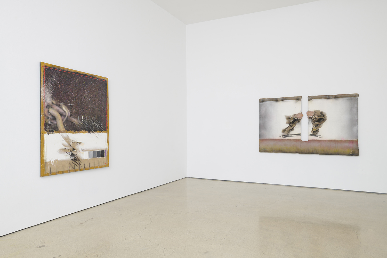 Nicholas Hondrogen, Siamese No. 9, 1974, oil, gesso, charcoal, glue and foam on linen diptych, 58 x 82 inches, 147 x 208 cm.