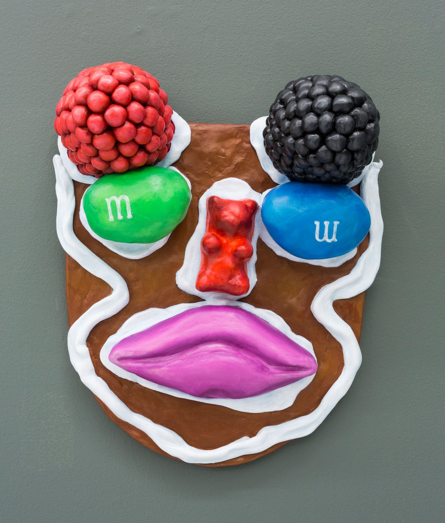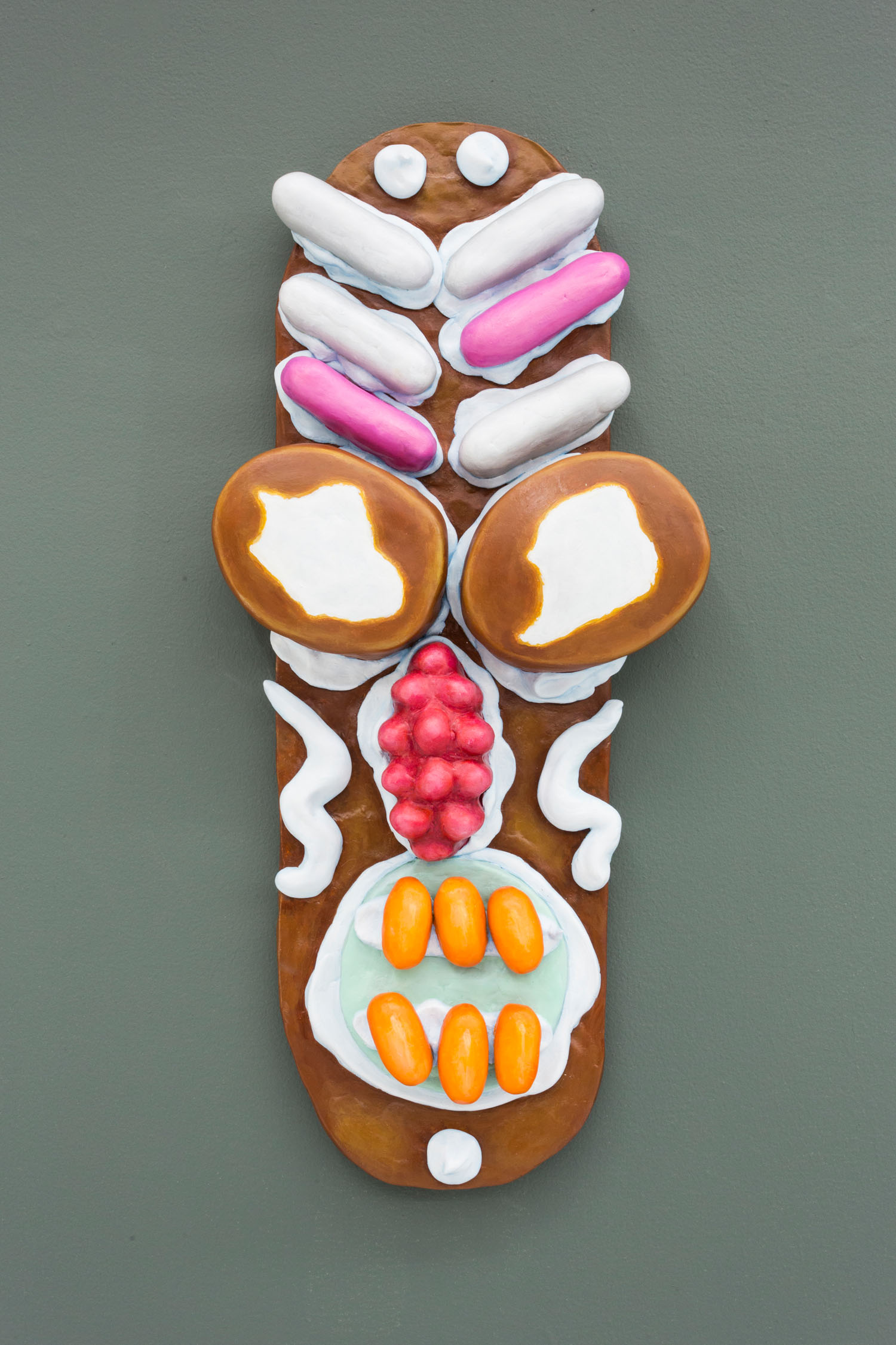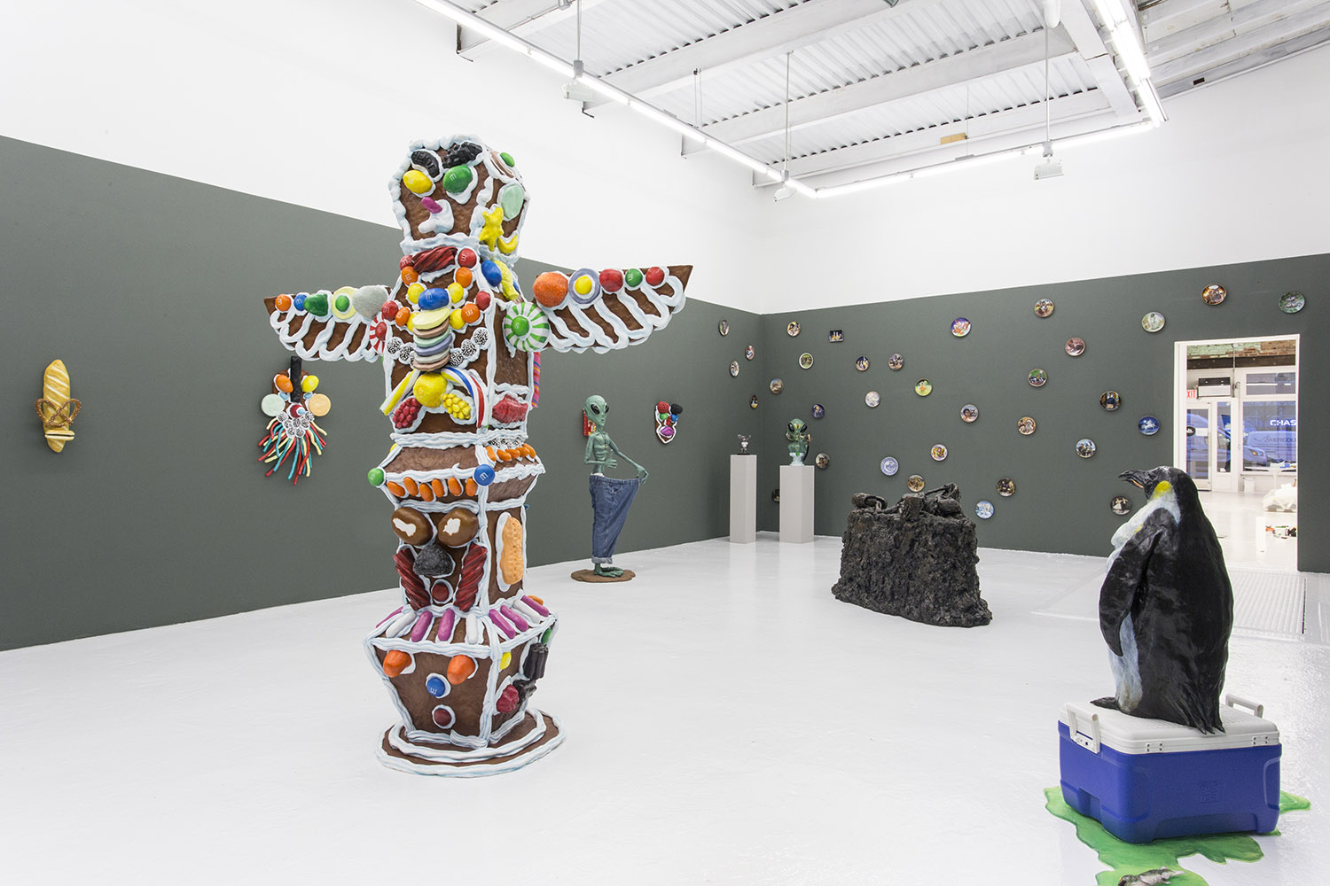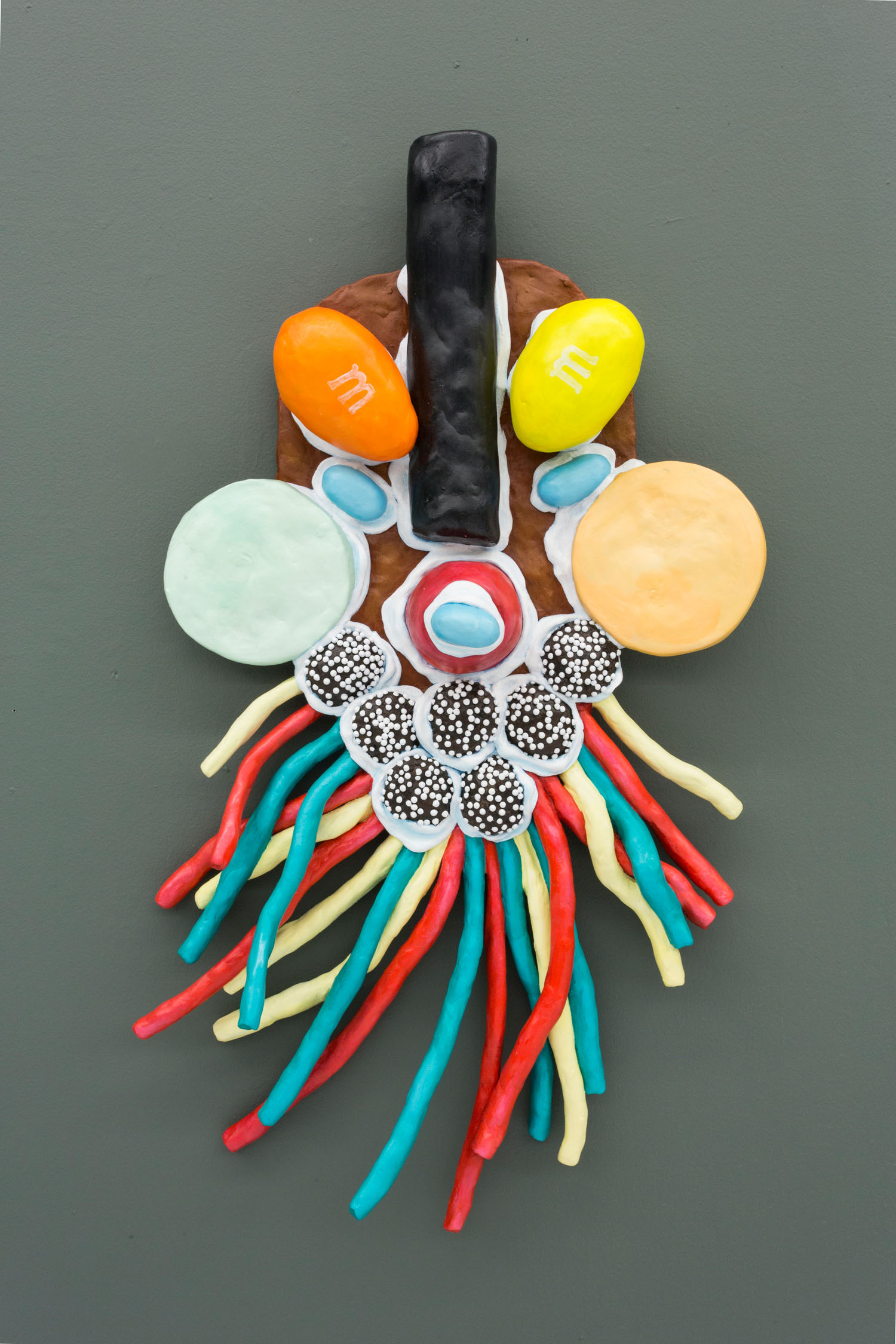 The largest sculpture, M&M Odoodem, Like Totally Totem Polarized, introduces a Google-search visual language that informs their work; a gingerbread house-styled totem pole. Carving the licorice, Mike ’N’ Ikes, gum drops and Snow Caps in a type of self-hardening clay then painting the sculpture, the artists simulate gingerbread and icing architecture festooned with colorful candy. Along the walls gingerbread-styled masks continue this “pantheon” of sorts jumping stylistically around the globe of ancient art and craft with a “because LOL nothing matters” vibe.