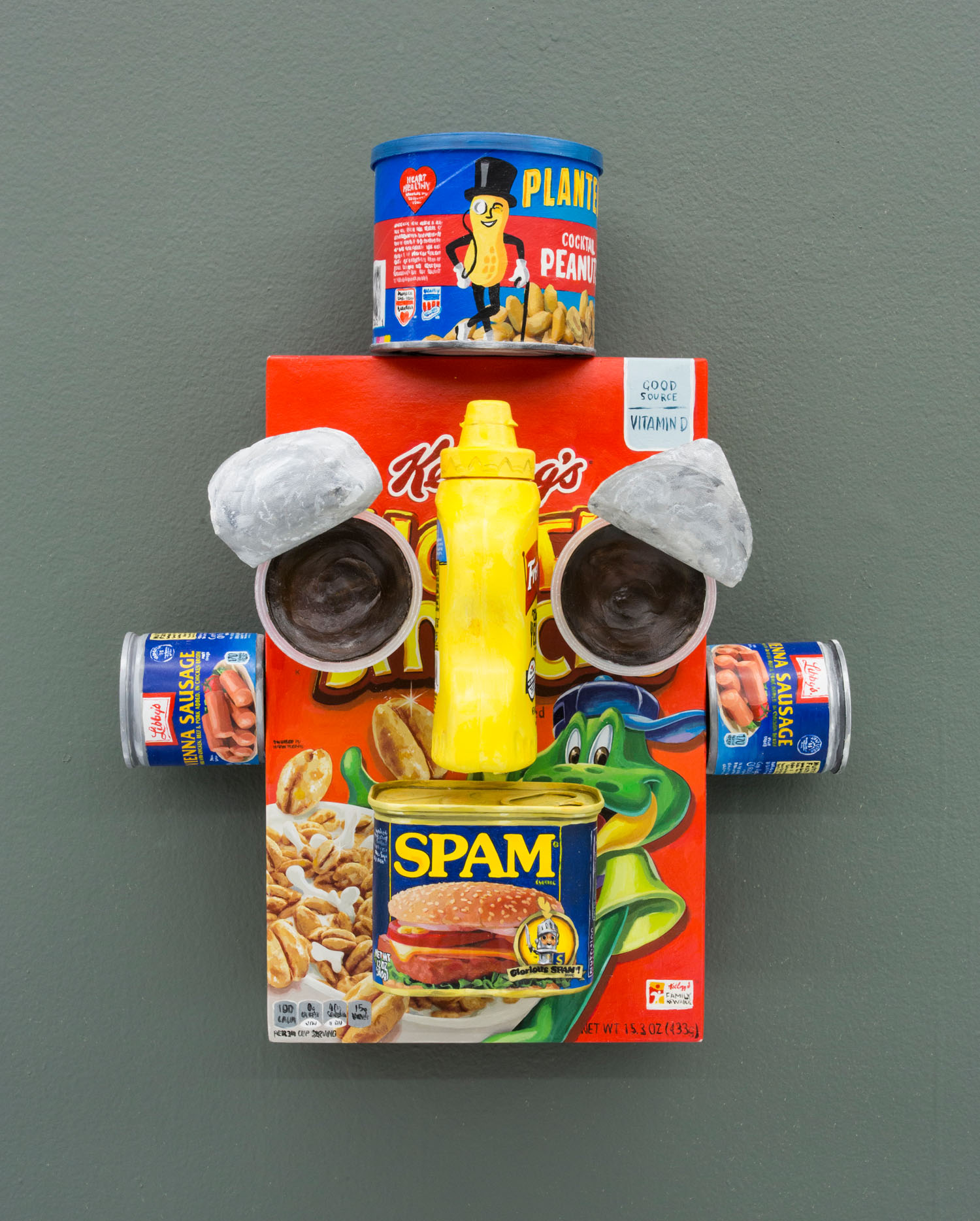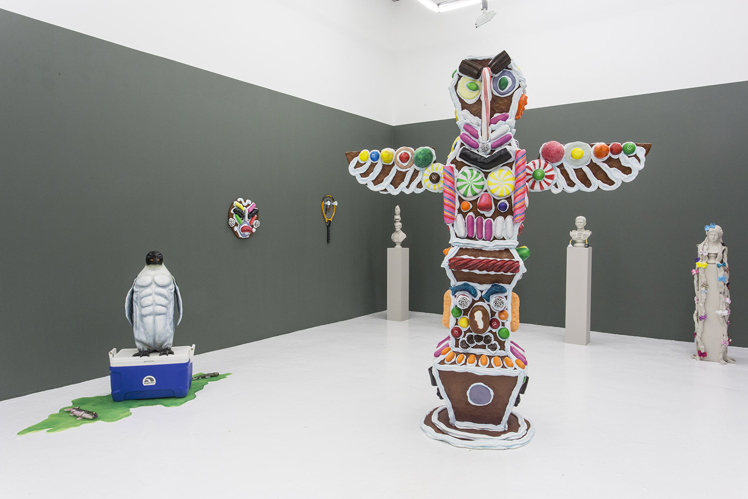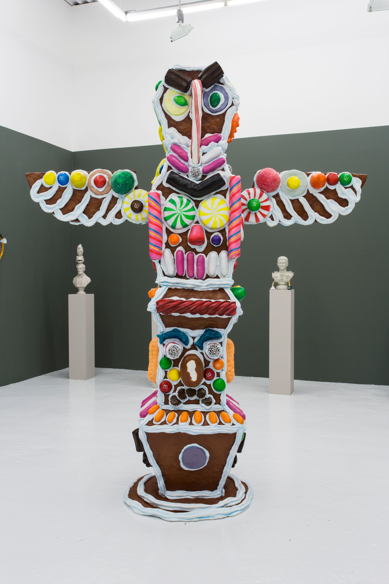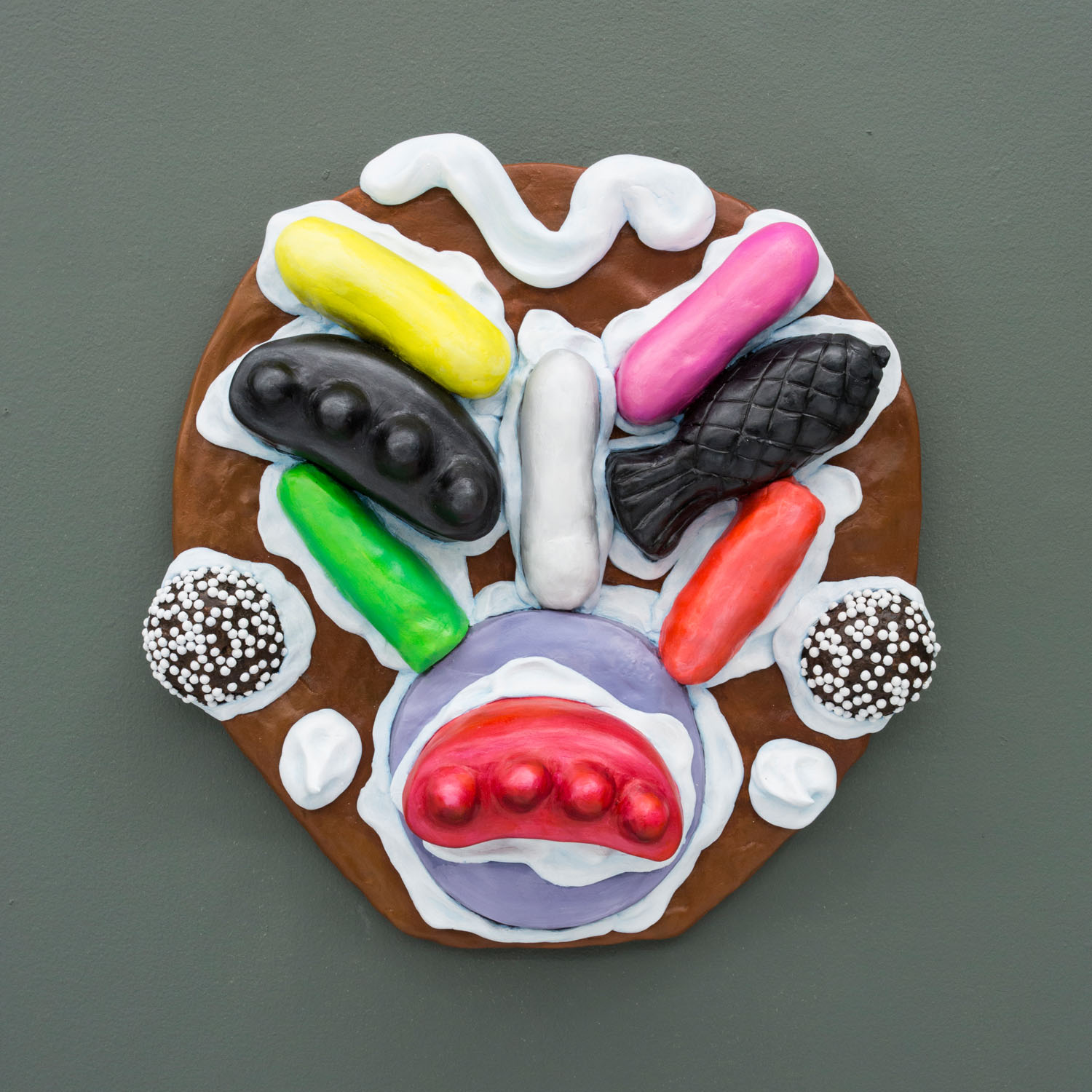 The largest sculpture, M&M Odoodem, Like Totally Totem Polarized, introduces a Google-search visual language that informs their work; a gingerbread house-styled totem pole. Carving the licorice, Mike ’N’ Ikes, gum drops and Snow Caps in a type of self-hardening clay then painting the sculpture, the artists simulate gingerbread and icing architecture festooned with colorful candy. Along the walls gingerbread-styled masks continue this “pantheon” of sorts jumping stylistically around the globe of ancient art and craft with a “because LOL nothing matters” vibe.
