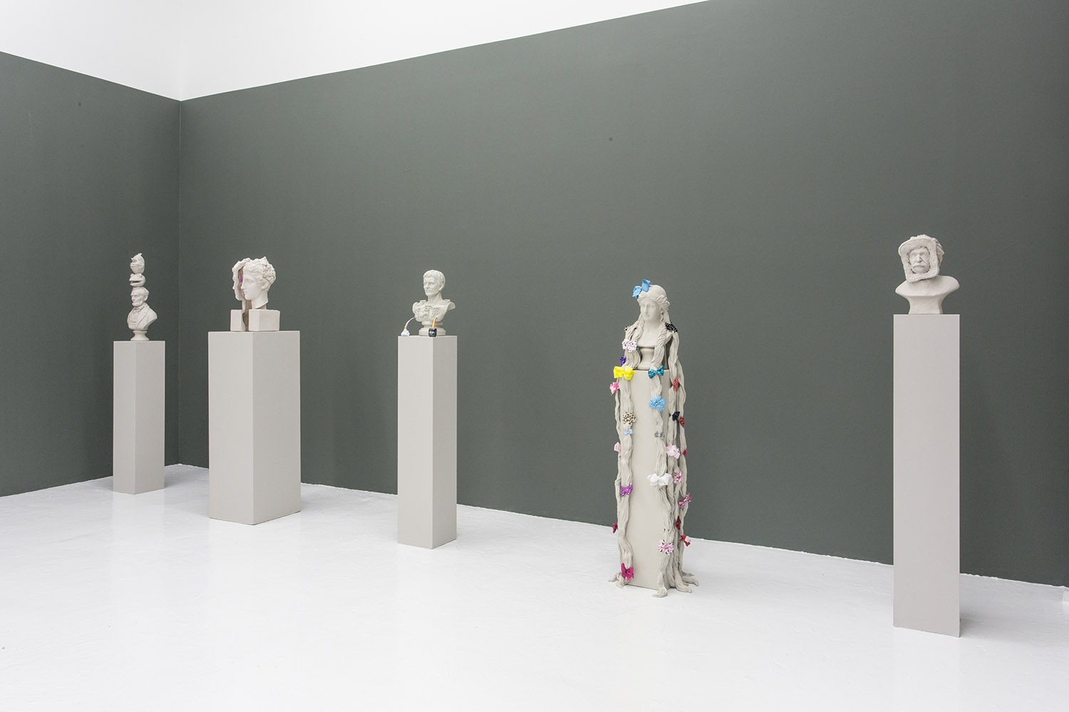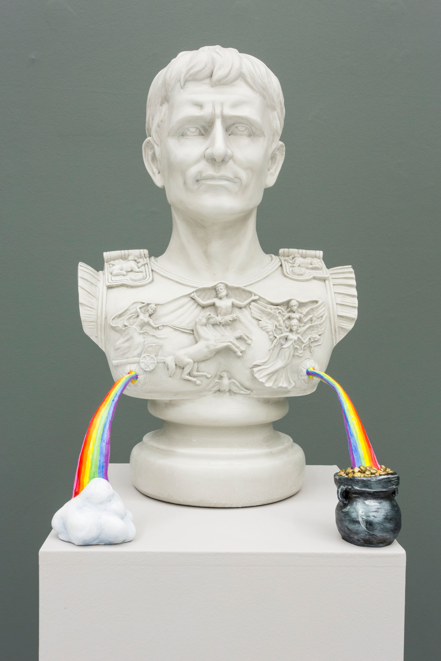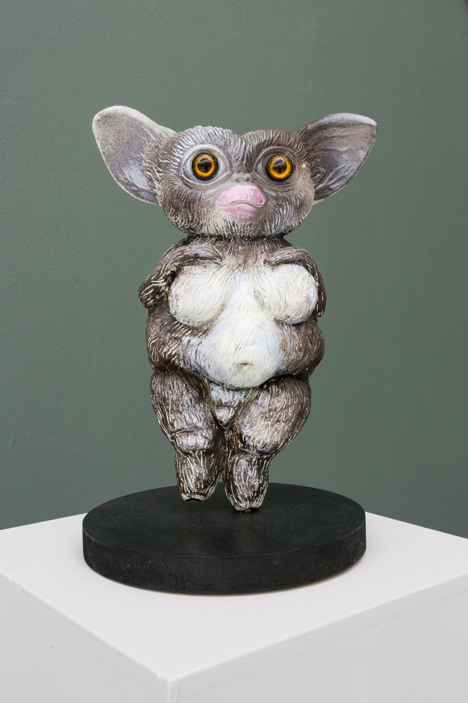 Cultural appropriation is further examined in adulterated busts proliferating on pedestals, where sculpted elements have been added to remix the history depicted–a bust of Einstein reimagined through the “breading” meme–and a replica on the Venus of Willendorf relic meticulously re-sculptued and painted into a zaftig Gremlin.
