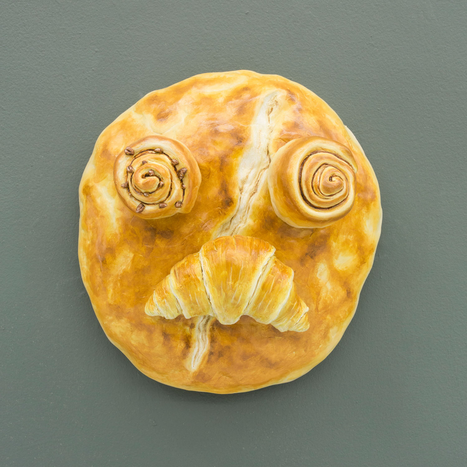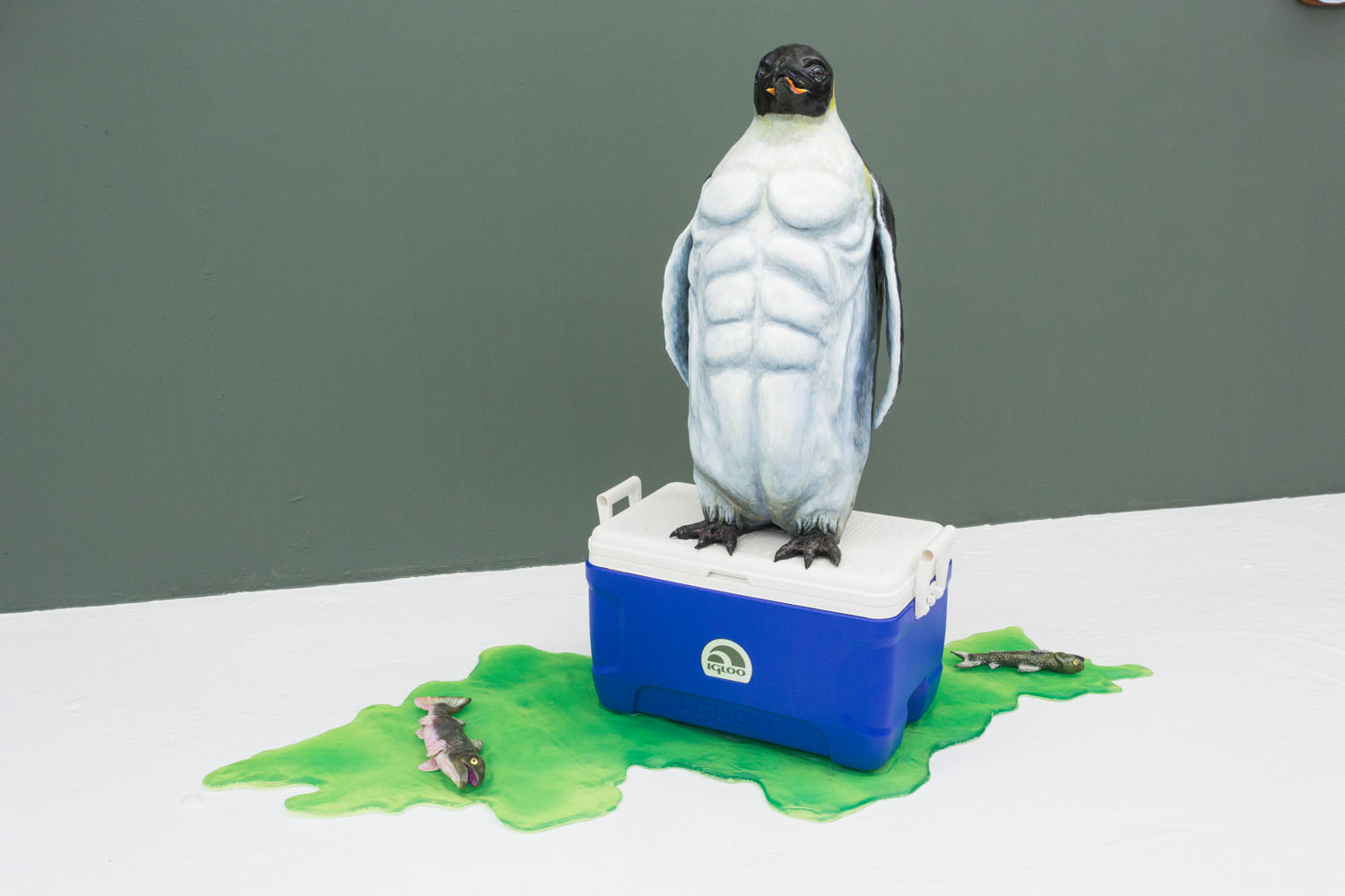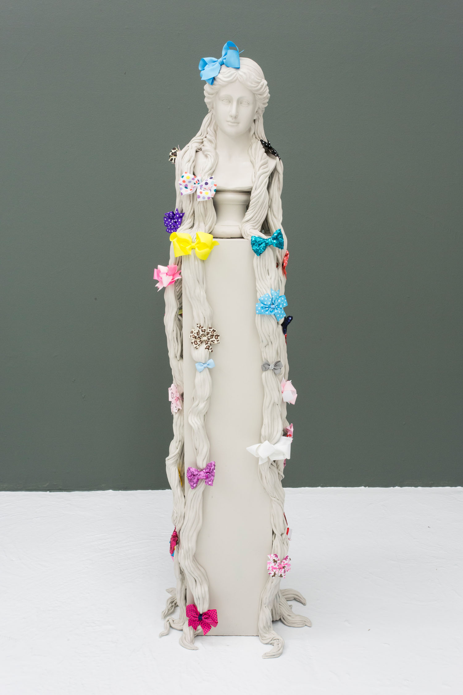 Cultural appropriation is further examined in adulterated busts proliferating on pedestals, where sculpted elements have been added to remix the history depicted–a bust of Einstein reimagined through the “breading” meme–and a replica on the Venus of Willendorf relic meticulously re-sculptued and painted into a zaftig Gremlin.