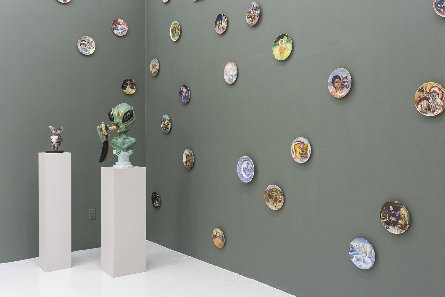 Also included in the show are a collection of commemorative plates the artists have “improved upon” with paint. From saccharine nostalgia scenes and puppies to “whited out” images of Native Americans, the plates themselves offer a very unsettling glimpse into our cultural imagination. The artists pull out and make visible those unnerving elements by painting disturbances into the works: panties appear in a Norman Rockwell plate, Aliens land in the Wild West; a Prada bag on the arm of a Cherokee warrior; tits on a unicorn.