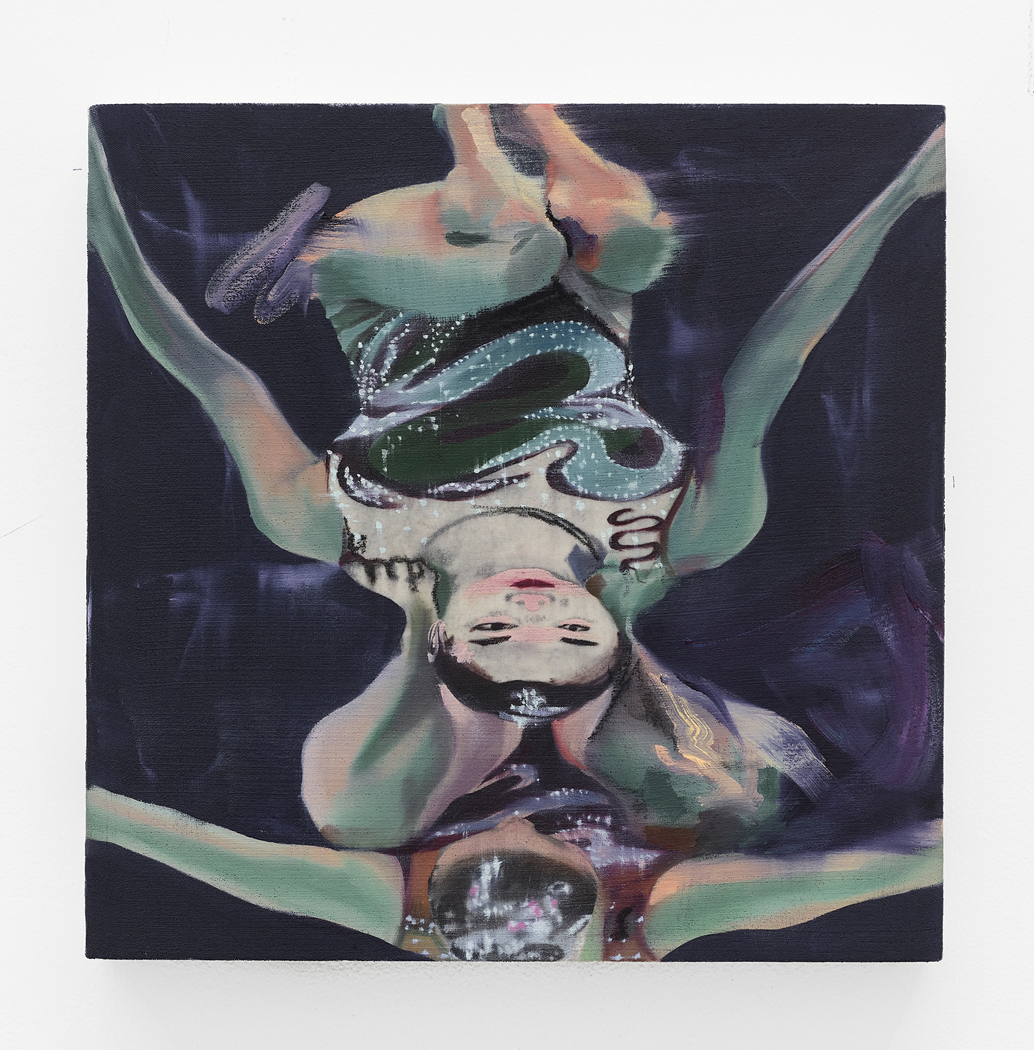 Ellen Hanson, Swimmers 2, 2023, oil and charcoal on jersey, 15.75 x 17.75 inches, 40 x 40 cm.