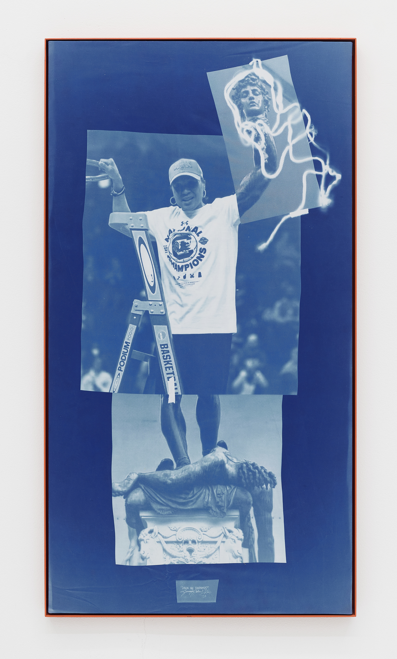 Jeremy John Kaplan, Dawn as Perseus, 2023, cyanotype on cotton in artist frame, 45 x 27 inches, 114 x 68.5 cm.