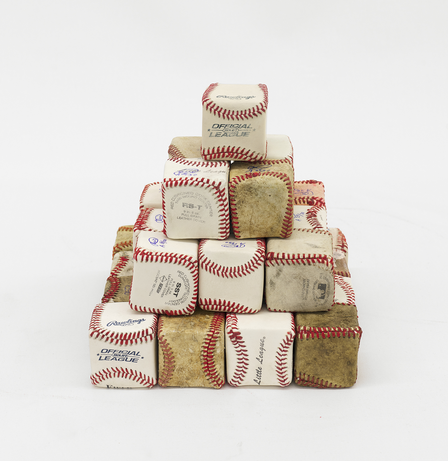 Royal Jarmon, Pastime Pyramid, 2018-2023, found baseballs over plaster, 9 x 9 x 9 inches, 23 x 23 x 23 cm.