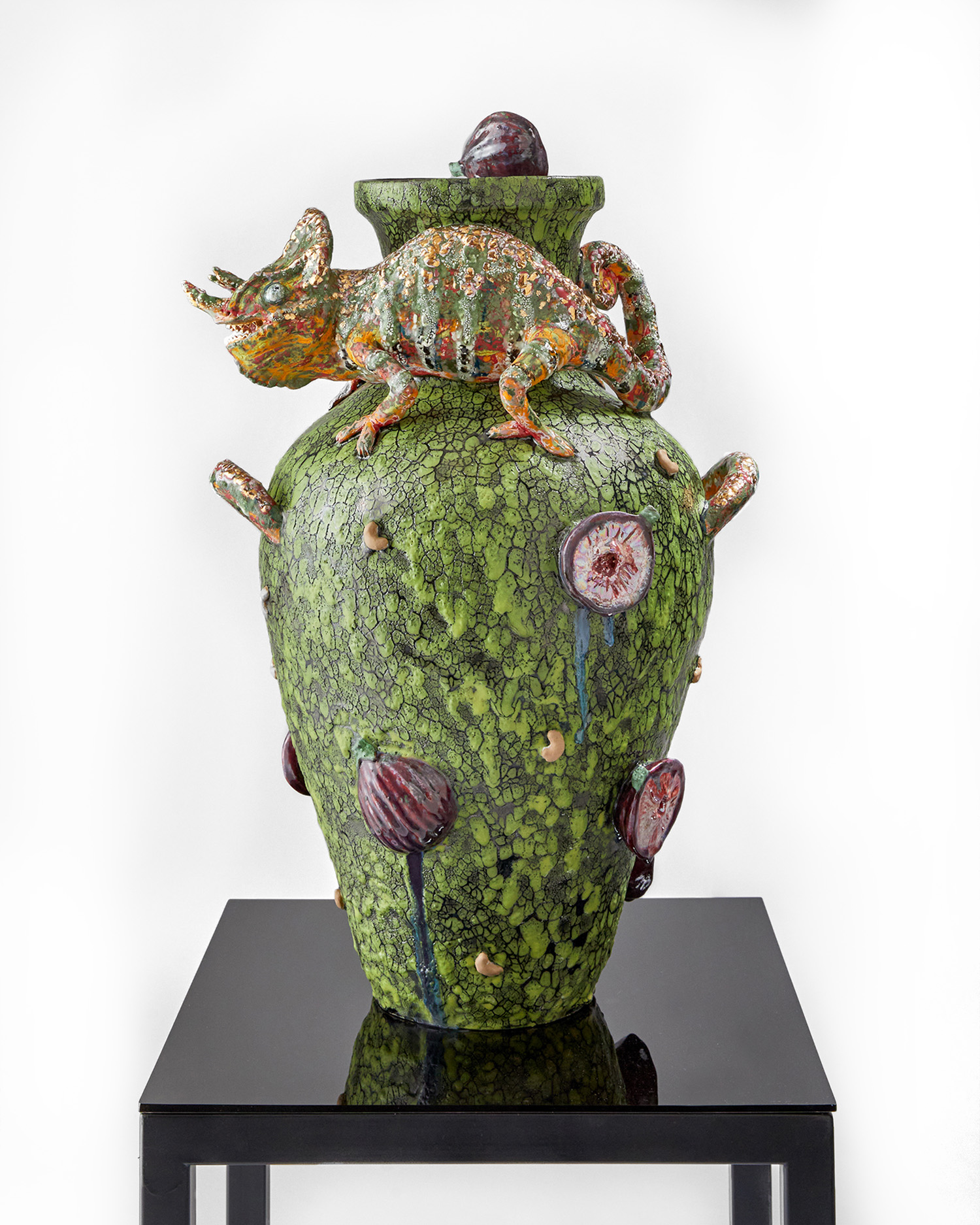 Roxanne Jackson, Camouflage (Chameleon Vase), 2022, ceramic, glaze, underglaze, luster, 25 x 16 x 13 inches, 64 x 41 x 33 cm
