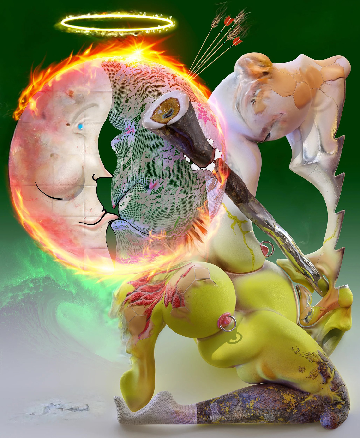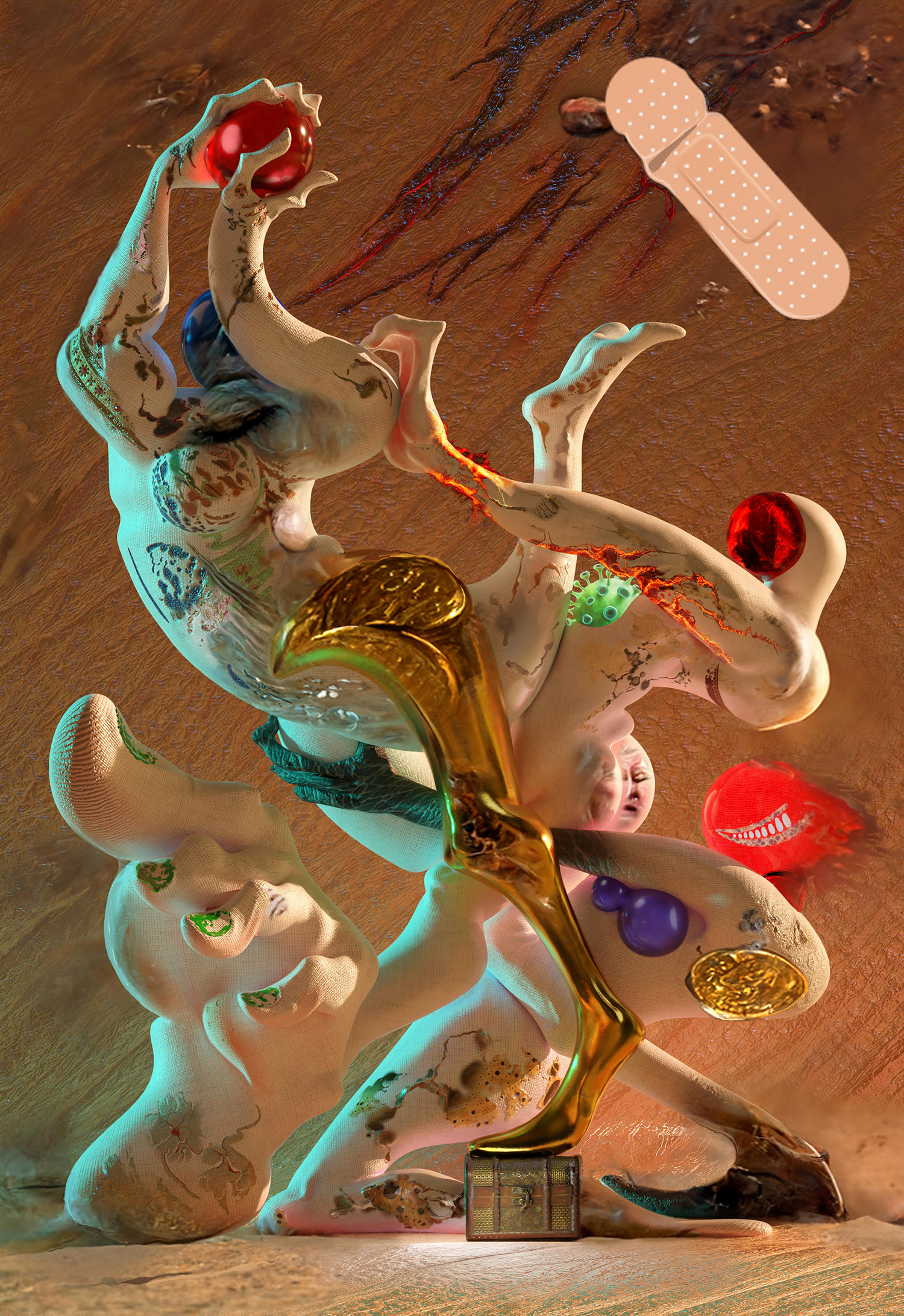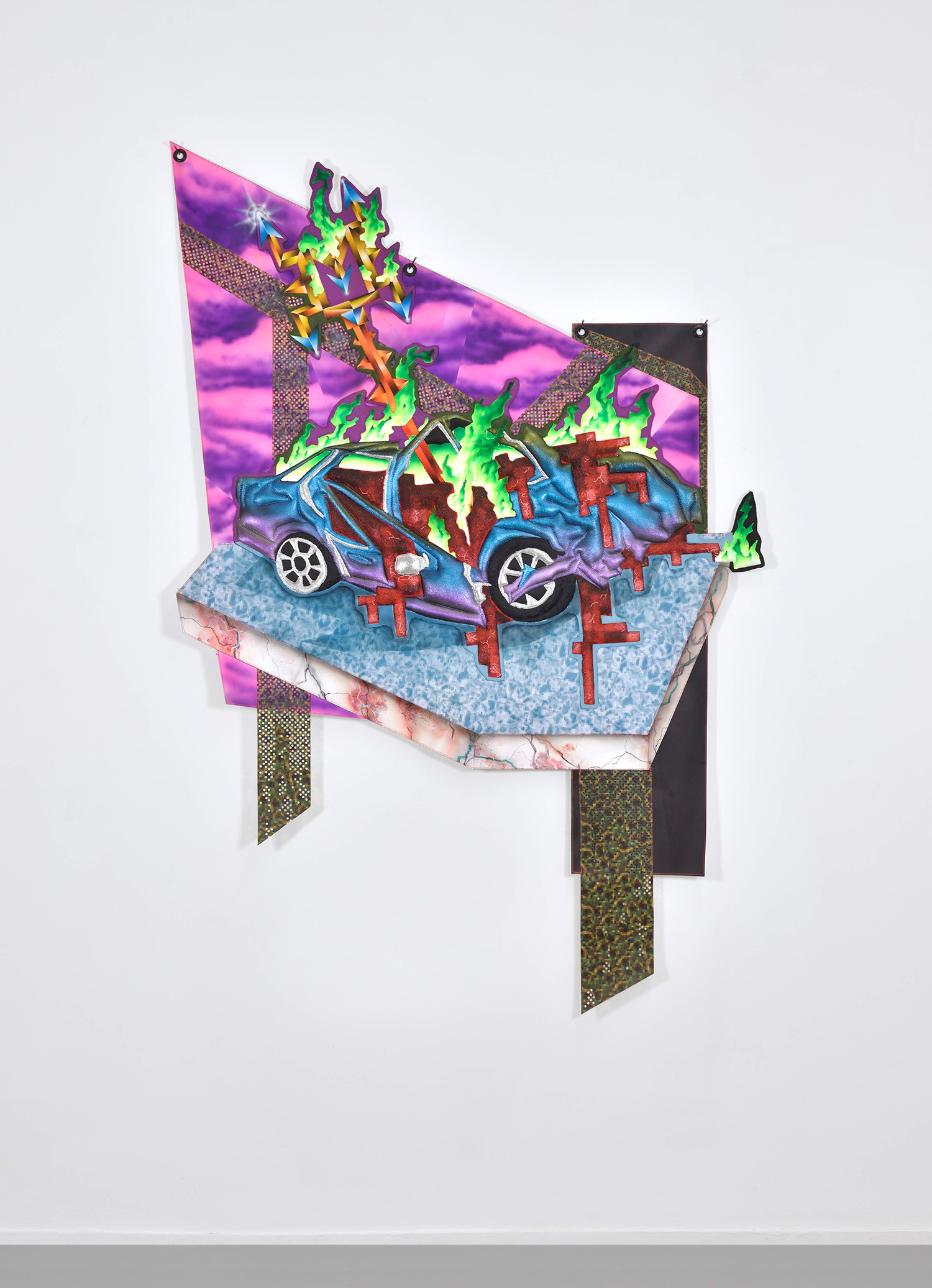 Kevin Bray, They Are Holding Him Back, 2022, printed on leatherette, PLA 3d print, foam, 69 x 47 inches 175 x 120 cm