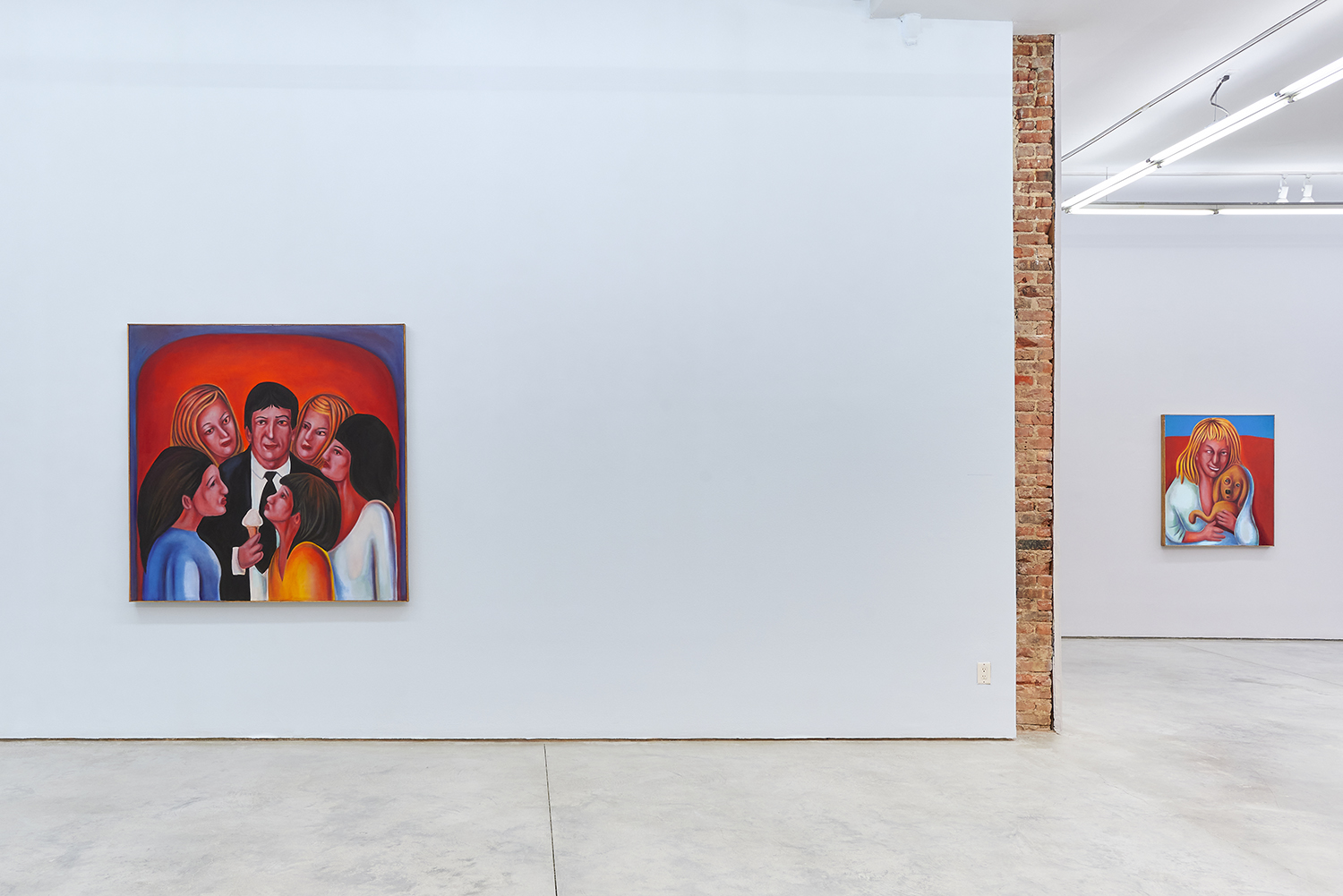 Stylistically, the paintings rethink the formal language of contemporary realism, referencing the sure-handed style of social realists like Thomas Hart Benton and the genre-bending irreverence of George Condo. There is deliberate brutality in the way subjects’ faces are rendered, their lazy red eyes and smushed-putty features seem to confront us with our voyeurism as if it is a joke we share: if you’ve ever accidentally opened the front camera on your phone, you already get it.