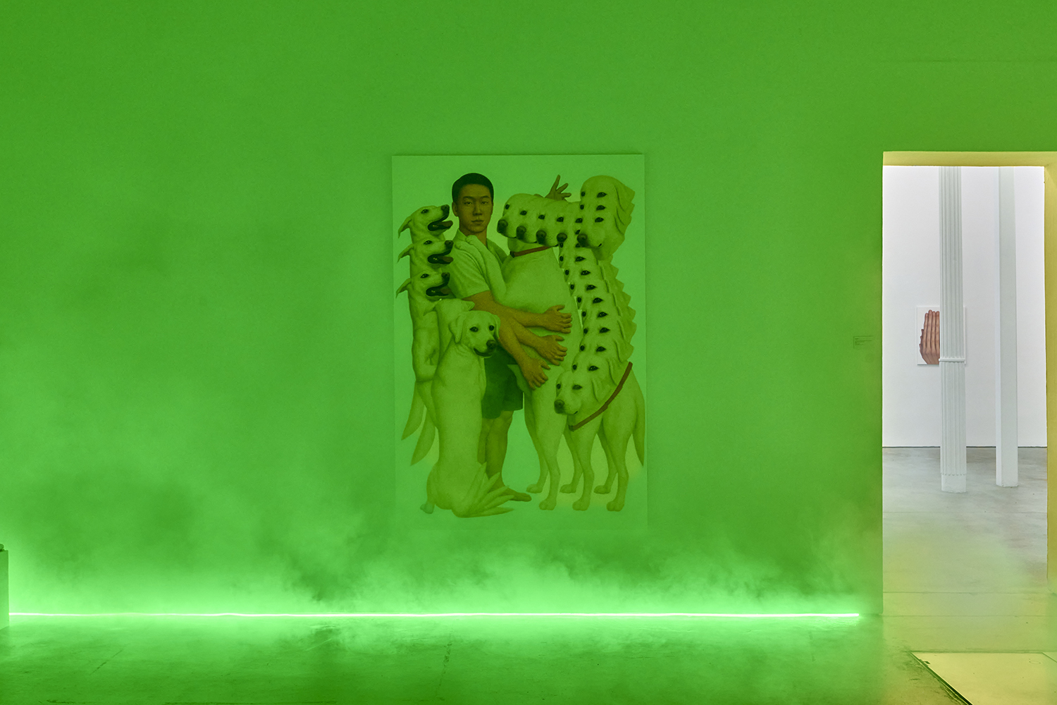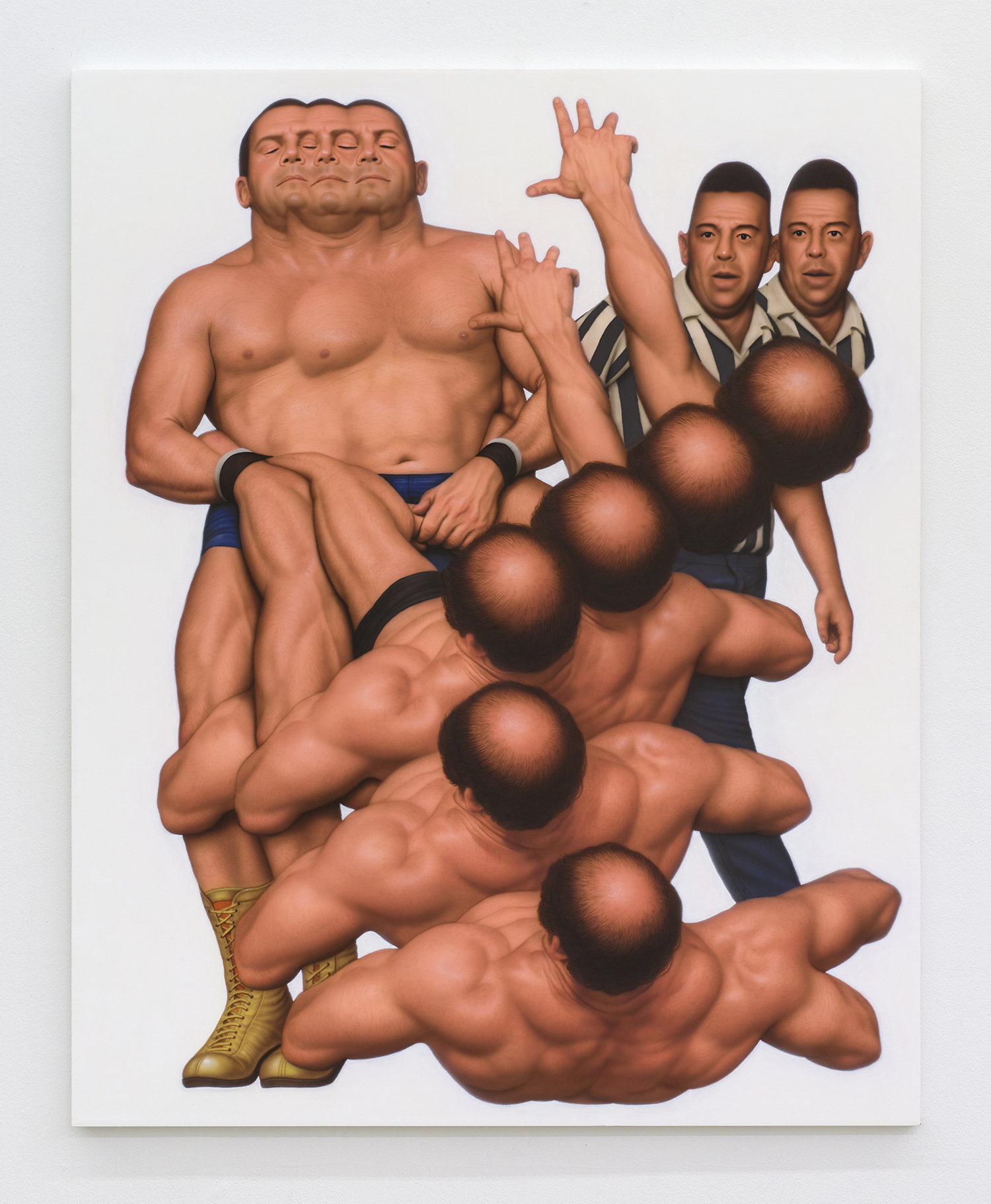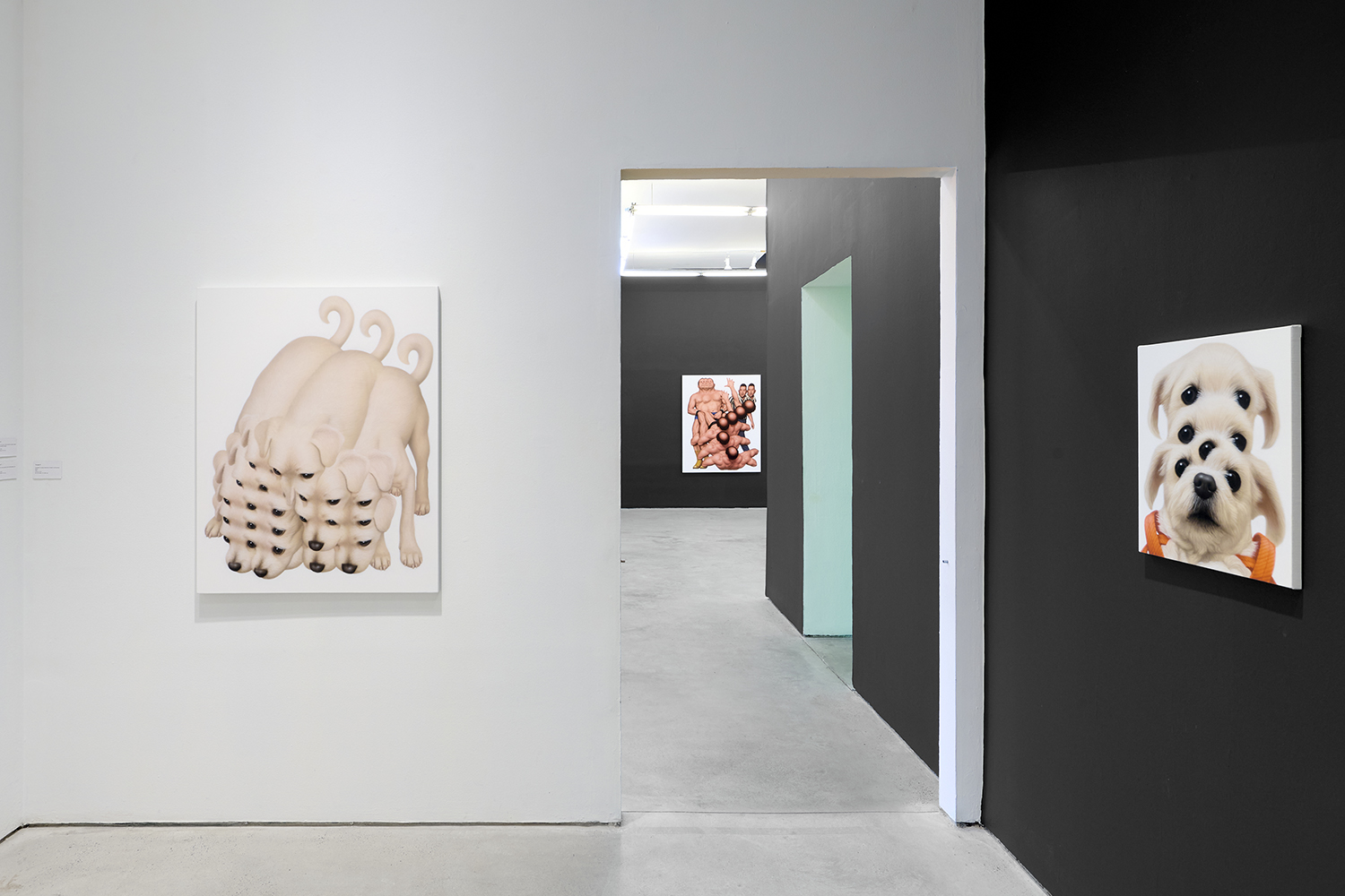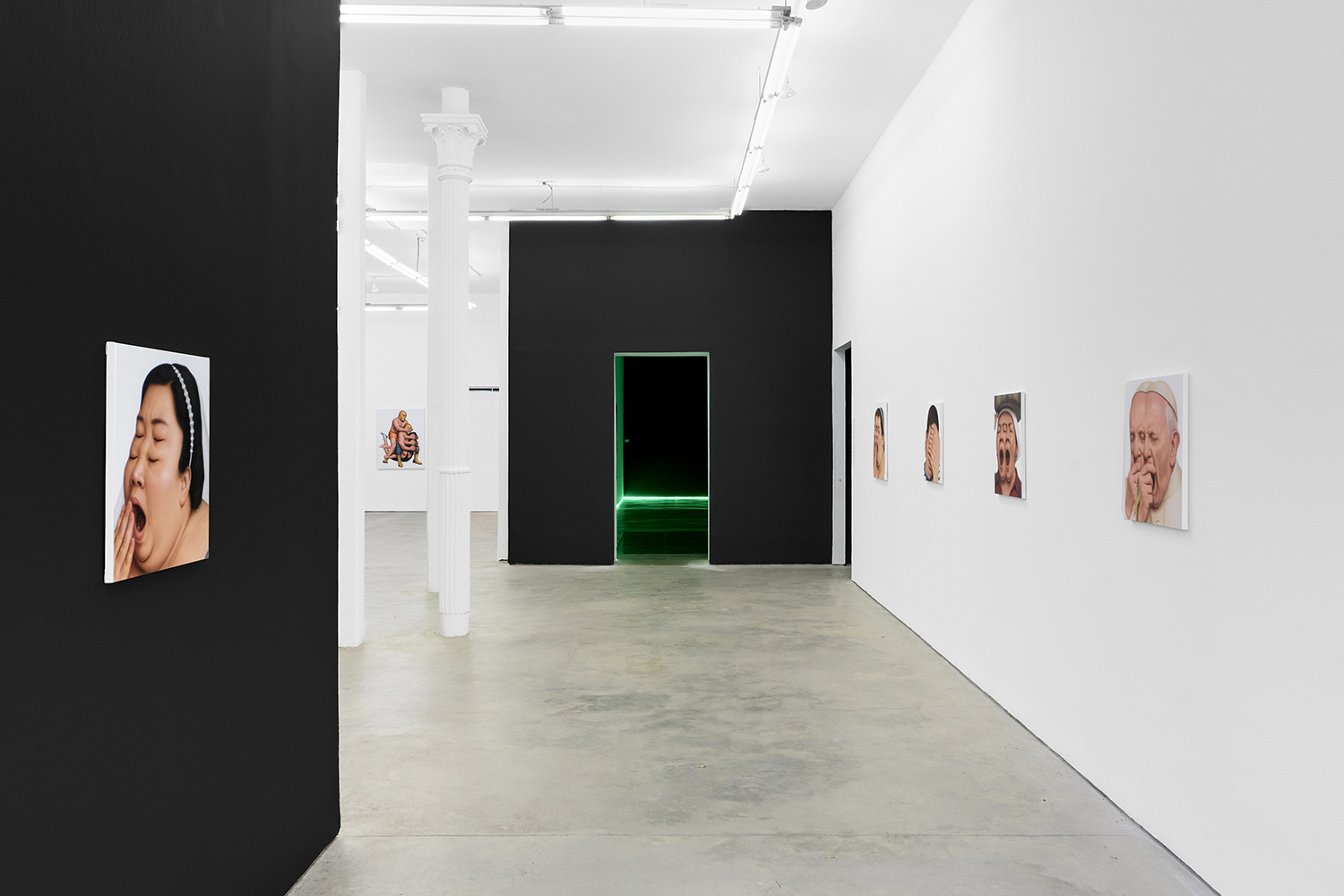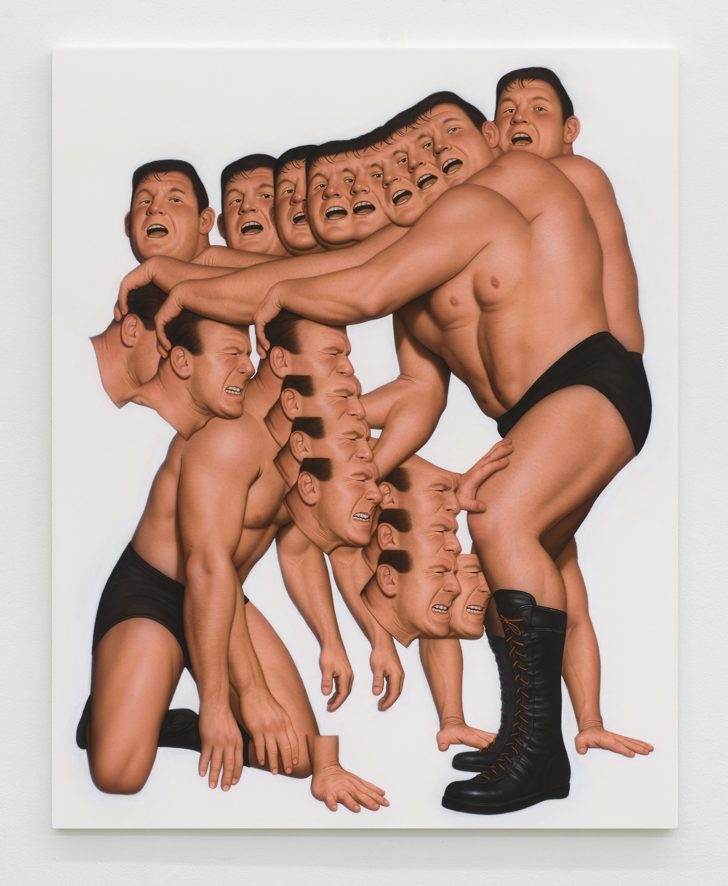 Themes in this show unfold across thirty paintings in four zones: the front gallery filled with yawning figures, the rear with wrestlers and referees locked in struggle, a small side room devoted entirely to dogs, and the large green “lab” where new experiments take shape. A dark humor haunts these scenes: the painting titles circle ideas of obedience and training, choreography and competition, power and artifice. They puncture solemnity—Portrait of one who pretends to listen while secretly worrying when the conversation will end or Portrait of someone forcing a faint smile while hiding the envy at a friend’s success—turning existential unease into wry self-awareness. Taken together in this Mutant Lab, these rooms form a kind of behavioral study: a world in which every gesture, impulse and repetition becomes data.