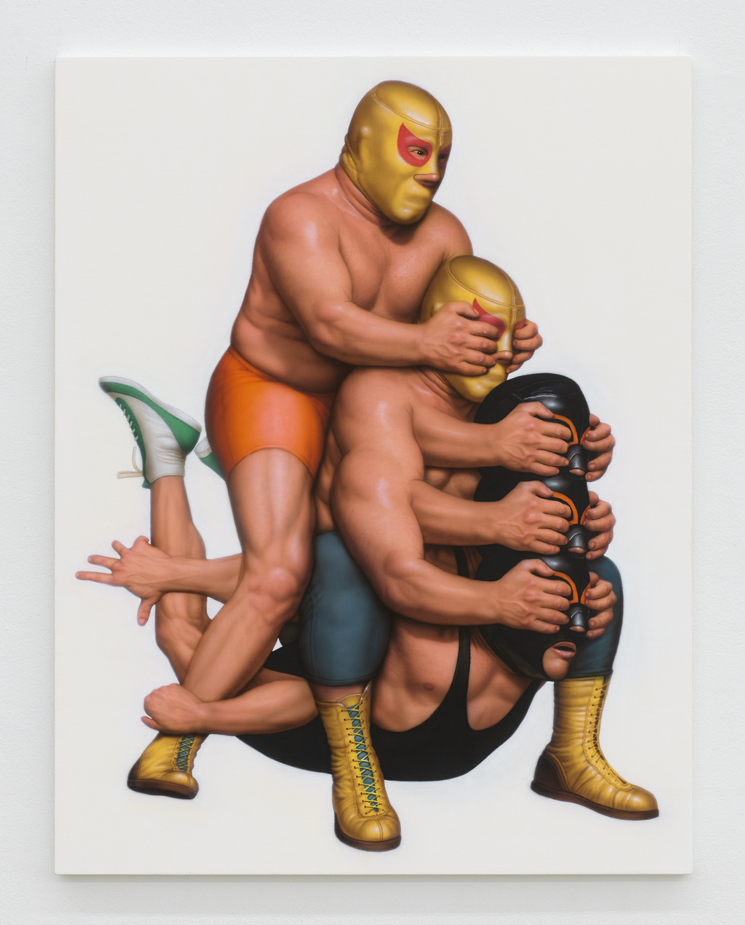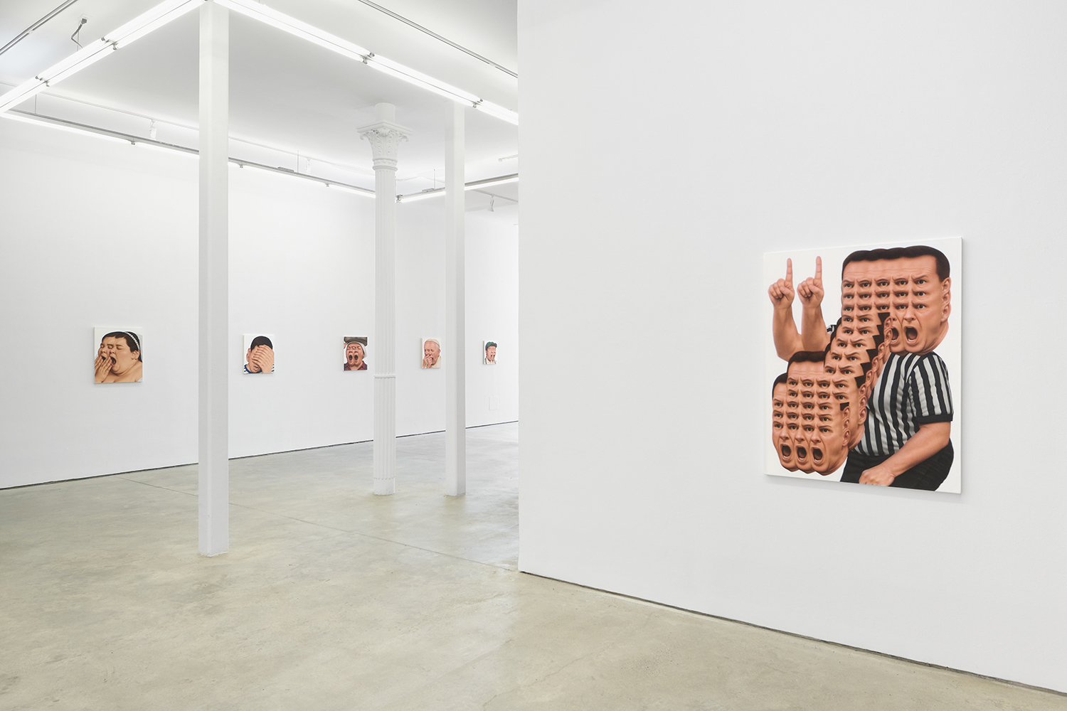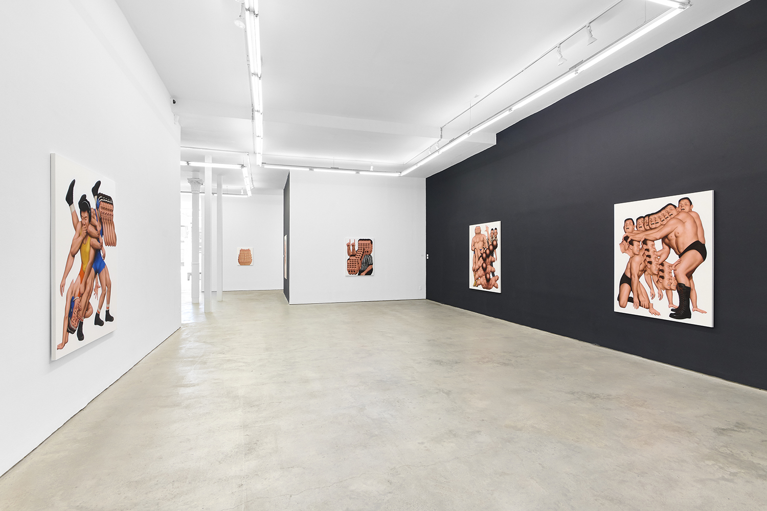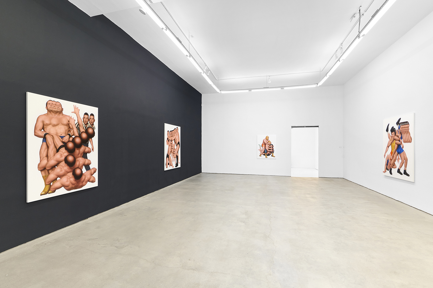 Themes in this show unfold across thirty paintings in four zones: the front gallery filled with yawning figures, the rear with wrestlers and referees locked in struggle, a small side room devoted entirely to dogs, and the large green “lab” where new experiments take shape. A dark humor haunts these scenes: the painting titles circle ideas of obedience and training, choreography and competition, power and artifice. They puncture solemnity—Portrait of one who pretends to listen while secretly worrying when the conversation will end or Portrait of someone forcing a faint smile while hiding the envy at a friend’s success—turning existential unease into wry self-awareness. Taken together in this Mutant Lab, these rooms form a kind of behavioral study: a world in which every gesture, impulse and repetition becomes data.