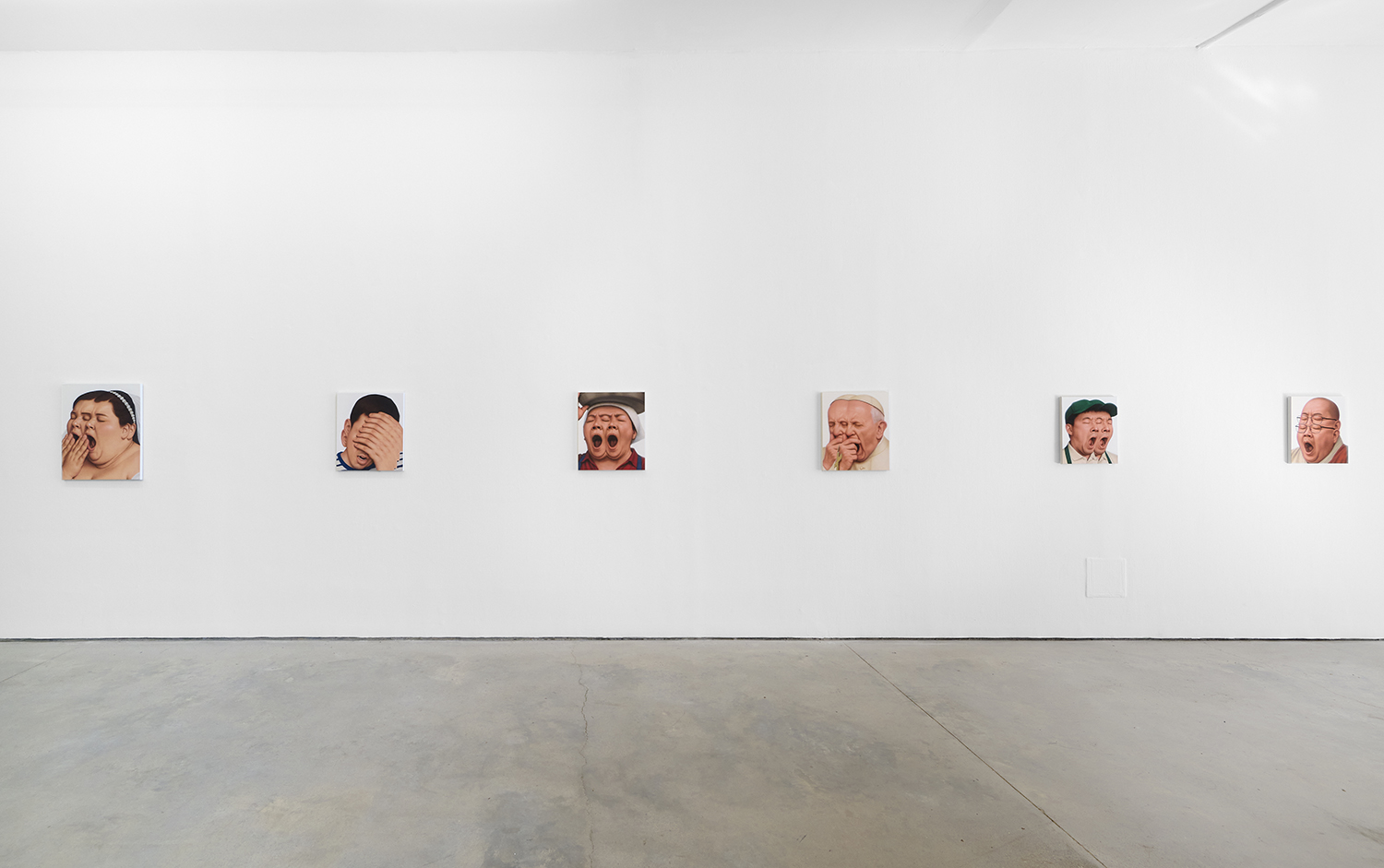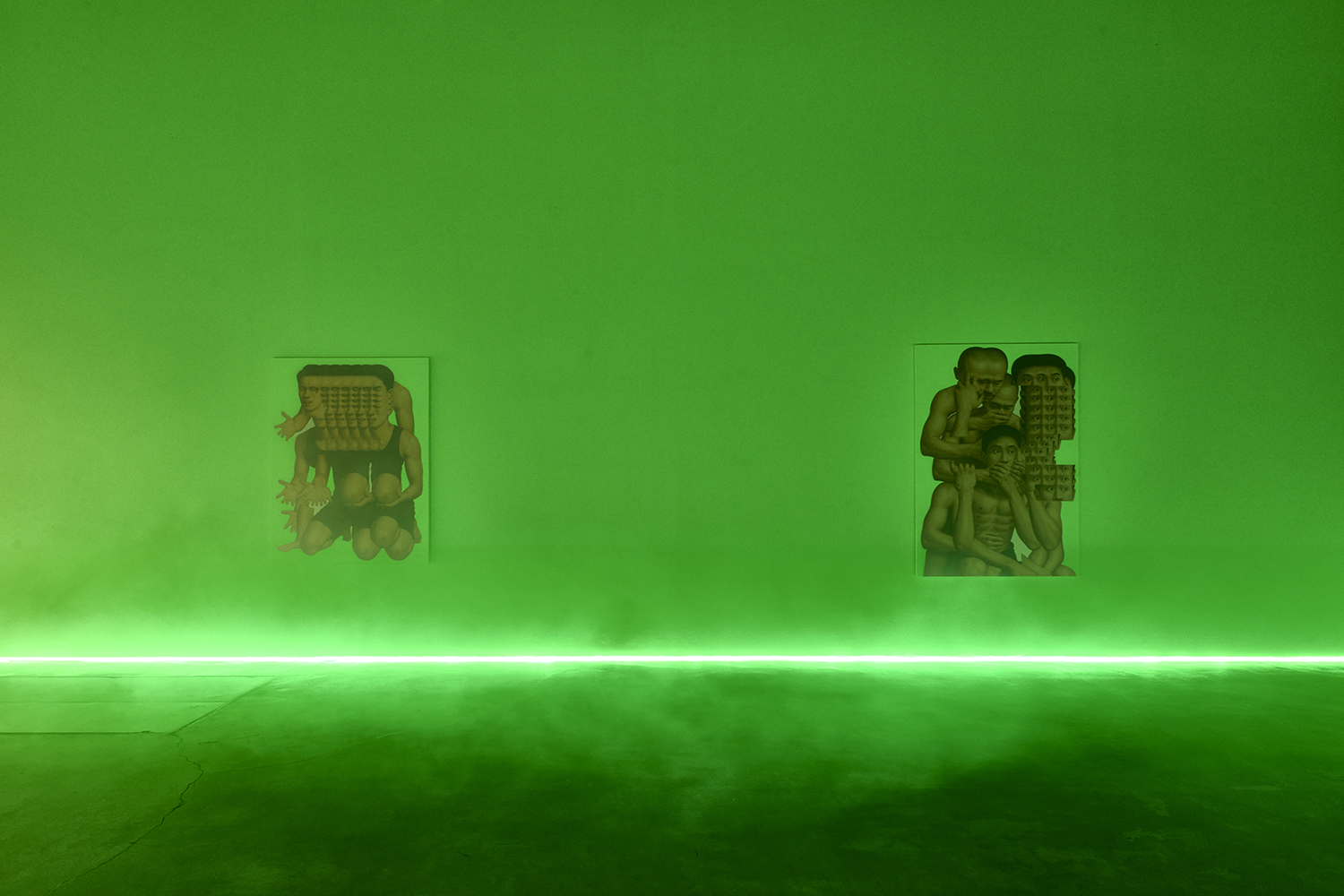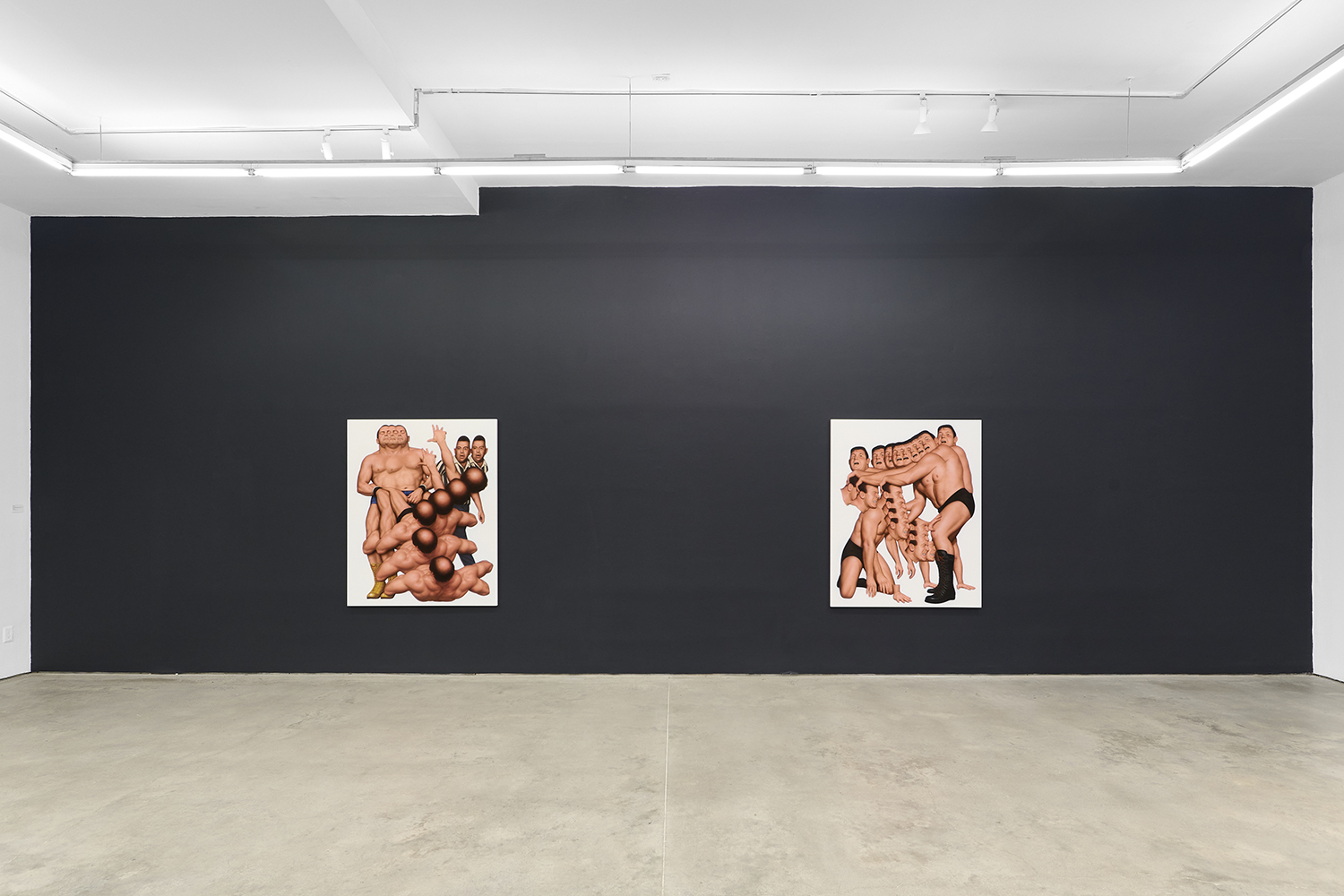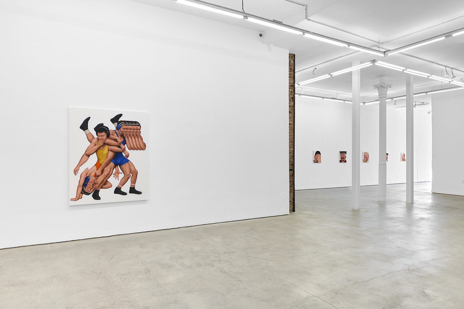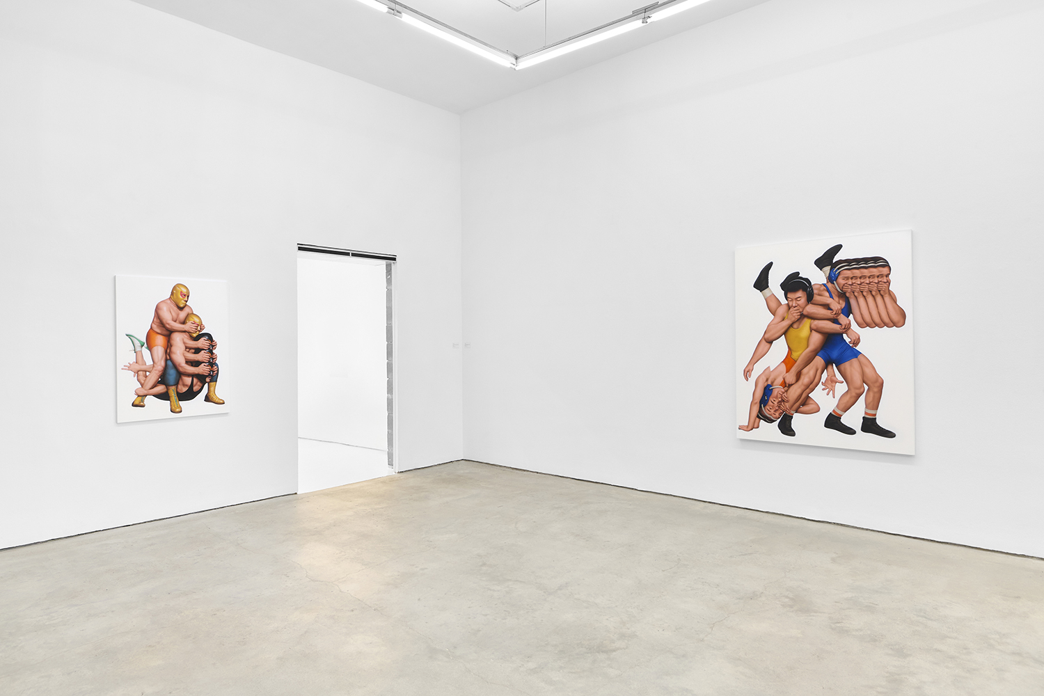 Themes in this show unfold across thirty paintings in four zones: the front gallery filled with yawning figures, the rear with wrestlers and referees locked in struggle, a small side room devoted entirely to dogs, and the large green “lab” where new experiments take shape. A dark humor haunts these scenes: the painting titles circle ideas of obedience and training, choreography and competition, power and artifice. They puncture solemnity—Portrait of one who pretends to listen while secretly worrying when the conversation will end or Portrait of someone forcing a faint smile while hiding the envy at a friend’s success—turning existential unease into wry self-awareness. Taken together in this Mutant Lab, these rooms form a kind of behavioral study: a world in which every gesture, impulse and repetition becomes data.