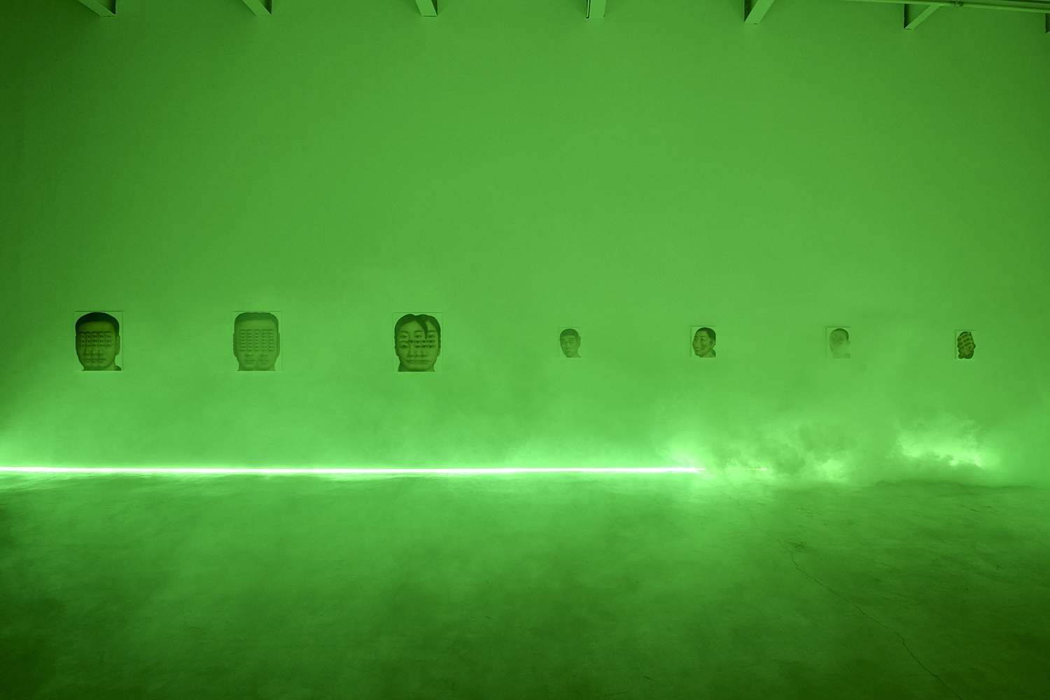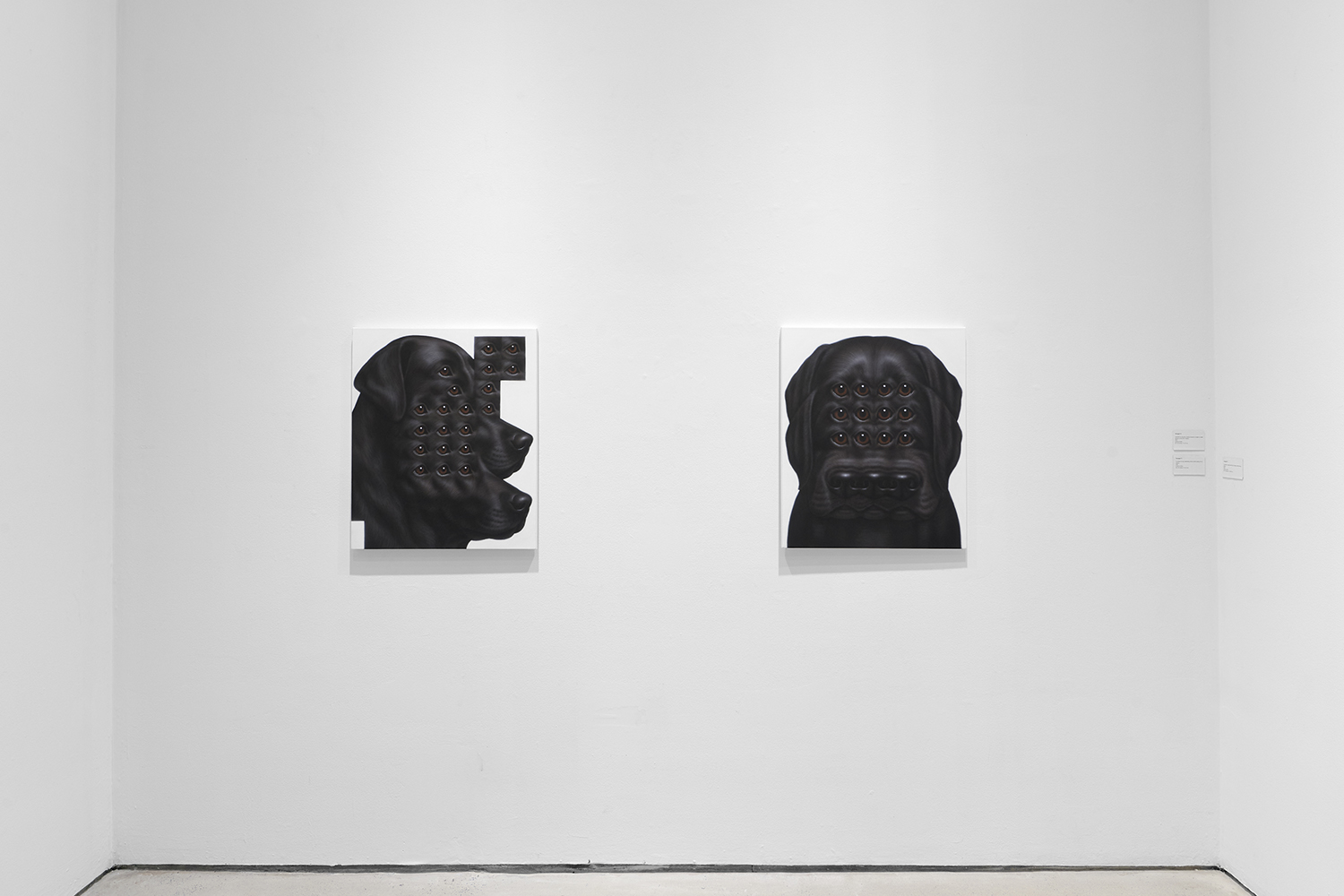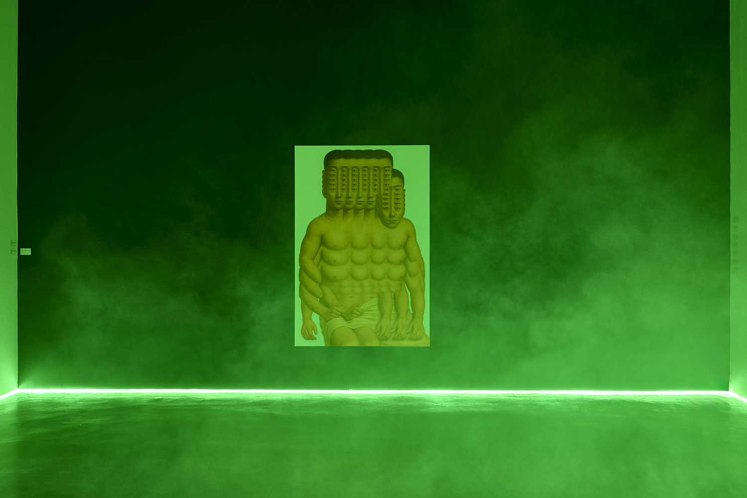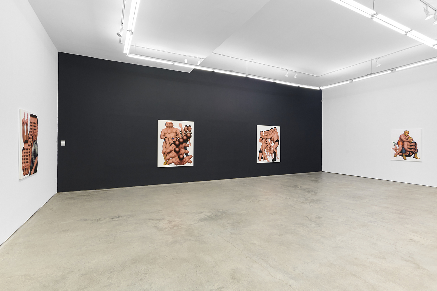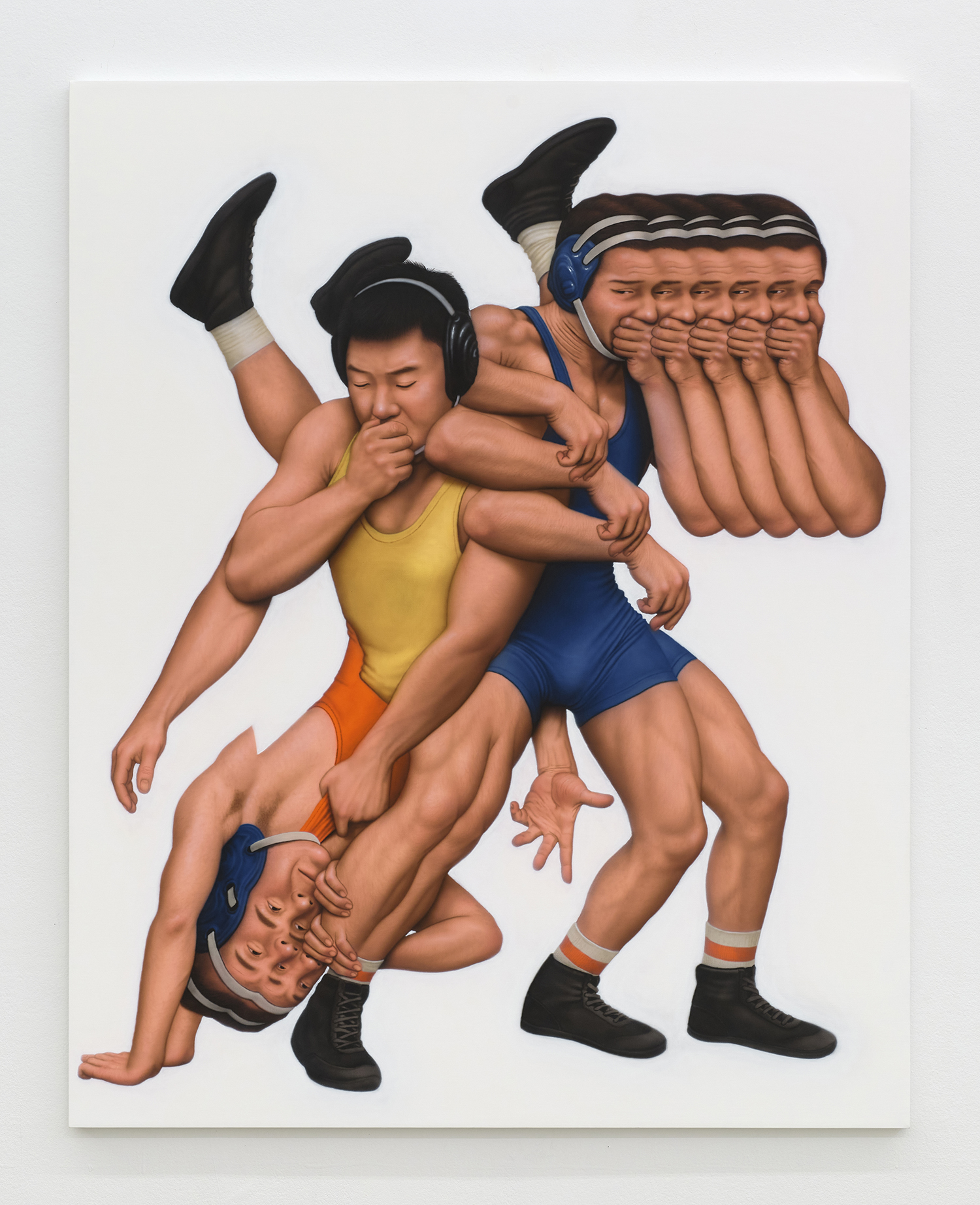 Themes in this show unfold across thirty paintings in four zones: the front gallery filled with yawning figures, the rear with wrestlers and referees locked in struggle, a small side room devoted entirely to dogs, and the large green “lab” where new experiments take shape. A dark humor haunts these scenes: the painting titles circle ideas of obedience and training, choreography and competition, power and artifice. They puncture solemnity—Portrait of one who pretends to listen while secretly worrying when the conversation will end or Portrait of someone forcing a faint smile while hiding the envy at a friend’s success—turning existential unease into wry self-awareness. Taken together in this Mutant Lab, these rooms form a kind of behavioral study: a world in which every gesture, impulse and repetition becomes data.