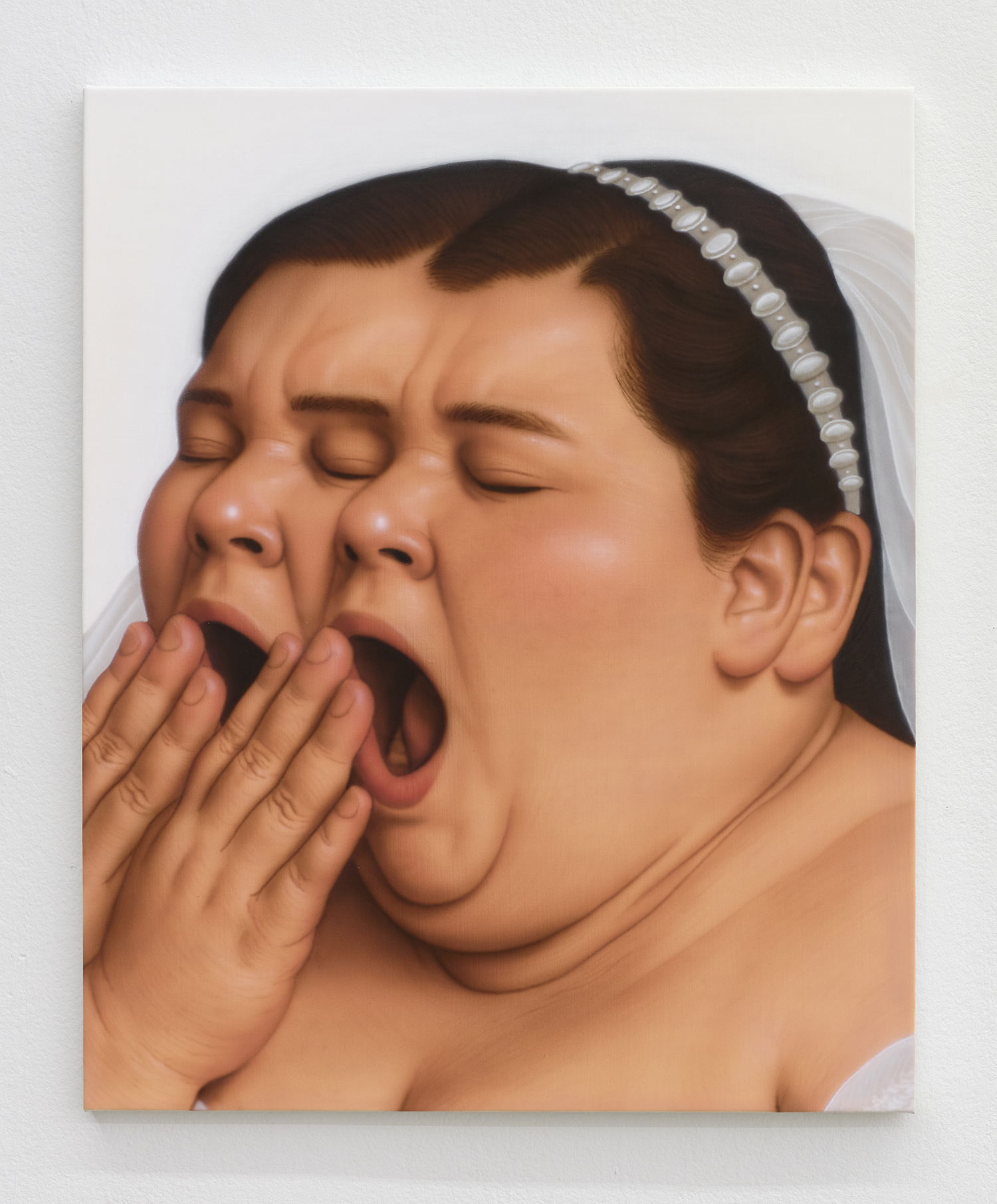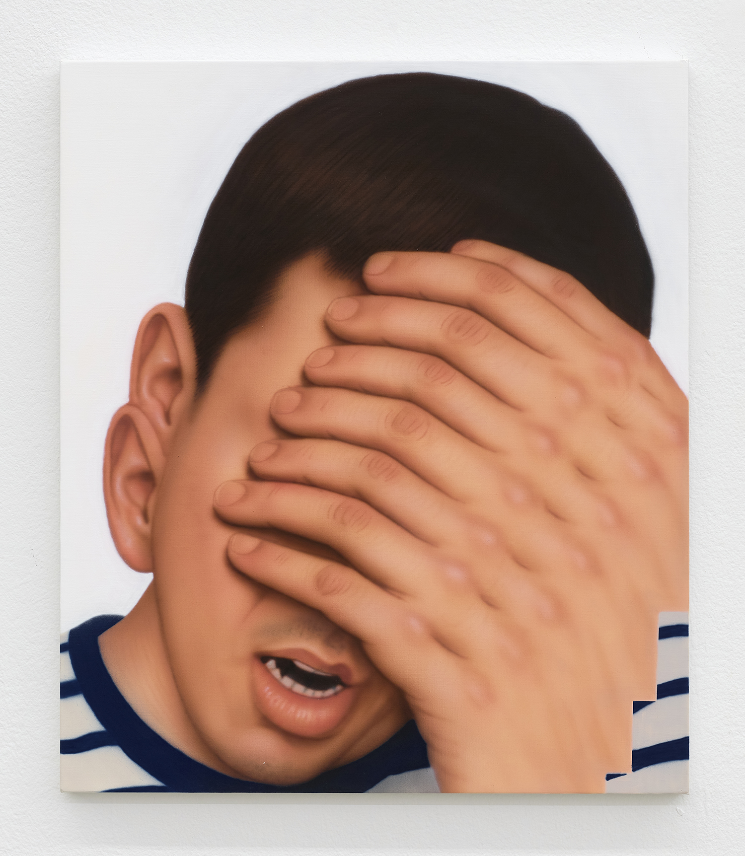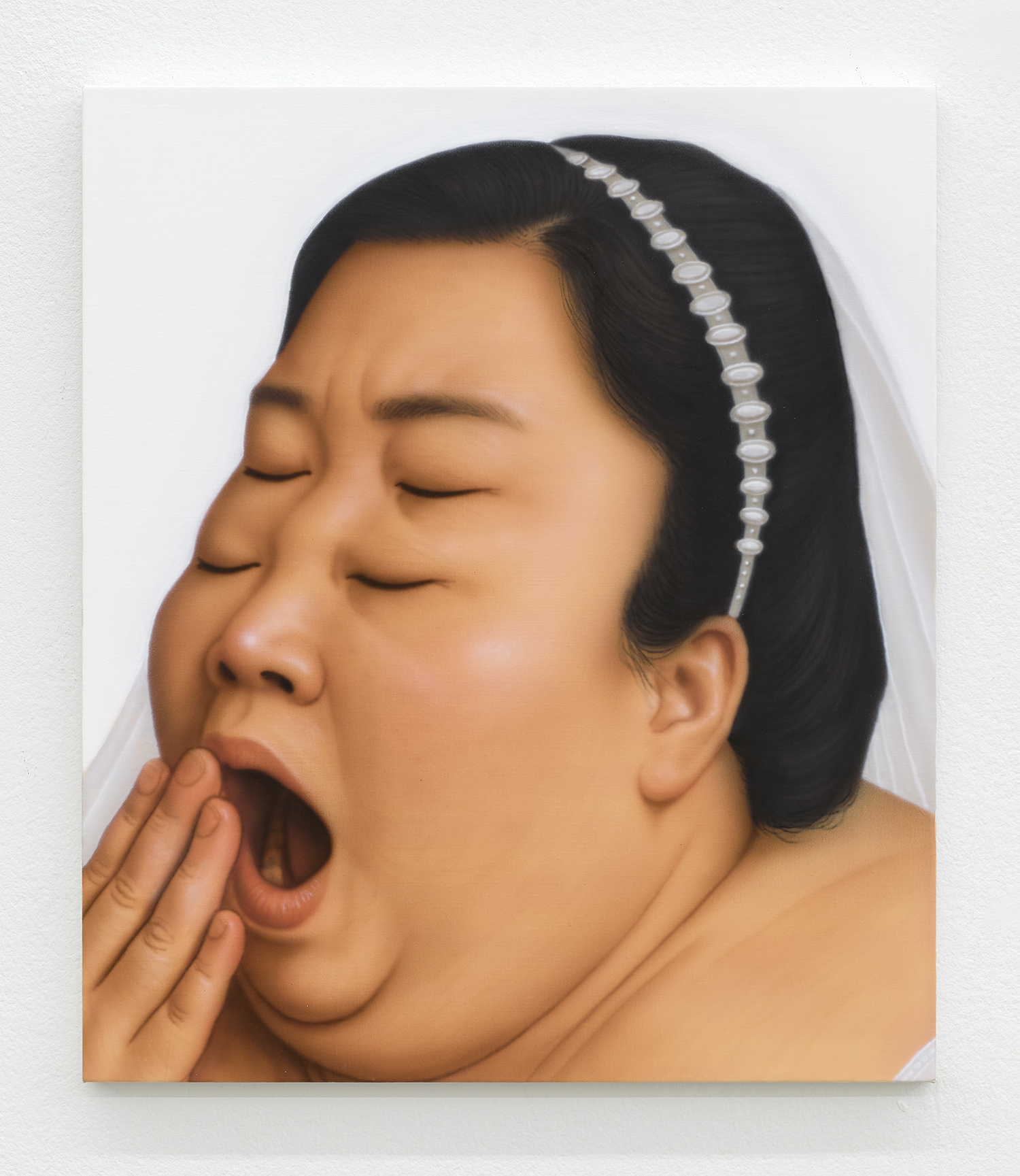 Younguk Yi, A portrait of one covering the face to stifle a secret yawn, 2025, acrylic on linen, 21 x 18 inches, 53 x 46 cm.