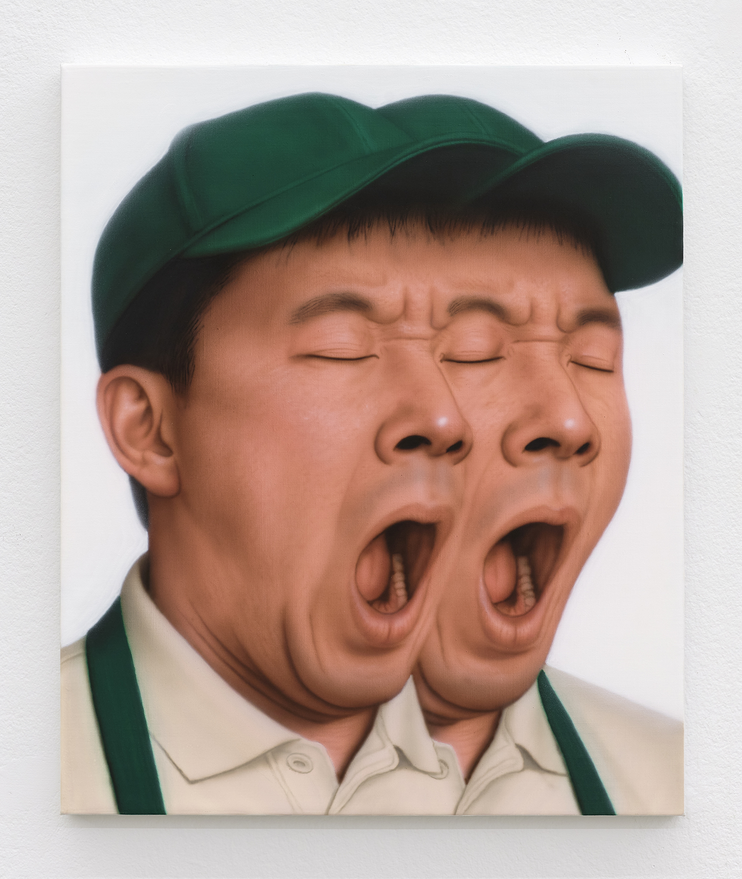 Younguk Yi, A portrait of one mocking the shackles called diligence and hard work, while confessing helplessness, 2025, acrylic on linen, 21 x 18 inches, 53 x 46 cm.