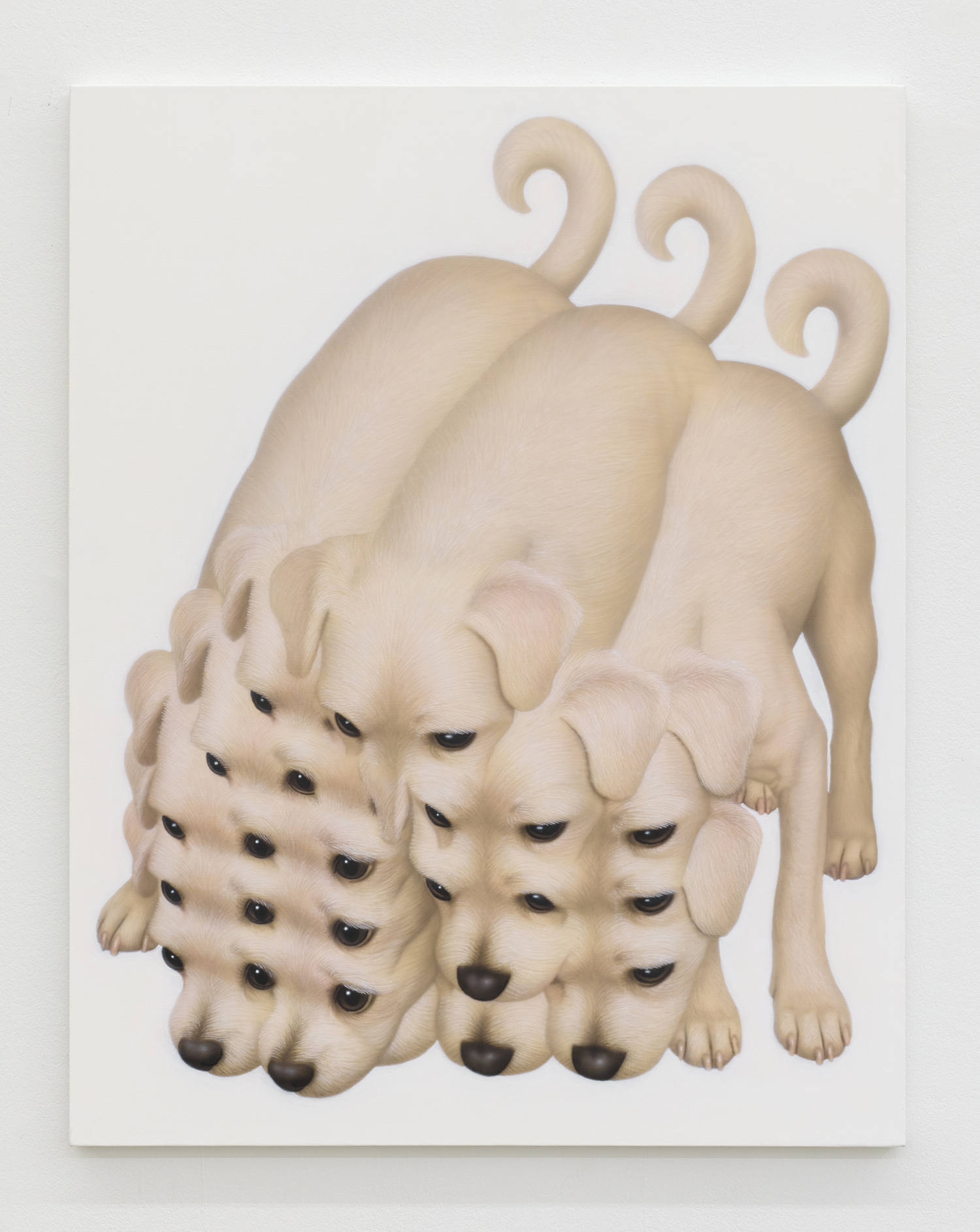 Younguk Yi, A portrait of a puppy searching for treats in all the wrong places, 2025, acrylic on linen, 44 x 35 inches, 112 x 89 cm.