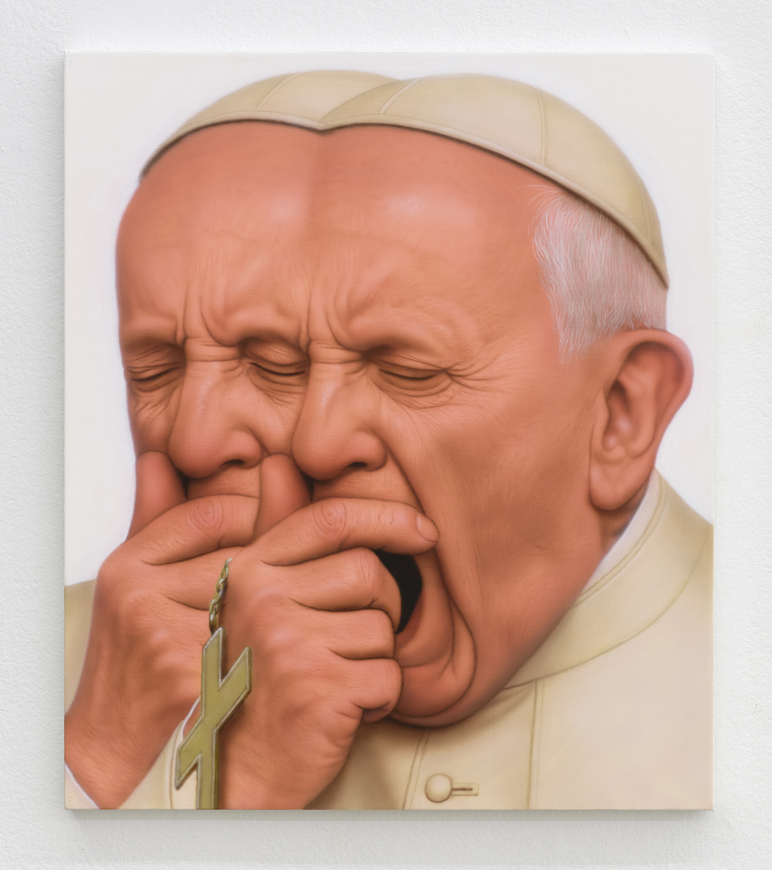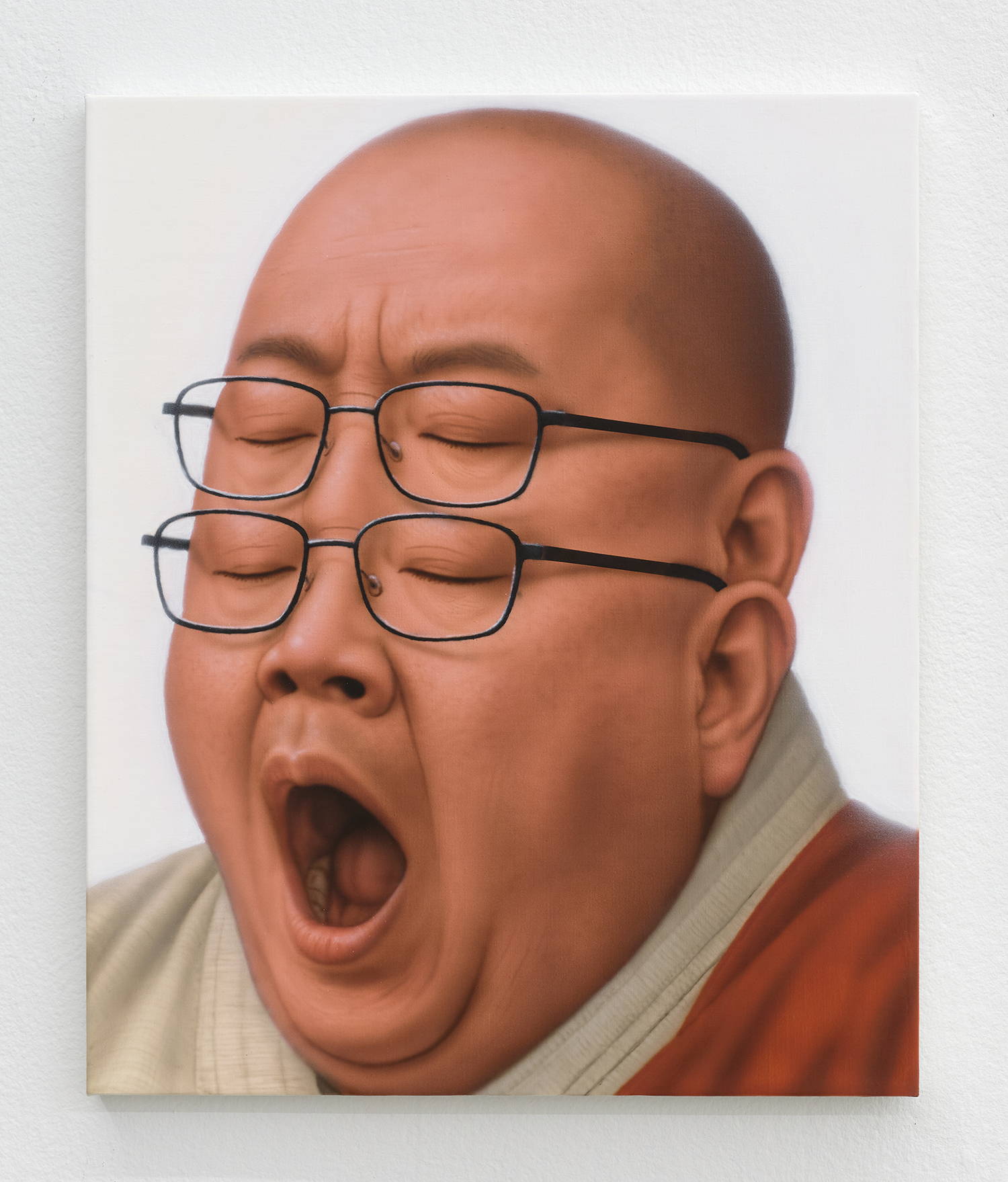 Younguk Yi, A portrait of a monk whose wait for enlightenment nearly broke his neck, only to unhinge his jaw first in a colossal yawn, 2025, acrylic on linen, 18 x 15 inches, 46 x 38 cm.