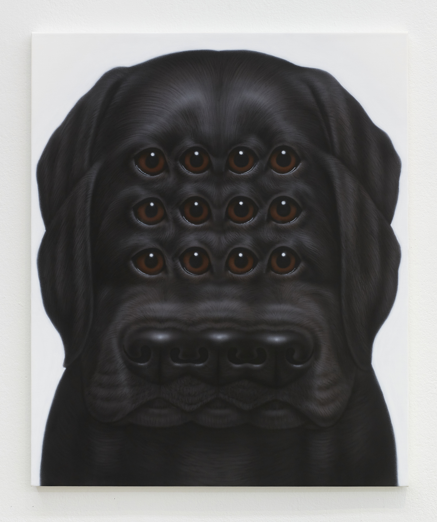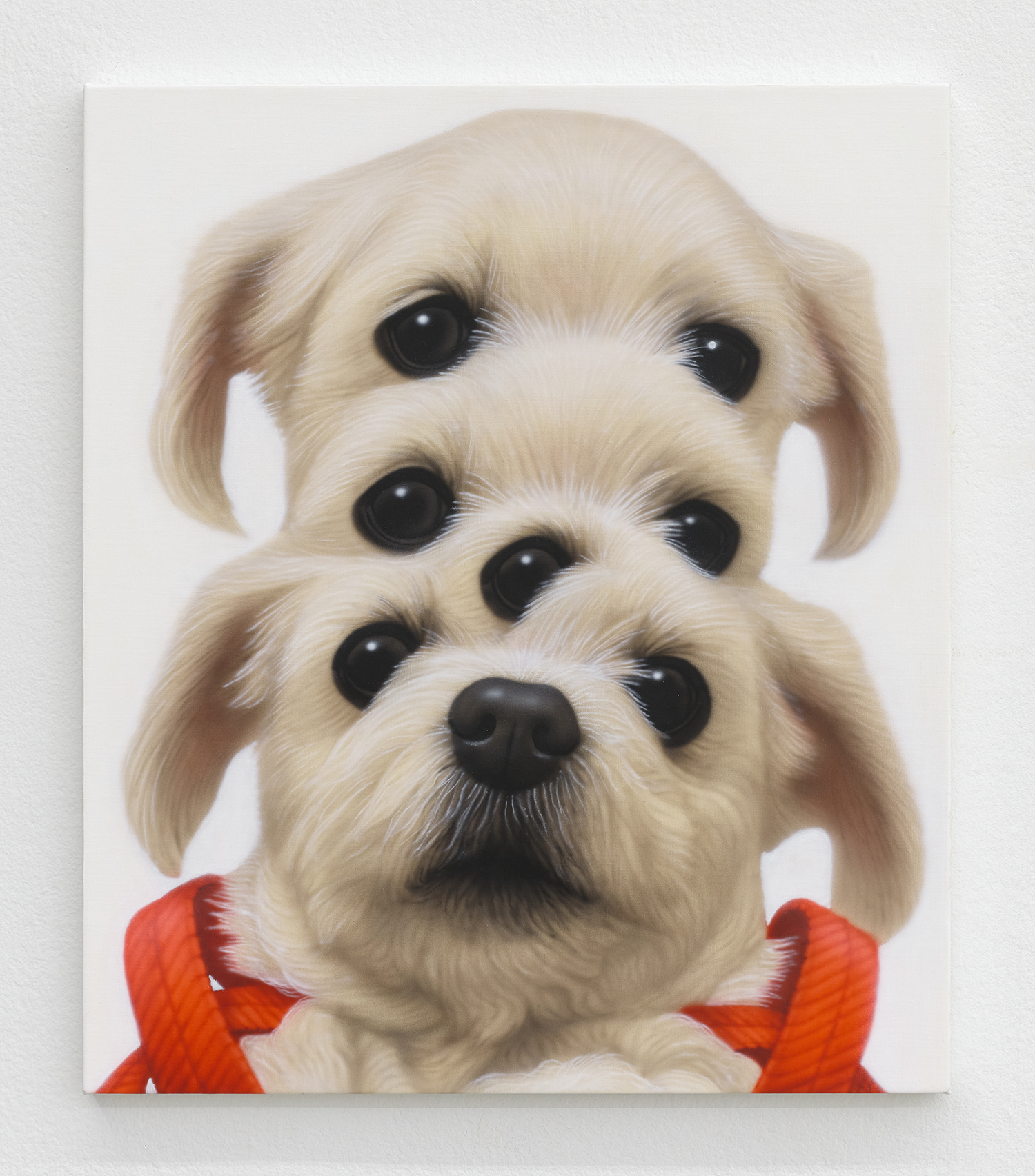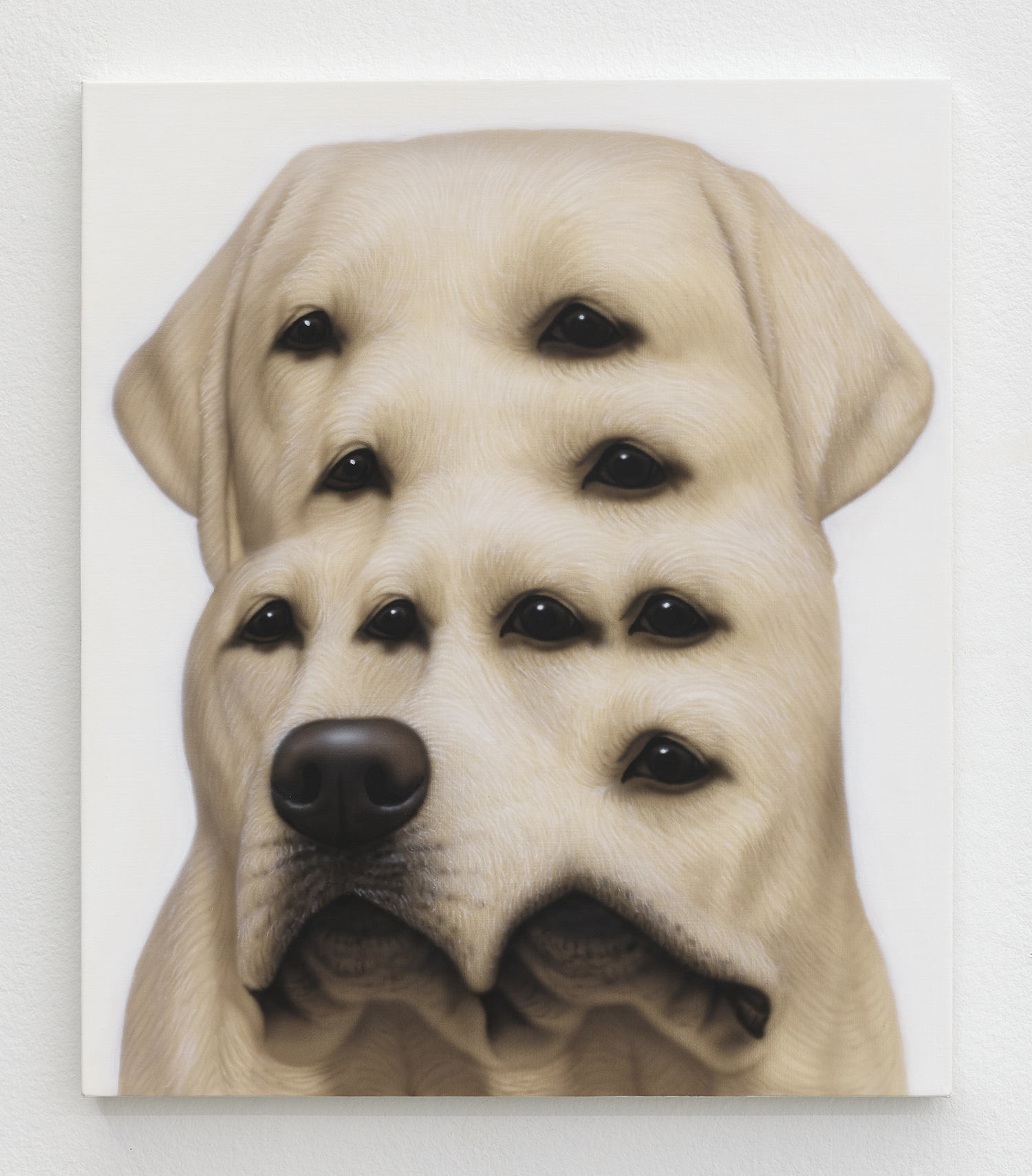 Younguk Yi, Portrait of a dog unable to hide its confusion at a guest pretending to be close with its owner, 2025, acrylic on linen, 21 x 18 inches, 53 x 46 cm.