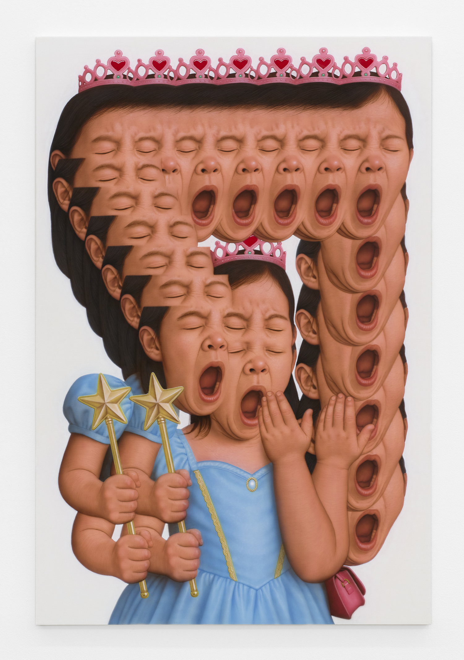 Younguk Yi, A portrait of a young girl, once turned into a fairy-tale heroine by glittering crowns, dresses, and the gaze of parents in the audience, until a single slip shattered the play and revealed the weary truth of her six short years beneath the splendor, 2025, acrylic on linen, 76 x 51 inches, 194 x 130 cm.