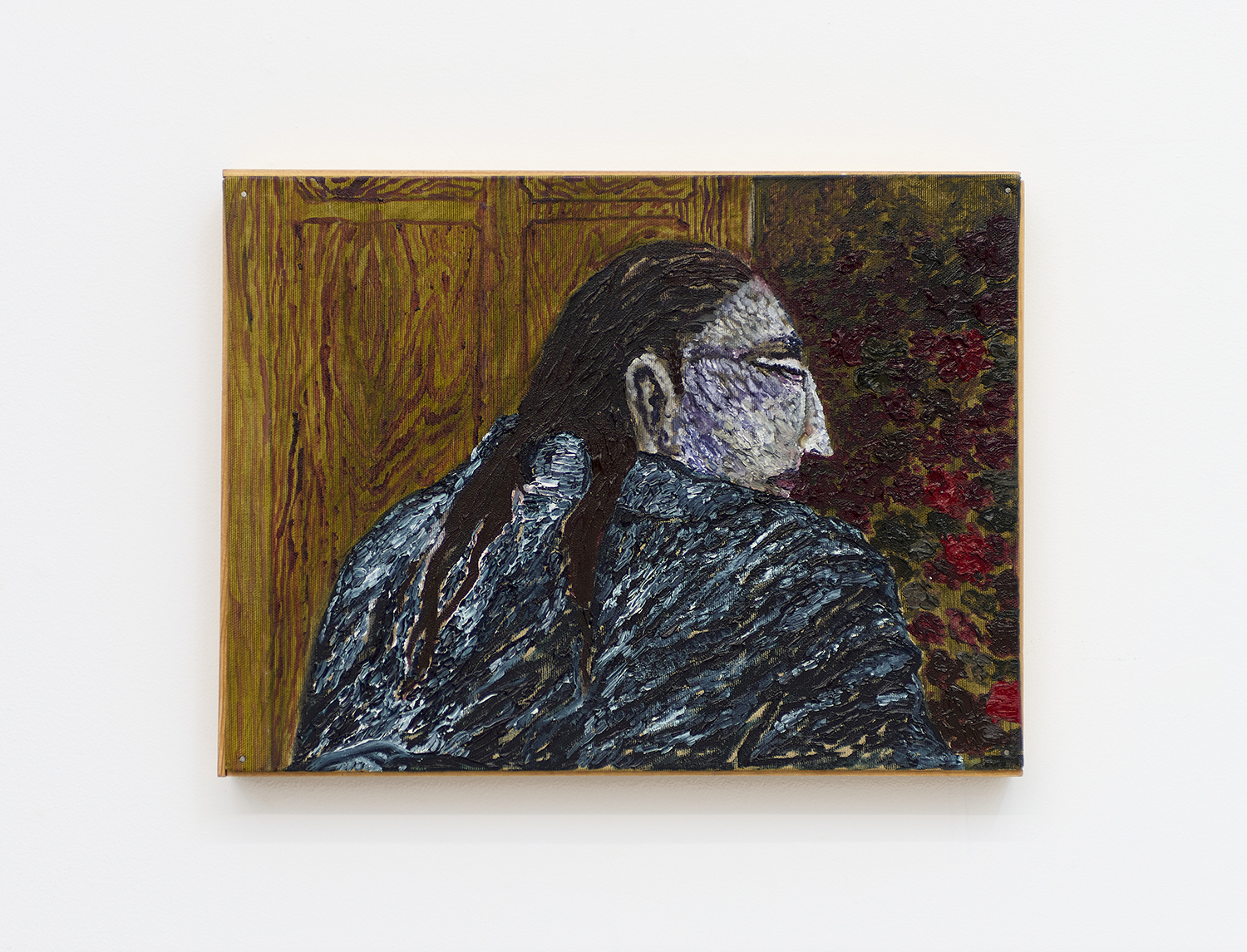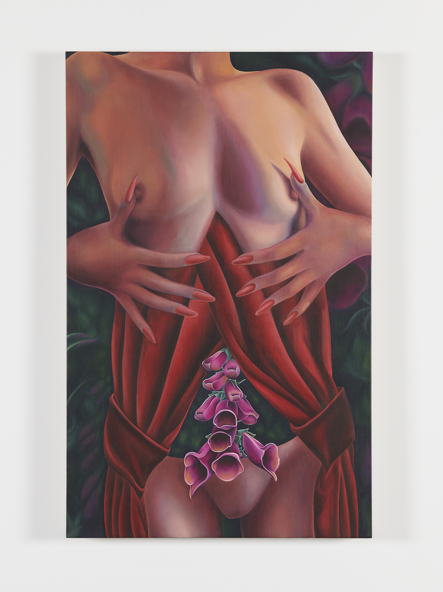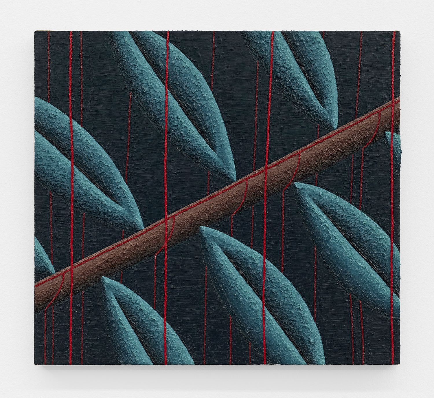 Vilte Fuller, It Will Be Red and Purple and People Will Know, 2023, oil and thread on canvas, 75 x 67 inches, 190 x 170 cm.