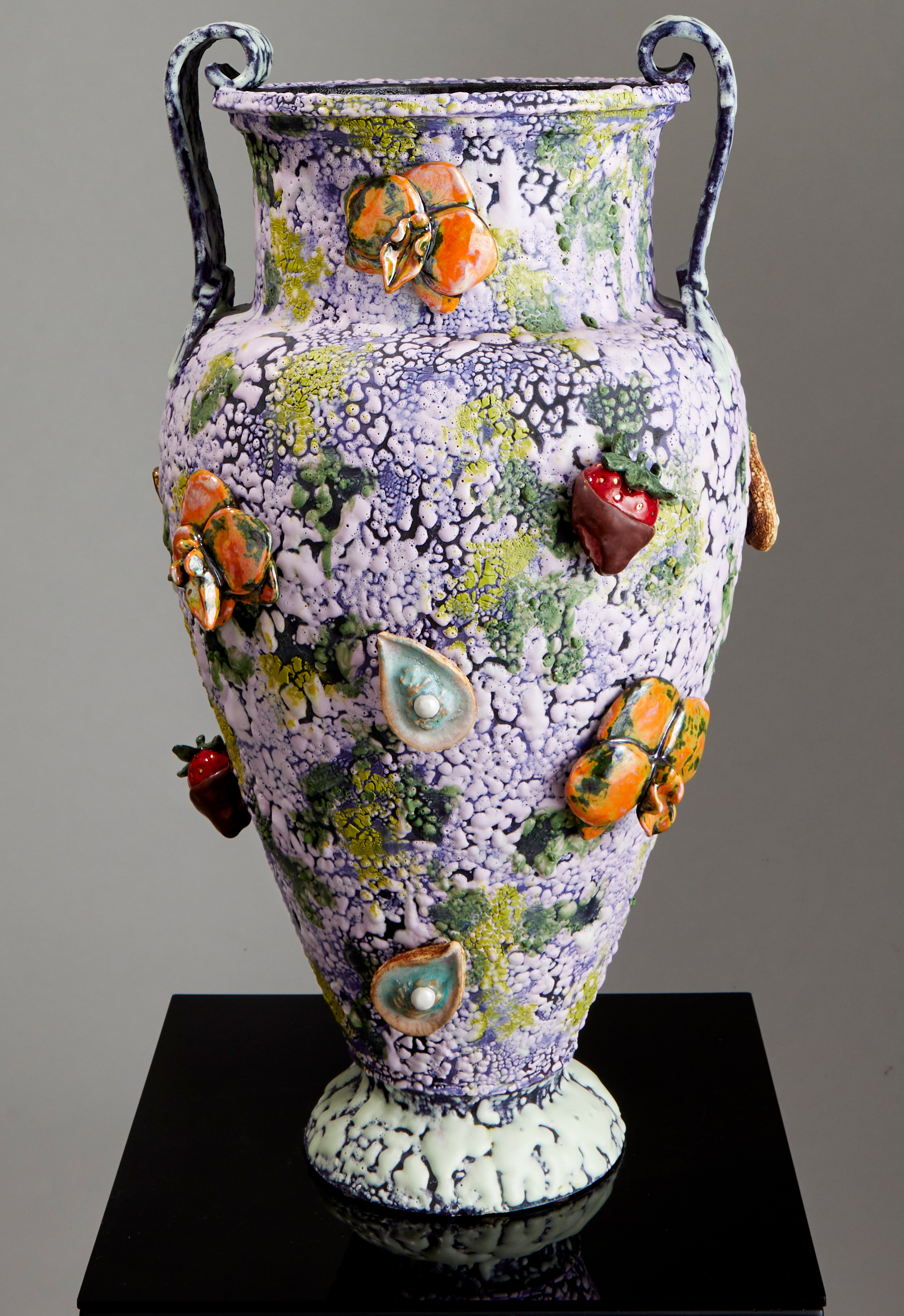 Roxanne Jackson, Aphrodisiac Amphora, 2022, ceramic, glaze, underglaze, luster, epoxy, 29 x 16 x 16 inches, 74 x 36 x 36 cm.