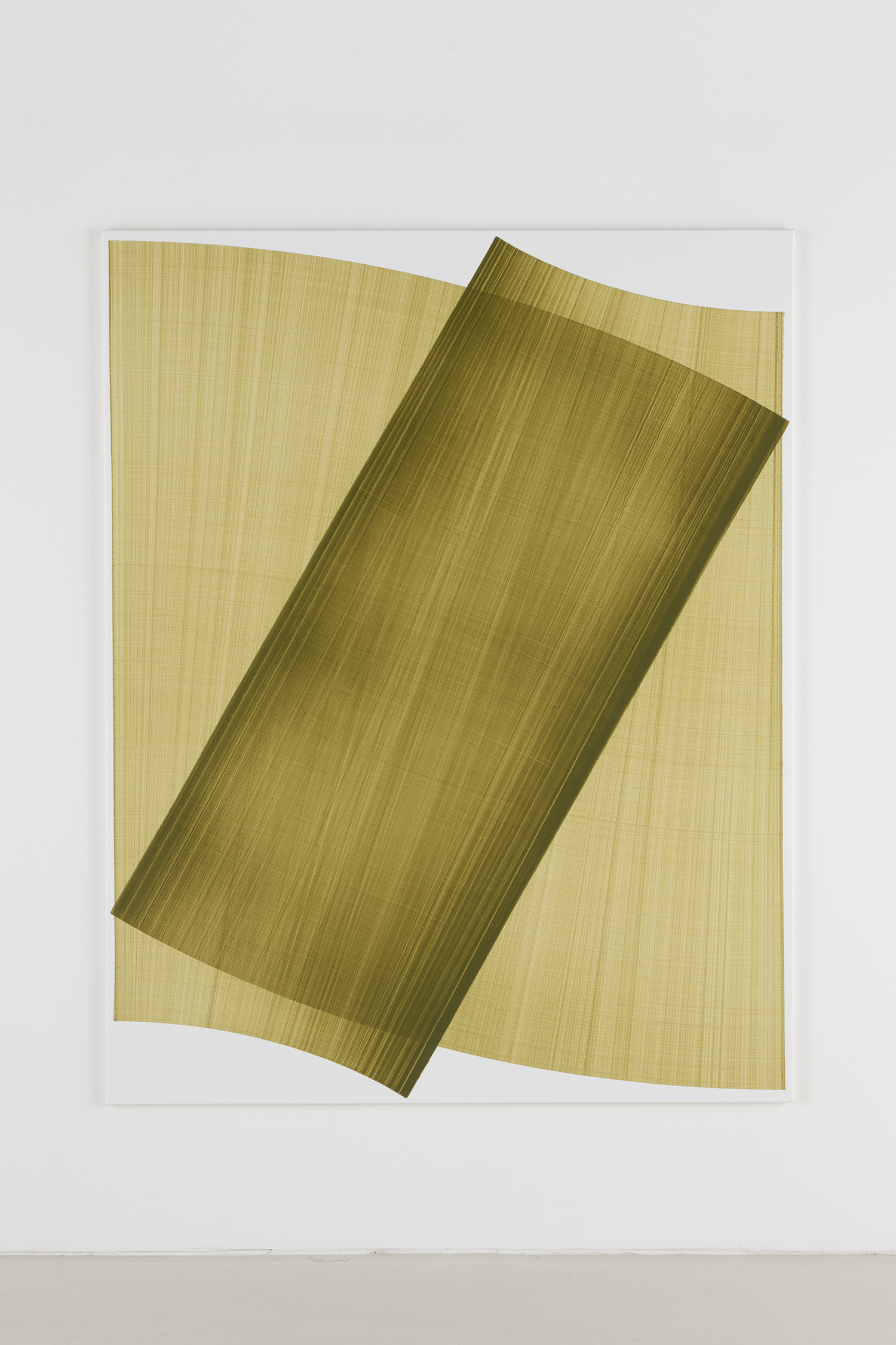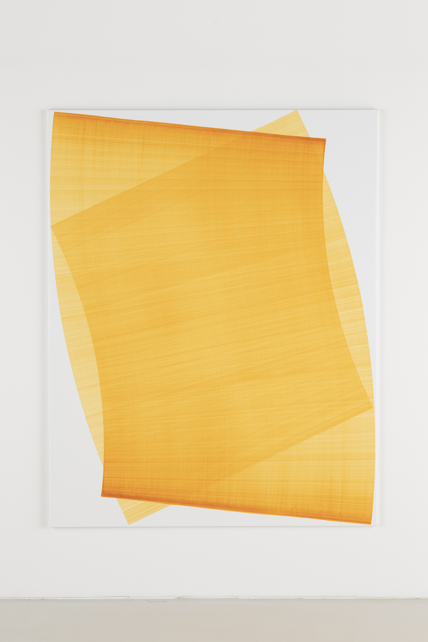 Thomas Trum, Two Yellow Fan Shaped Lines 4, 2023, acrylic on canvas, 75 x 59 inches, 190 x 150 cm.
