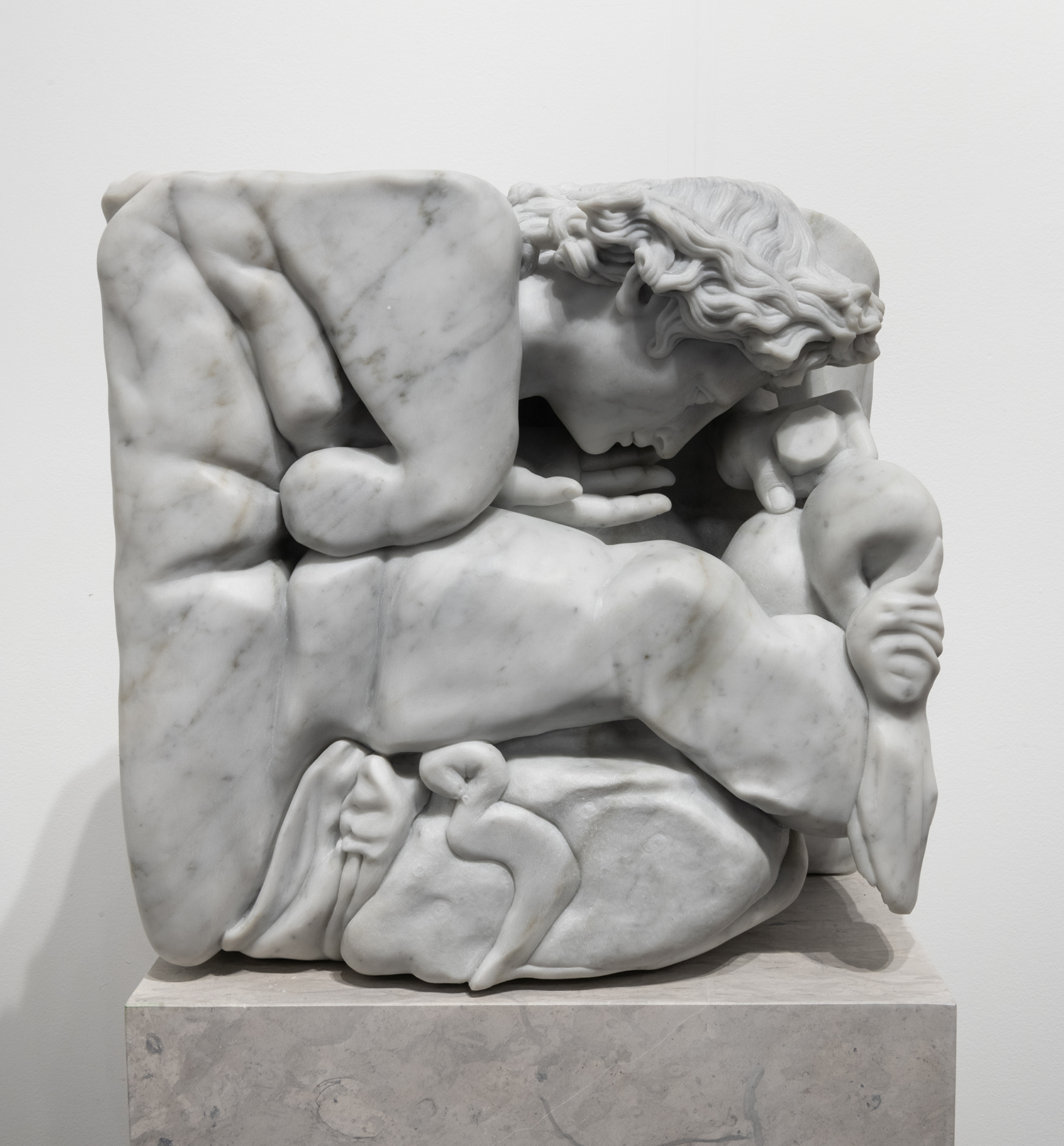 Adam Parker Smith, Apollo of Belvedere (small), 2024, white carrara marble, 11 x 16 x 15 inches, 28 x 40 x 38 cm.