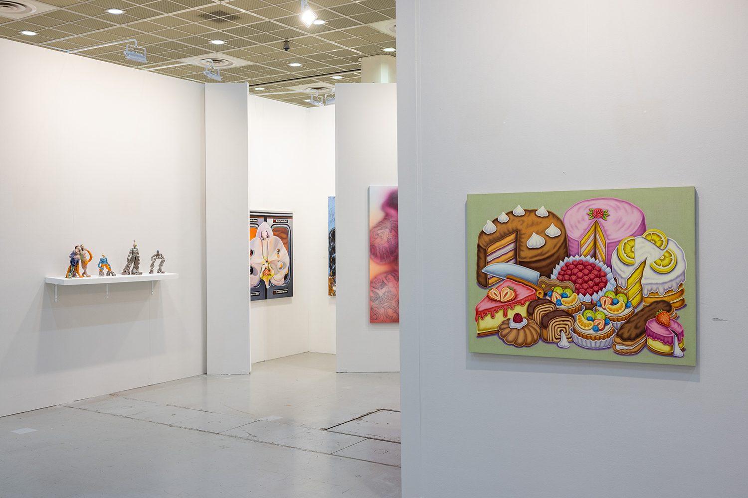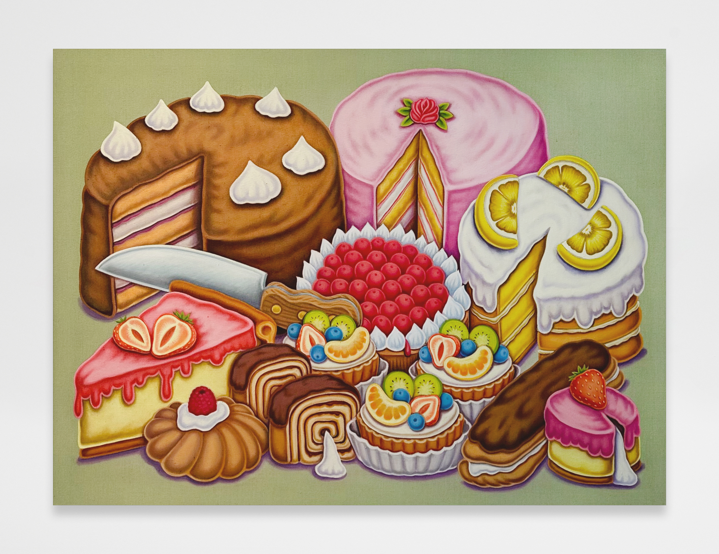 Pedro Pedro, Pastries and Cakes, 2023, Textile paint on linen, 36 x 48 inches, 91 x 122 cm.